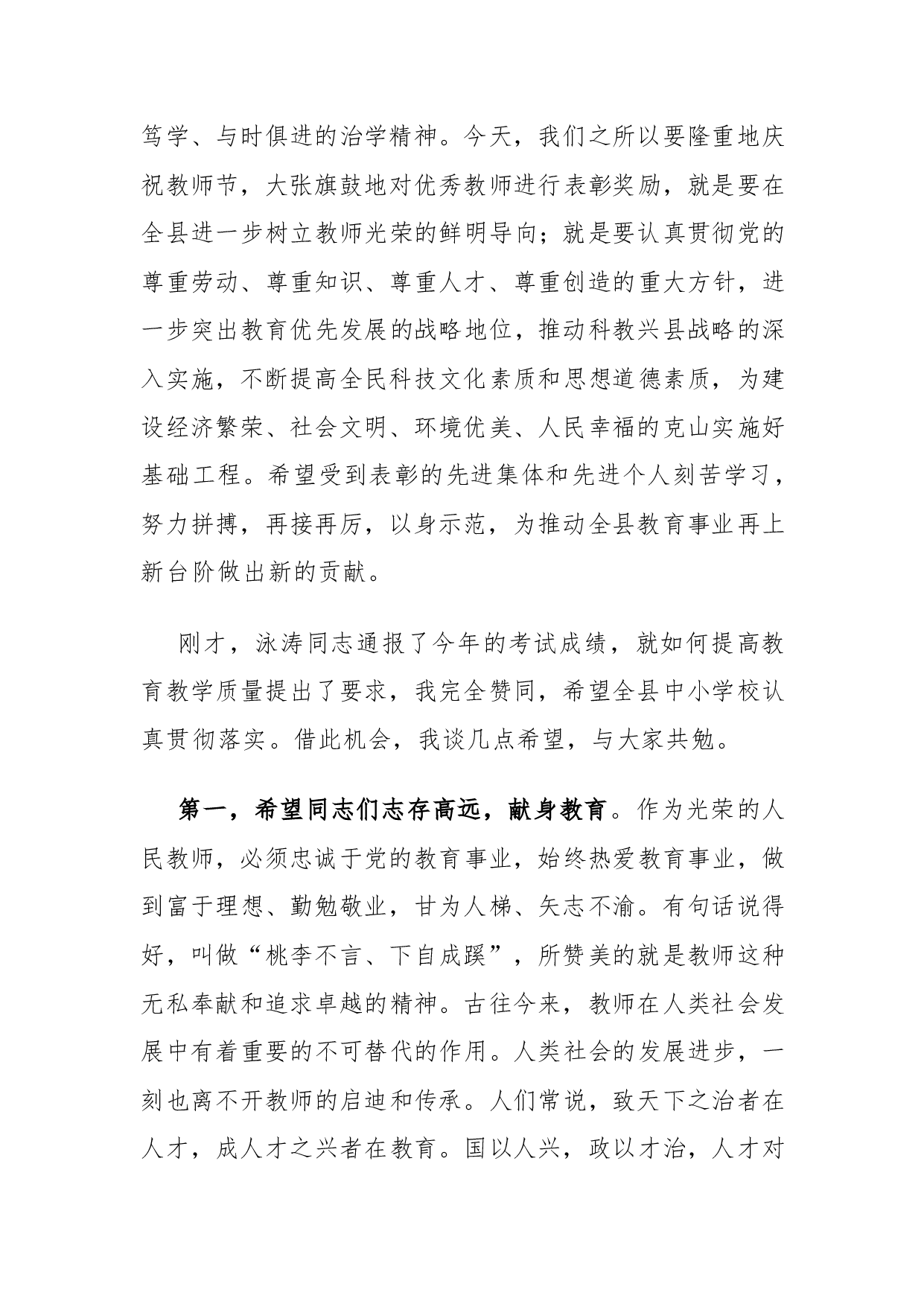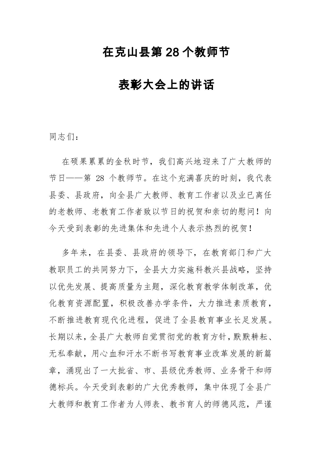 标题:副县长在克山县第28个教师节表彰大会上的讲话(精品)