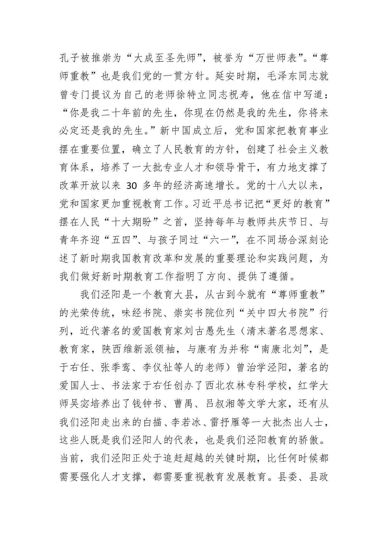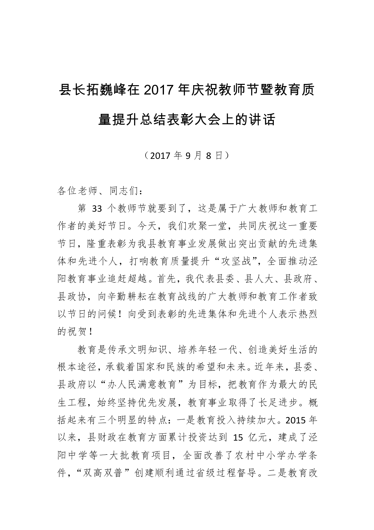 标题:县长拓巍峰:在2017年庆祝教师节暨教育质量提升总结表彰大会上的讲话