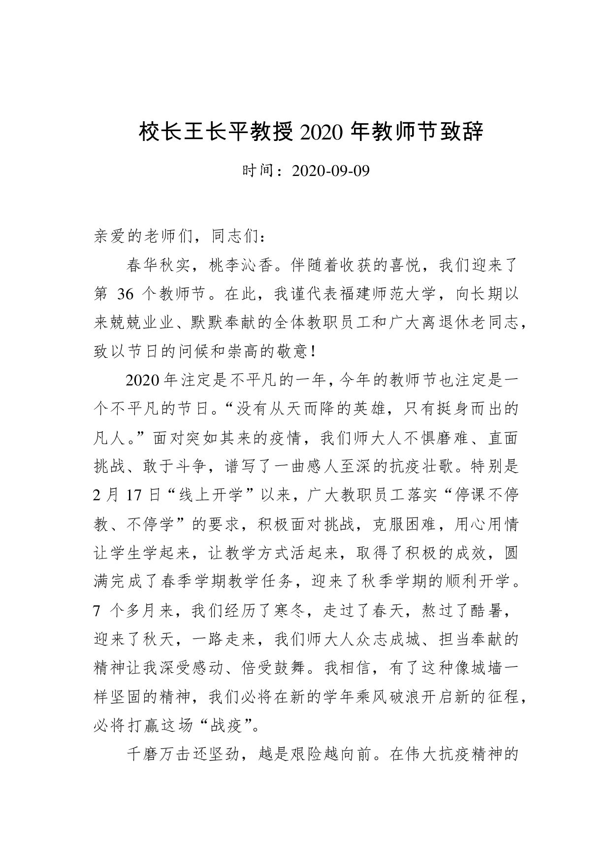 标题:校长王长平教授2020年教师节致辞