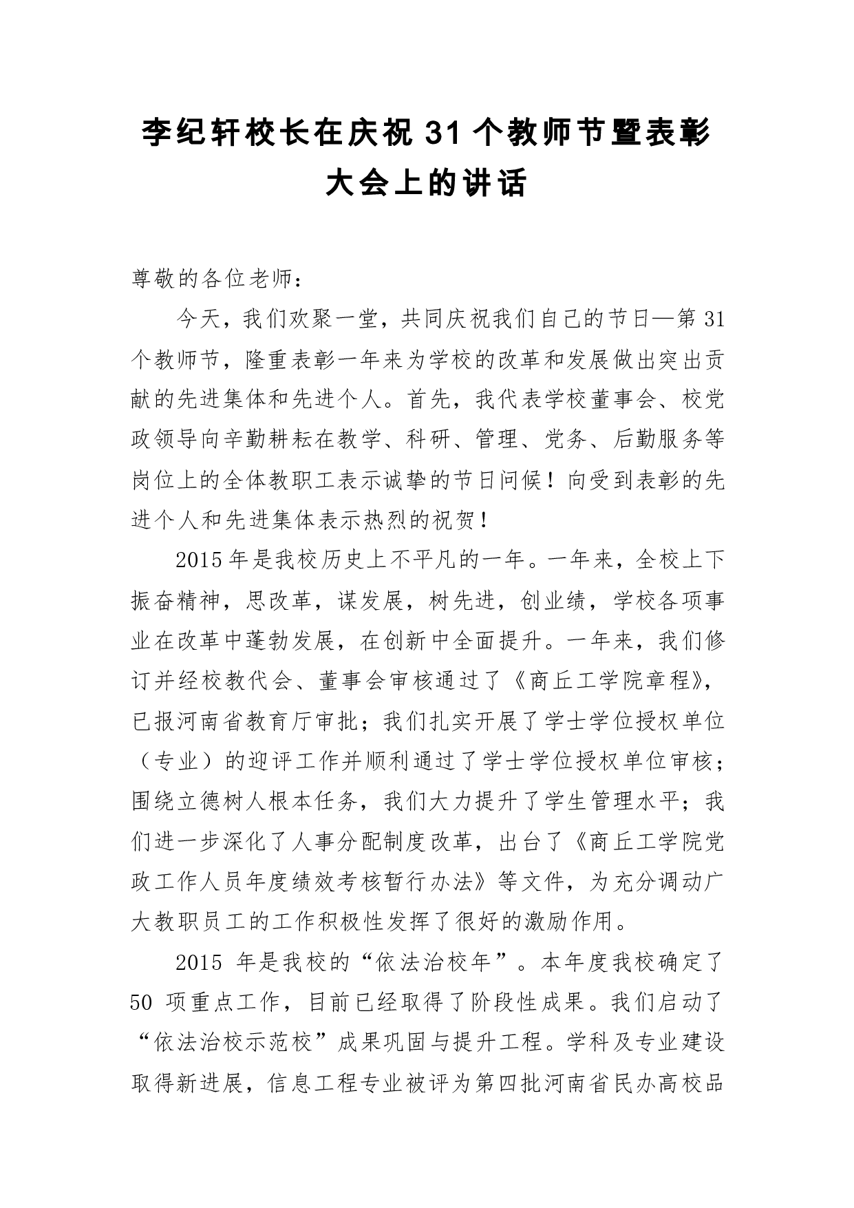 标题:教师节讲话:李纪轩校长在庆祝31个教师节暨表彰大会上的讲话