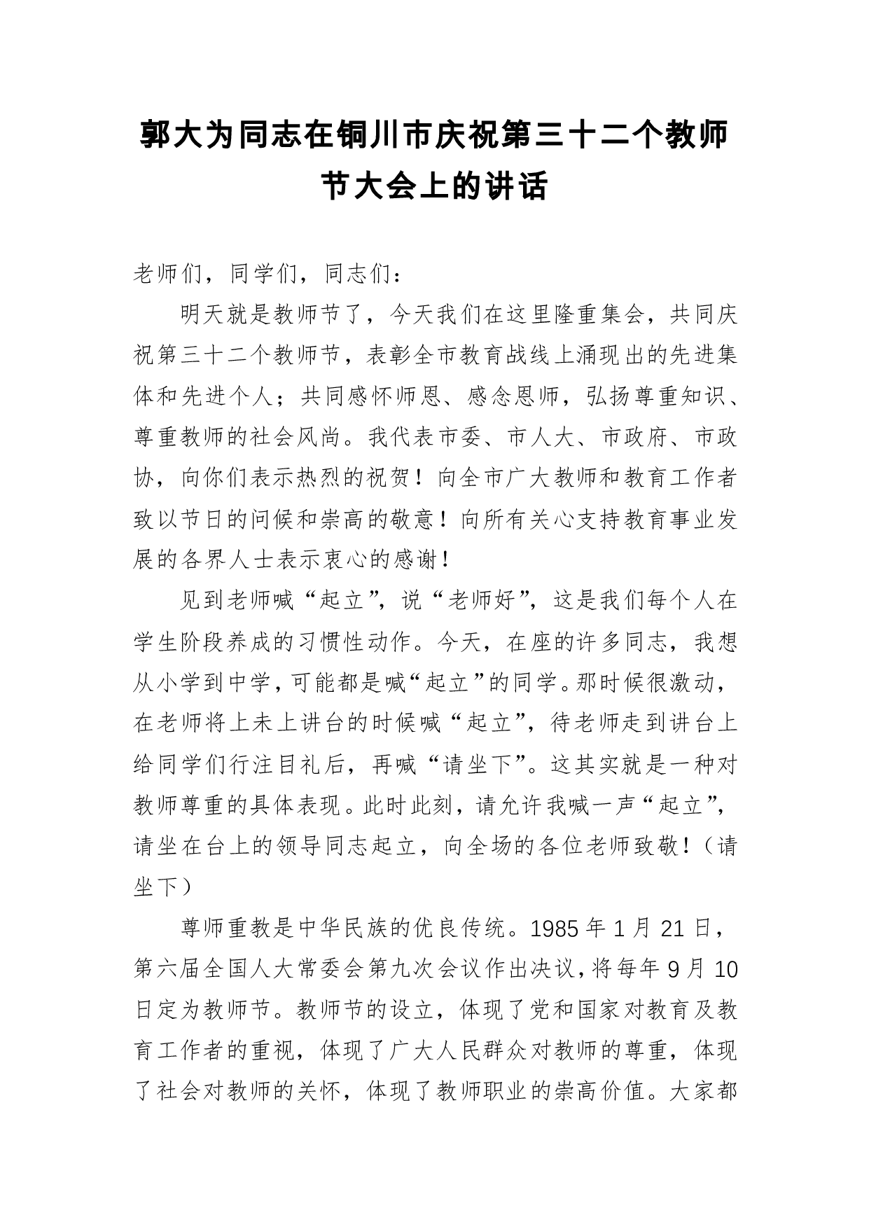 标题:郭大为同志:在铜川市庆祝第三十二个教师节大会上的讲话