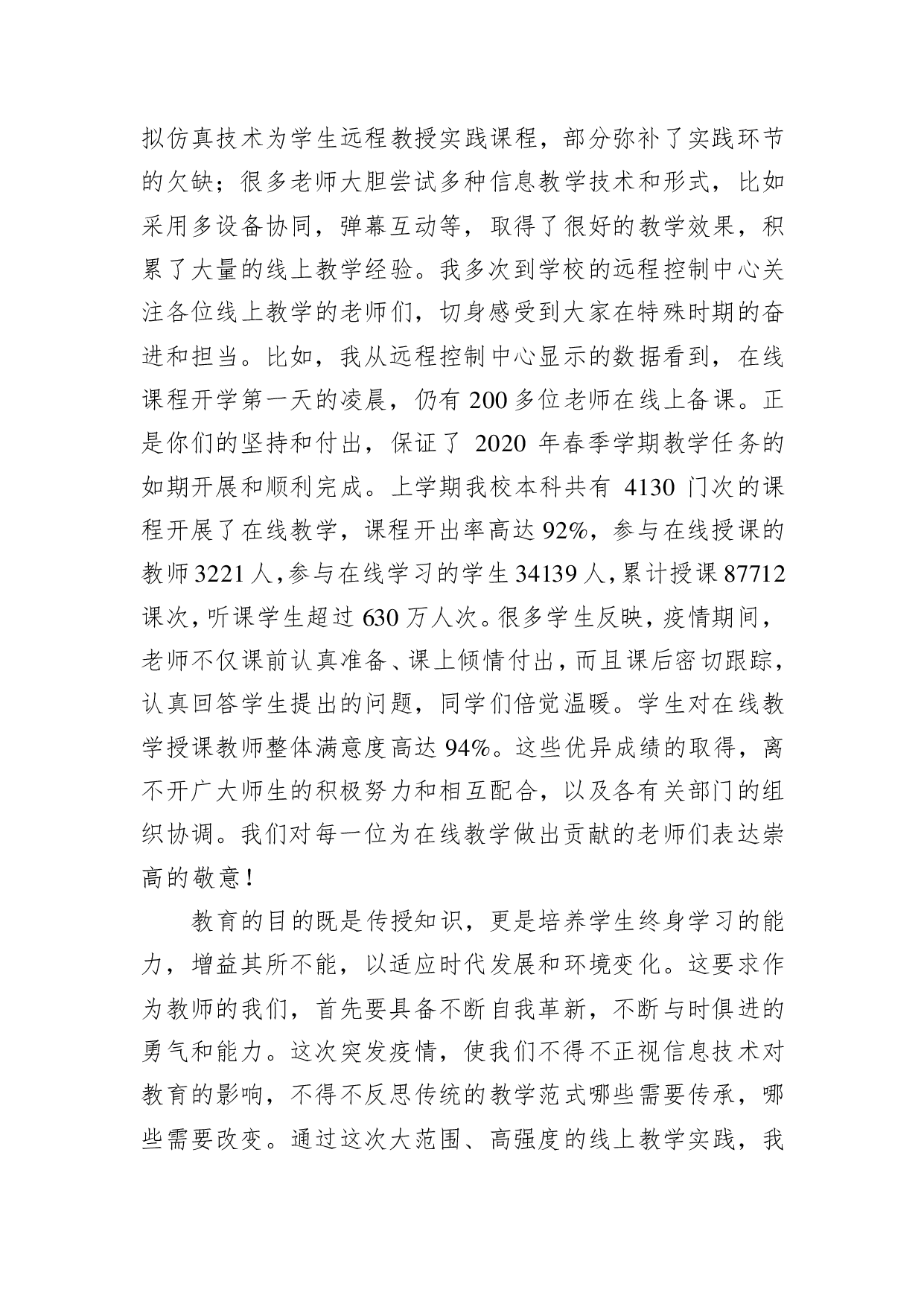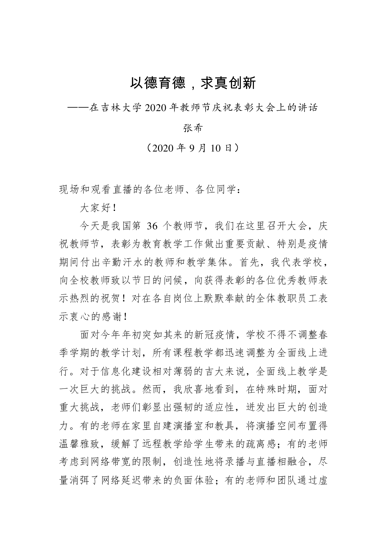 标题:张希:以德育德,求真创新——在吉林大学2020年教师节庆祝表彰大会上的讲话
