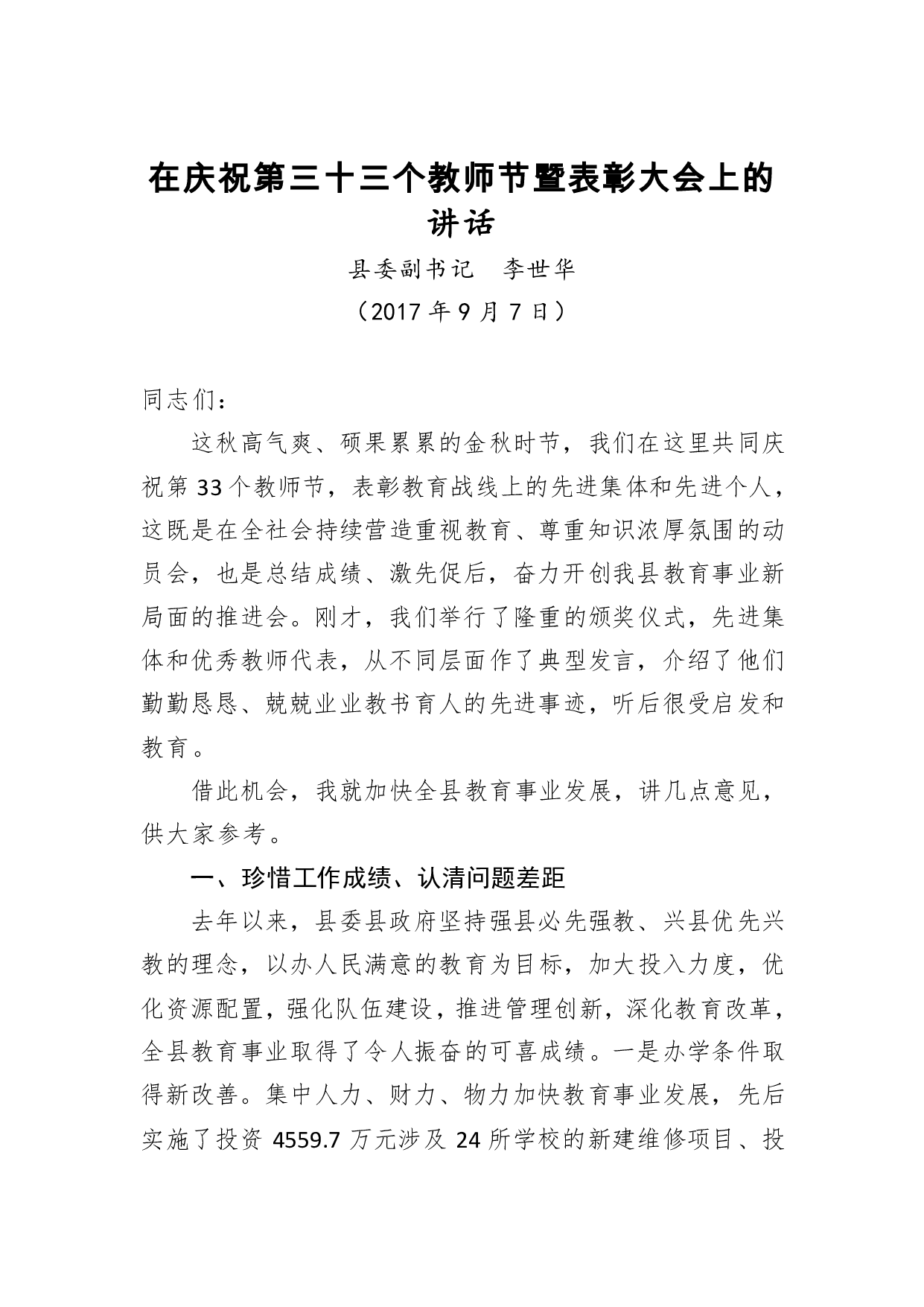 标题:李世华:在庆祝第三十三个教师节暨表彰大会上的讲话