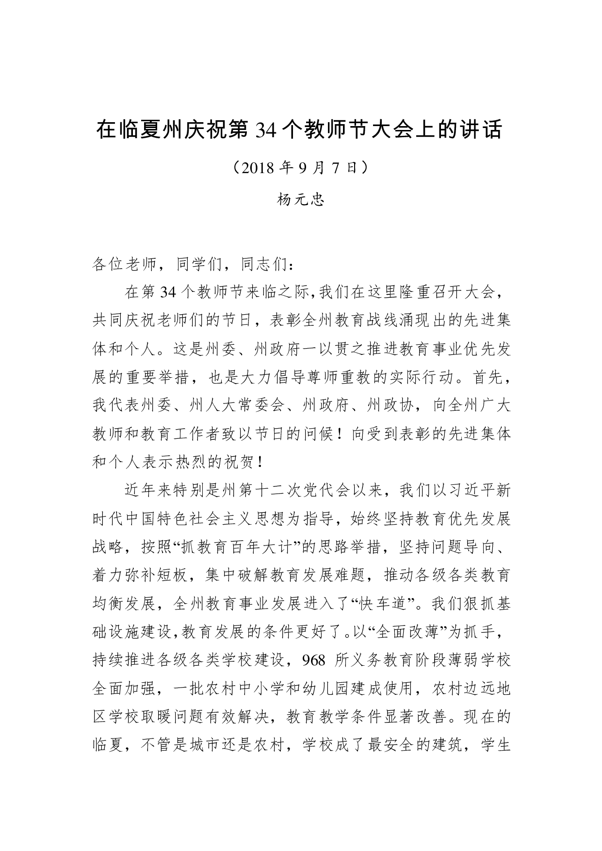 标题:杨元忠:在临夏州庆祝第34个教师节大会上的讲话
