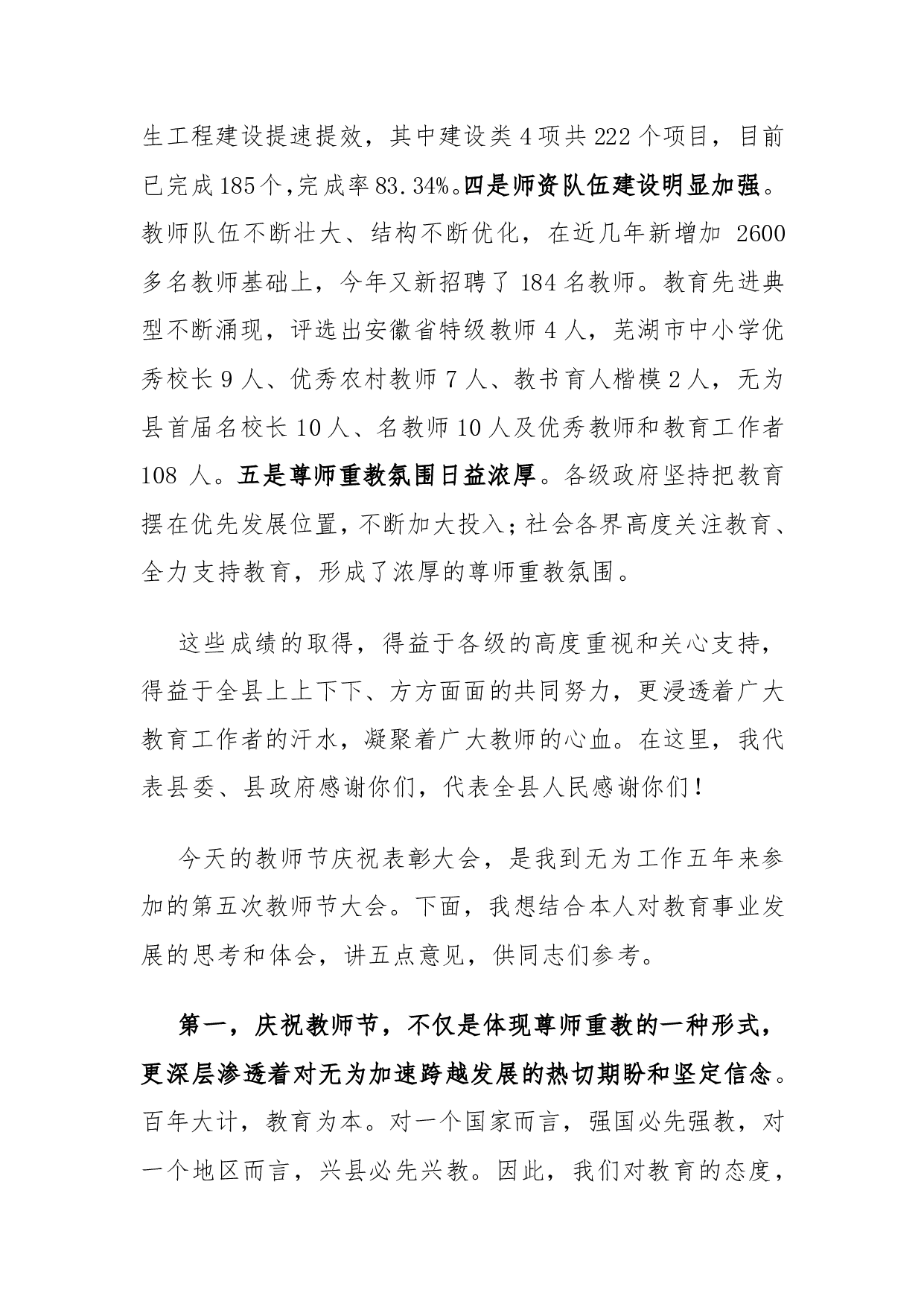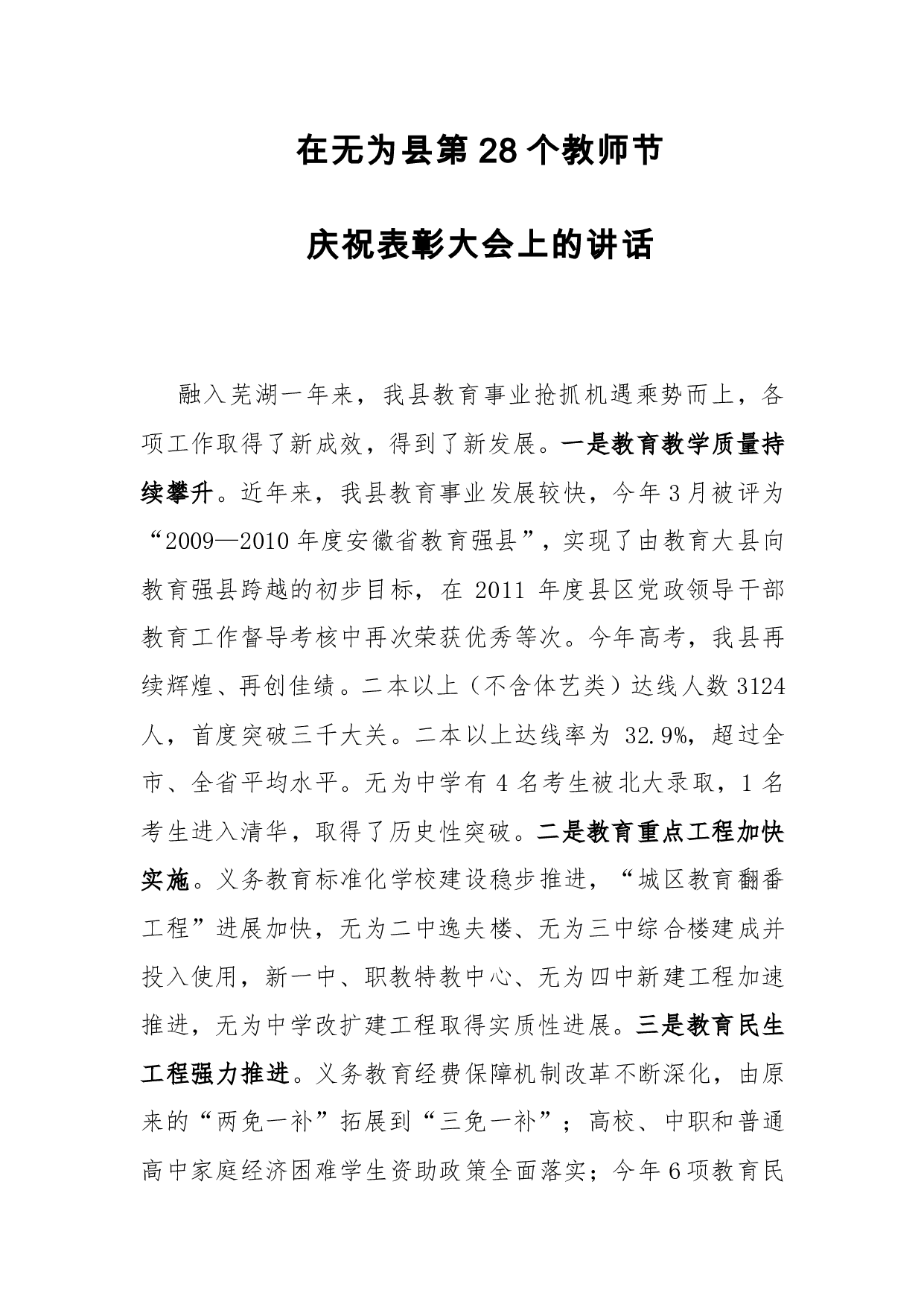 标题:县长在无为县第28个教师节庆祝表彰大会上的讲话(精品)