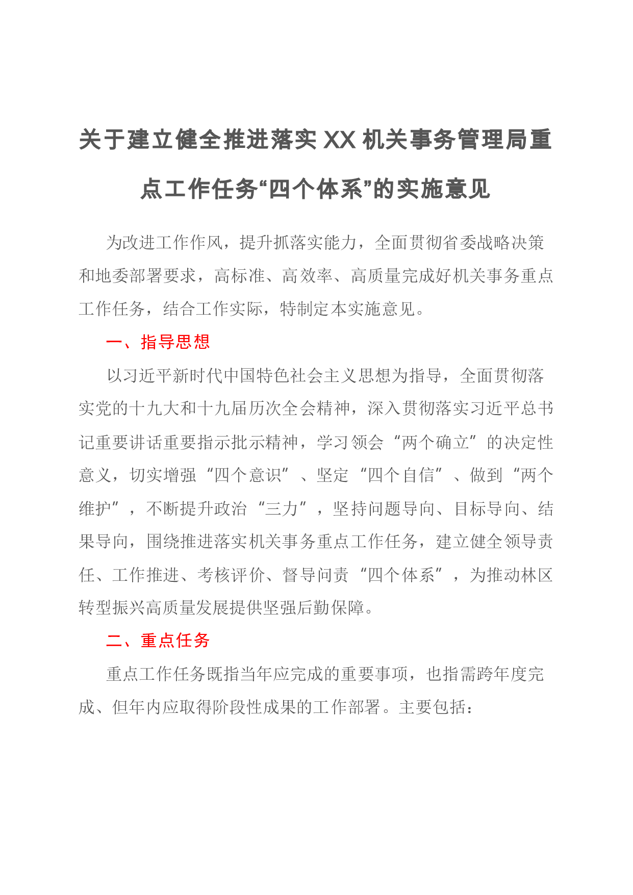 标题:关于建立健全推进落实XX机关事务管理局重点工作任务“四个体系”的实施意见