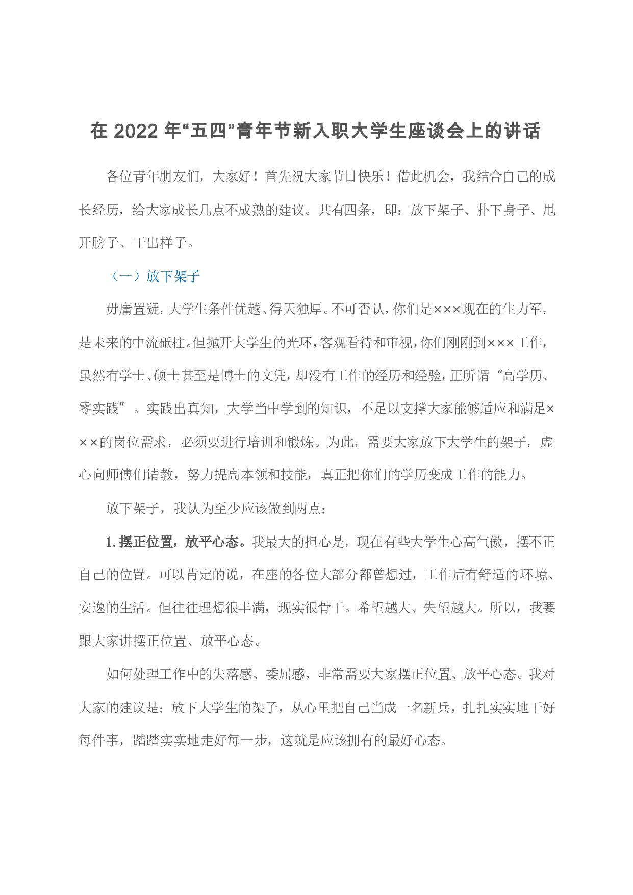 标题:在2022年“五四”青年节新入职大学生座谈会上的讲话