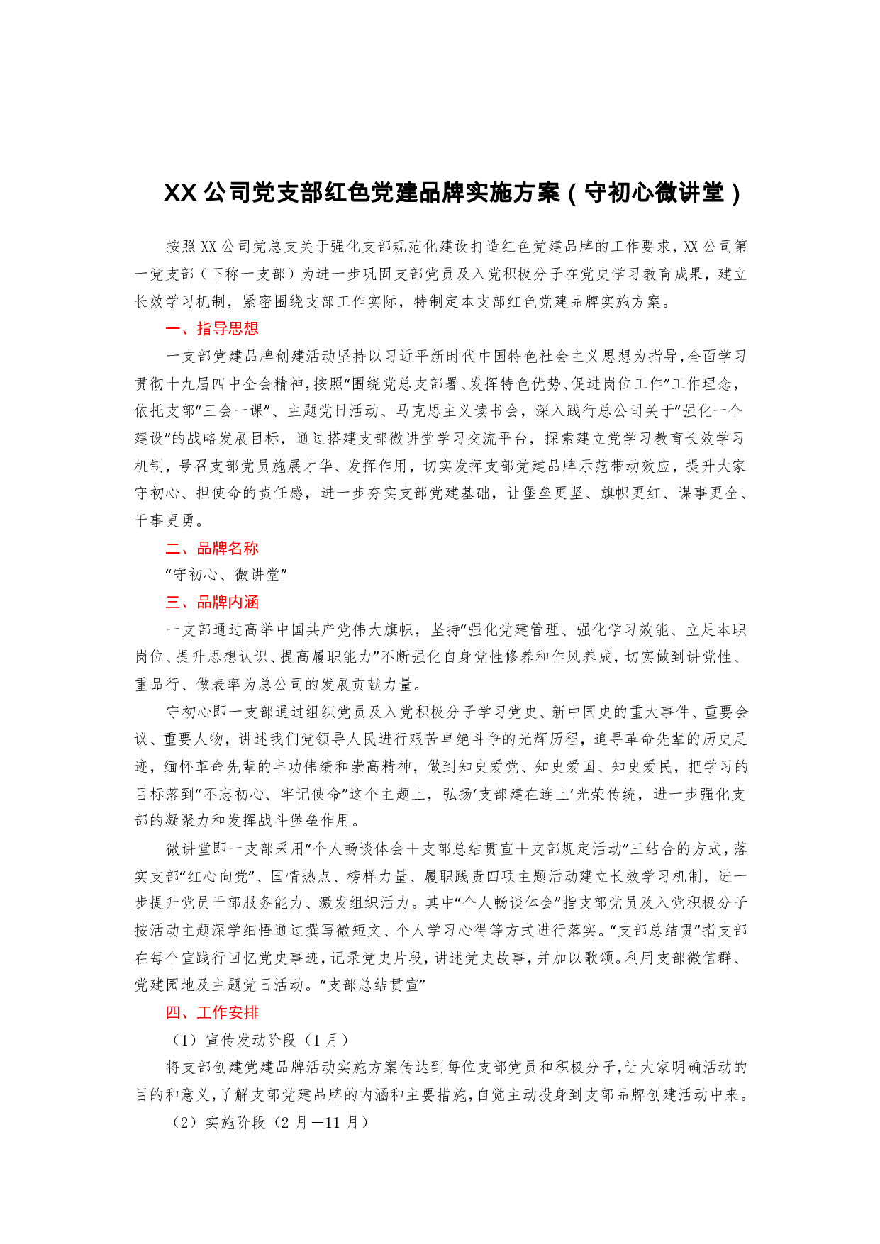 标题:XX公司党支部红色党建品牌实施方案(守初心微讲堂)