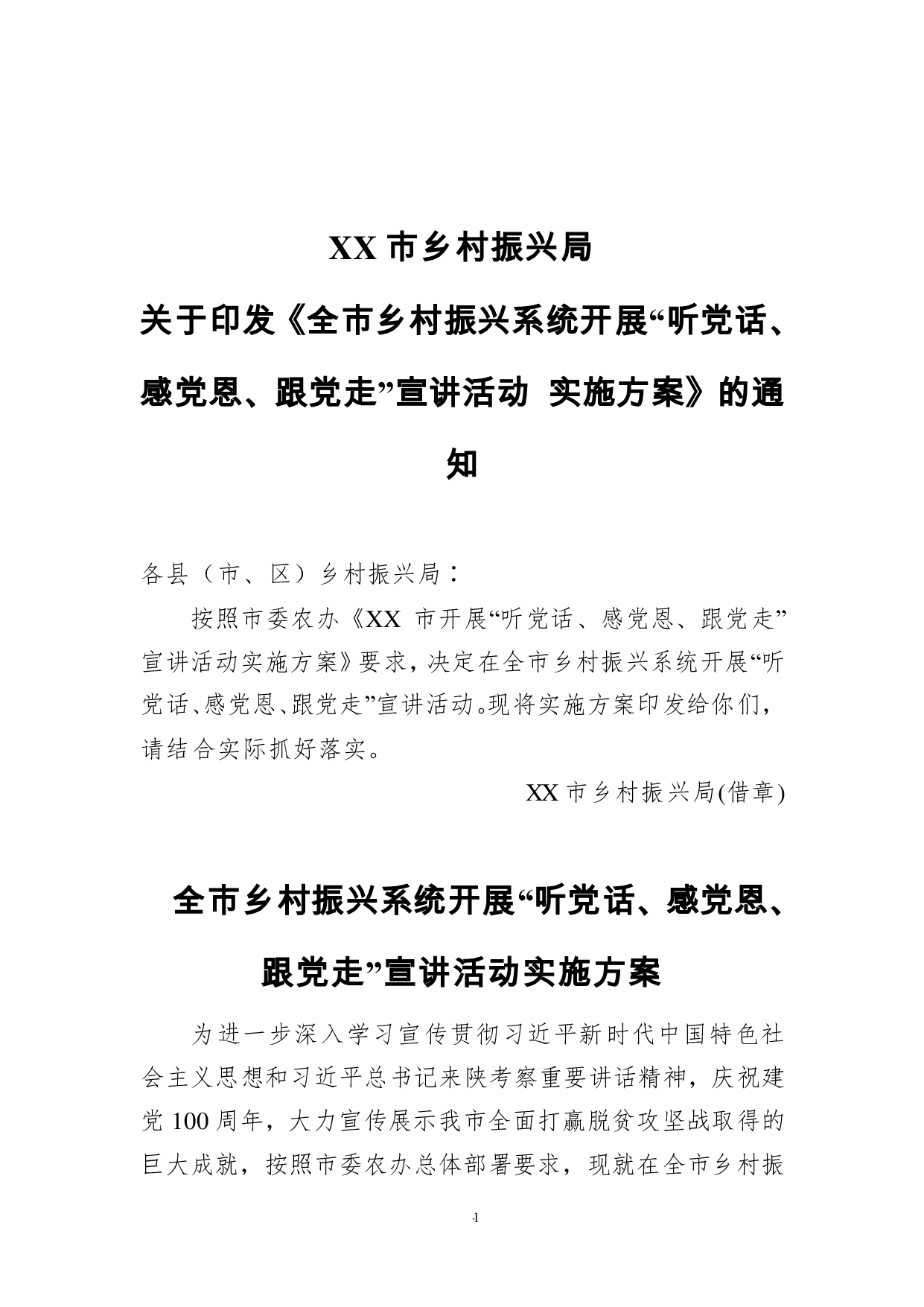 标题:XX市乡村振兴局关于印发《全市乡村振兴系统开展“听党话、感党恩、跟党走”宣讲活动实施方案》的通知