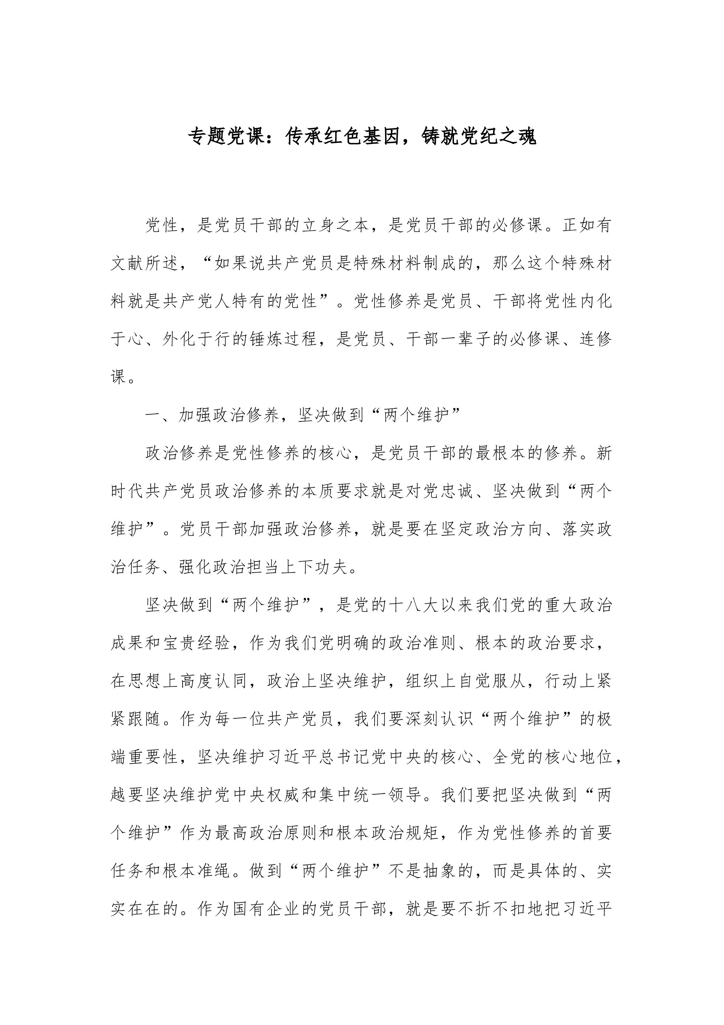 专题党课:传承红色基因,铸就党纪之魂 党性,是党员干部的立身之本,是党员干部的必修课。正如有文献所述,“如果说共产党员是特殊材料制成的,那么这个特殊材料就是共产党人特有的党性”。党性修养是党员、干部将党性内化于心、外化于行的锤炼过程,是党员、干部一辈子的必修课、连修课。 一、加强政治修养,坚决做到“两个维护” 政治修养是党性修养的核心,是党员干部的最根本的修养。新时代共产党员政治修养的本质要求就是对党忠诚、坚决做到“两个维护”。党员干部加强政治修养,就是要在坚定政治方向、落实政治任务、强化政治担当上下功夫。 坚决做到“两个维护”,是党的十八大以来我们党的重大政治成果和宝贵经验,作为我们...