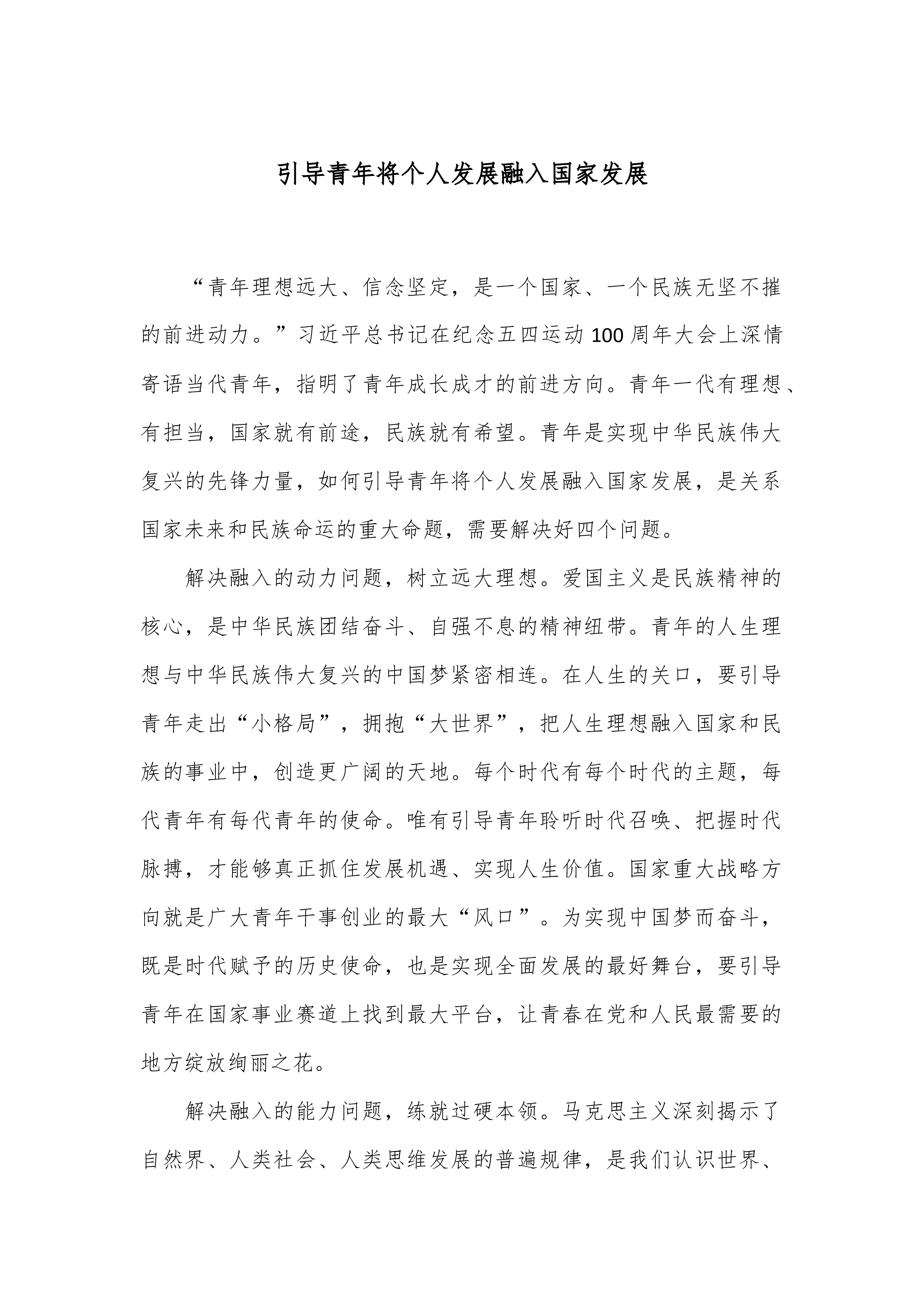 引导青年将个人发展融入国家发展 “青年理想远大、信念坚定,是一个国家、一个民族无坚不摧的前进动力。”习近平总书记在纪念五四运动100周年大会上深情寄语当代青年,指明了青年成长成才的前进方向。青年一代有理想、有担当,国家就有前途,民族就有希望。青年是实现中华民族伟大复兴的先锋力量,如何引导青年将个人发展融入国家发展,是关系国家未来和民族命运的重大命题,需要解决好四个问题。 解决融入的动力问题,树立远大理想。爱国主义是民族精神的核心,是中华民族团结奋斗、自强不息的精神纽带。青年的人生理想与中华民族伟大复兴的中国梦紧密相连。在人生的关口,要引导青年走出“小格局”,拥抱“大世界”,把人生理想融入国...