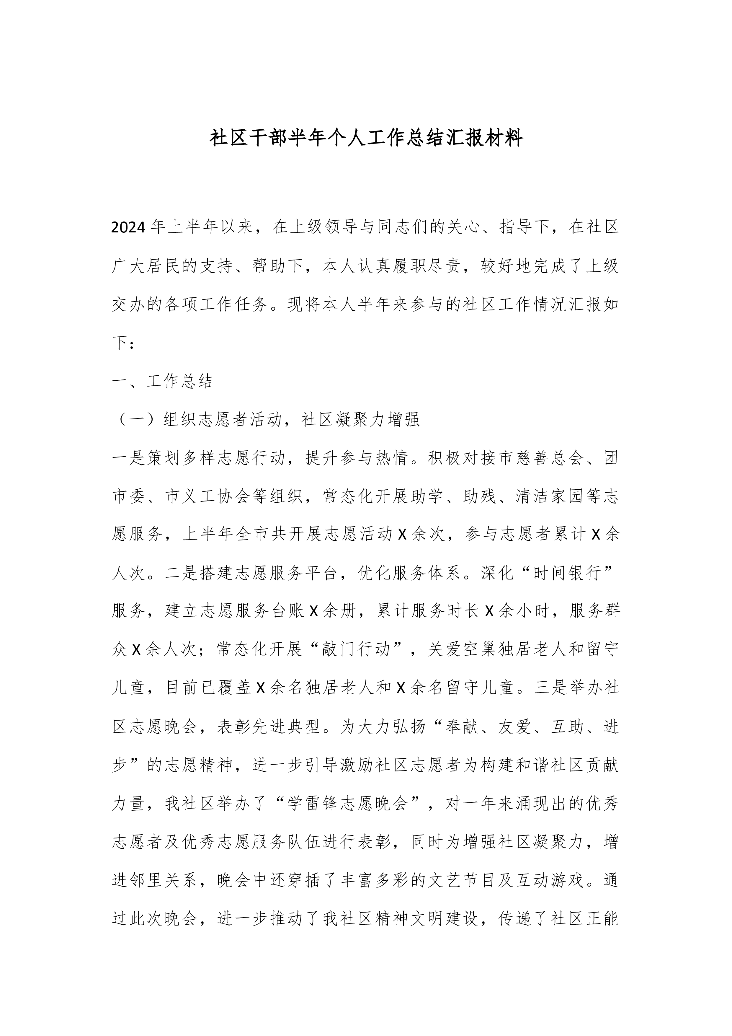社区干部半年个人工作总结汇报材料2024年上半年以来,在上级领导与同志们的关心、指导下,在社区广大居民的支持、帮助下,本人认真履职尽责,较好地完成了上级交办的各项工作任务。现将本人半年来参与的社区工作情况汇报如下:一、工作总结(一)组织志愿者活动,社区凝聚力增强一是策划多样志愿行动,提升参与热情。积极对接市慈善总会、团市委、市义工协会等组织,常态化开展助学、助残、清洁家园等志愿服务,上半年全市共开展志愿活动X余次,参与志愿者累计X余人次。二是搭建志愿服务平台,优化服务体系。深化“时间银行”服务,建立志愿服务台账X余册,累计服务时长X余小时,服务群众X余人次;常态化开展“敲门行动”,关爱空巢独居...