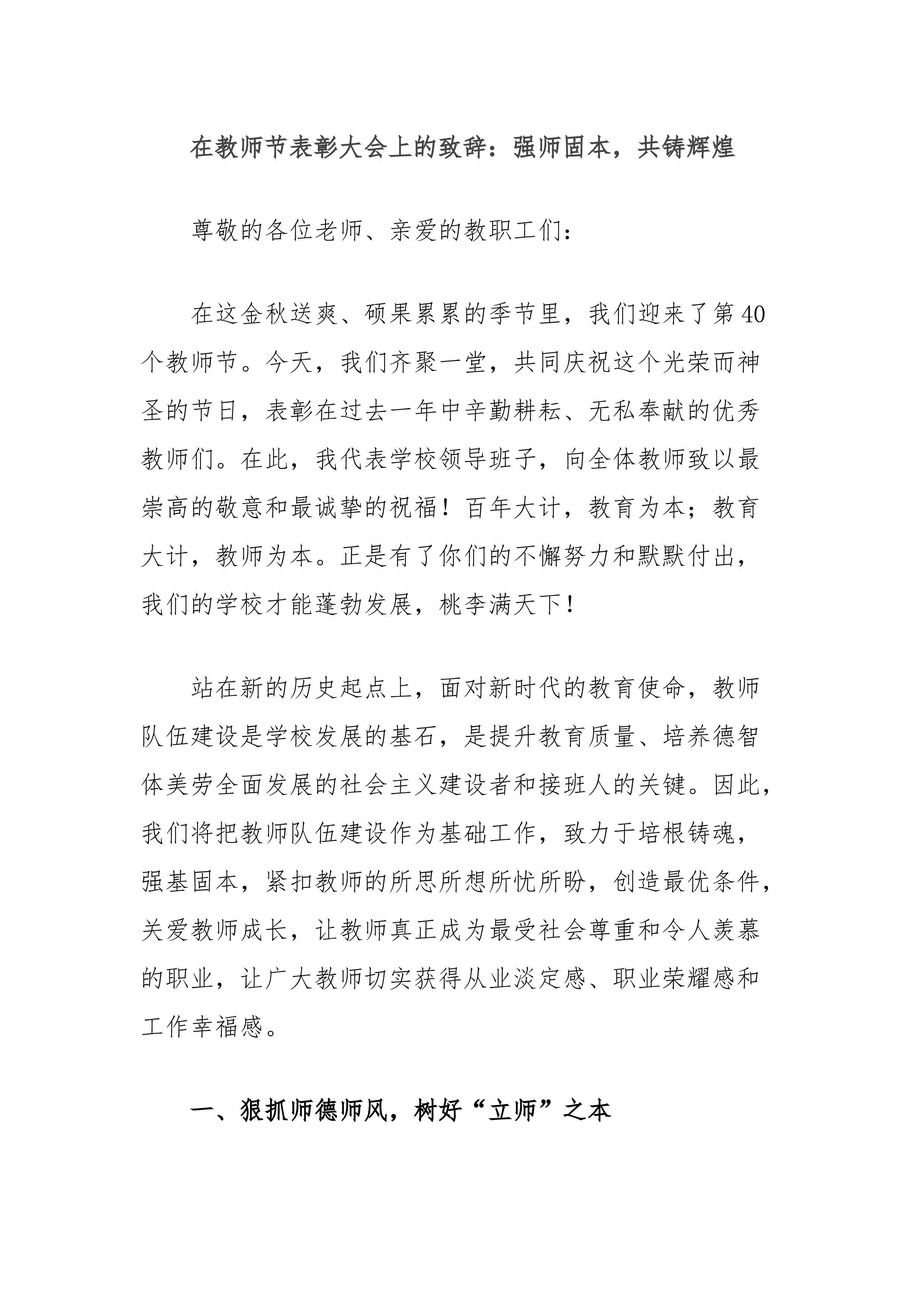 在教师节表彰大会上的致辞:强师固本,共铸辉煌尊敬的各位老师、亲爱的教职工们:在这金秋送爽、硕果累累的季节里,我们迎来了第40个教师节。今天,我们齐聚一堂,共同庆祝这个光荣而神圣的节日,表彰在过去一年中辛勤耕耘、无私奉献的优秀教师们。在此,我代表学校领导班子,向全体教师致以最崇高的敬意和最诚挚的祝福!百年大计,教育为本;教育大计,教师为本。正是有了你们的不懈努力和默默付出,我们的学校才能蓬勃发展,桃李满天下!站在新的历史起点上,面对新时代的教育使命,教师队伍建设是学校发展的基石,是提升教育质量、培养德智体美劳全面发展的社会主义建设者和接班人的关键。因此,我们将把教师队伍建设作为基础工作,致力于培...