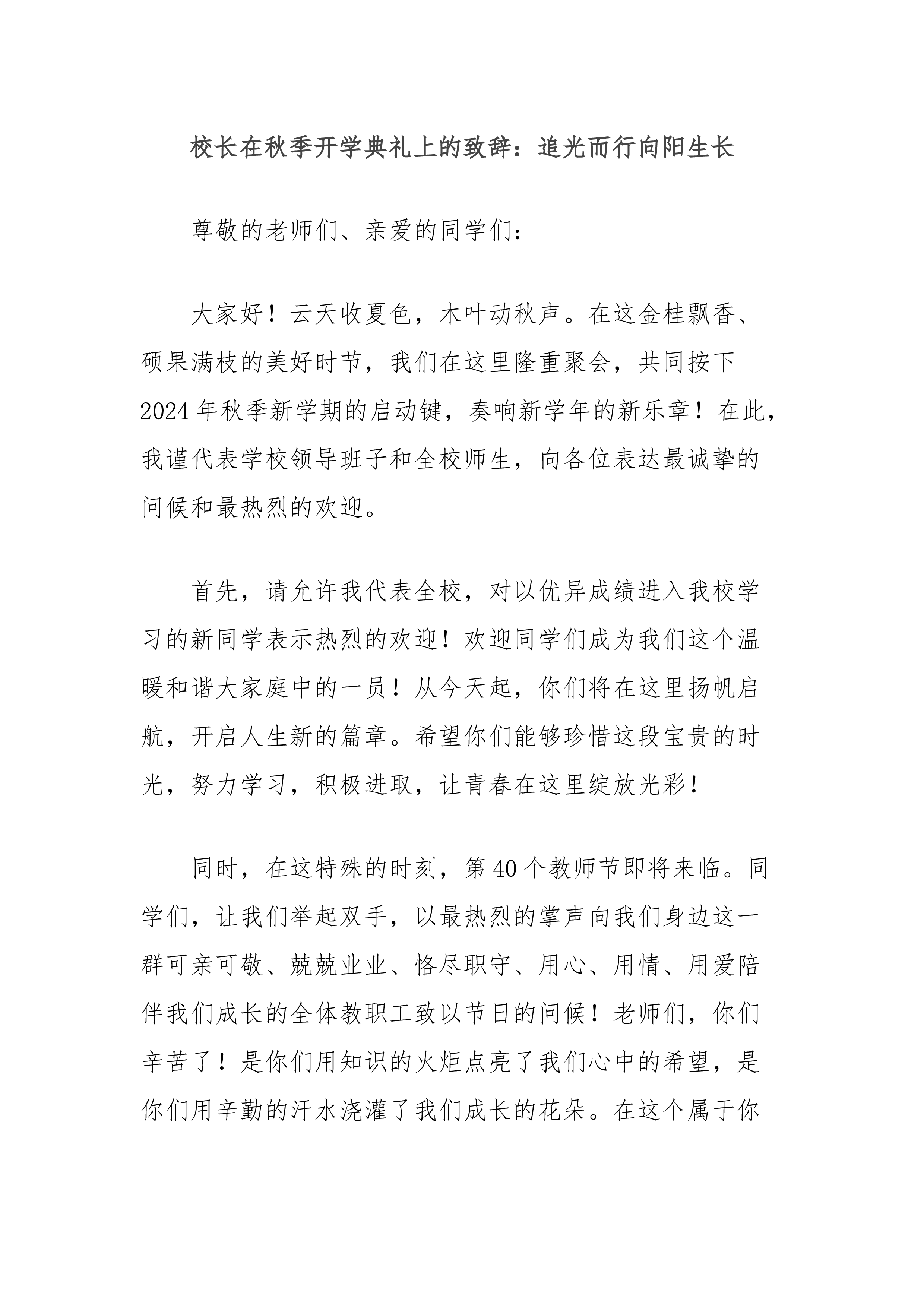 校长在秋季开学典礼上的致辞:追光而行向阳生长尊敬的老师们、亲爱的同学们:大家好!云天收夏色,木叶动秋声。在这金桂飘香、硕果满枝的美好时节,我们在这里隆重聚会,共同按下2024年秋季新学期的启动键,奏响新学年的新乐章!在此,我谨代表学校领导班子和全校师生,向各位表达最诚挚的问候和最热烈的欢迎。首先,请允许我代表全校,对以优异成绩进入我校学习的新同学表示热烈的欢迎!欢迎同学们成为我们这个温暖和谐大家庭中的一员!从今天起,你们将在这里扬帆启航,开启人生新的篇章。希望你们能够珍惜这段宝贵的时光,努力学习,积极进取,让青春在这里绽放光彩!同时,在这特殊的时刻,第40个教师节即将来临。同学们,让我们举起双...