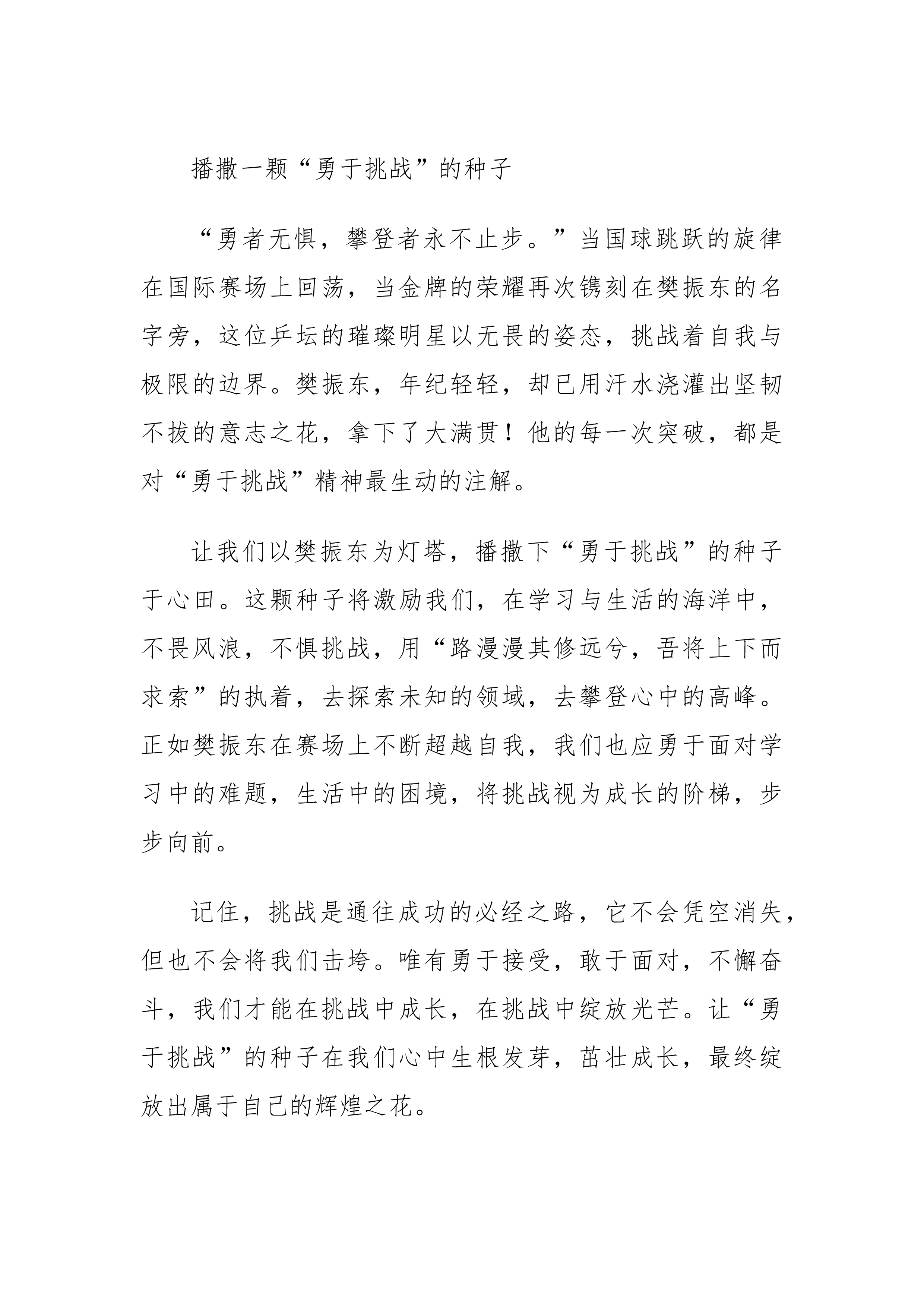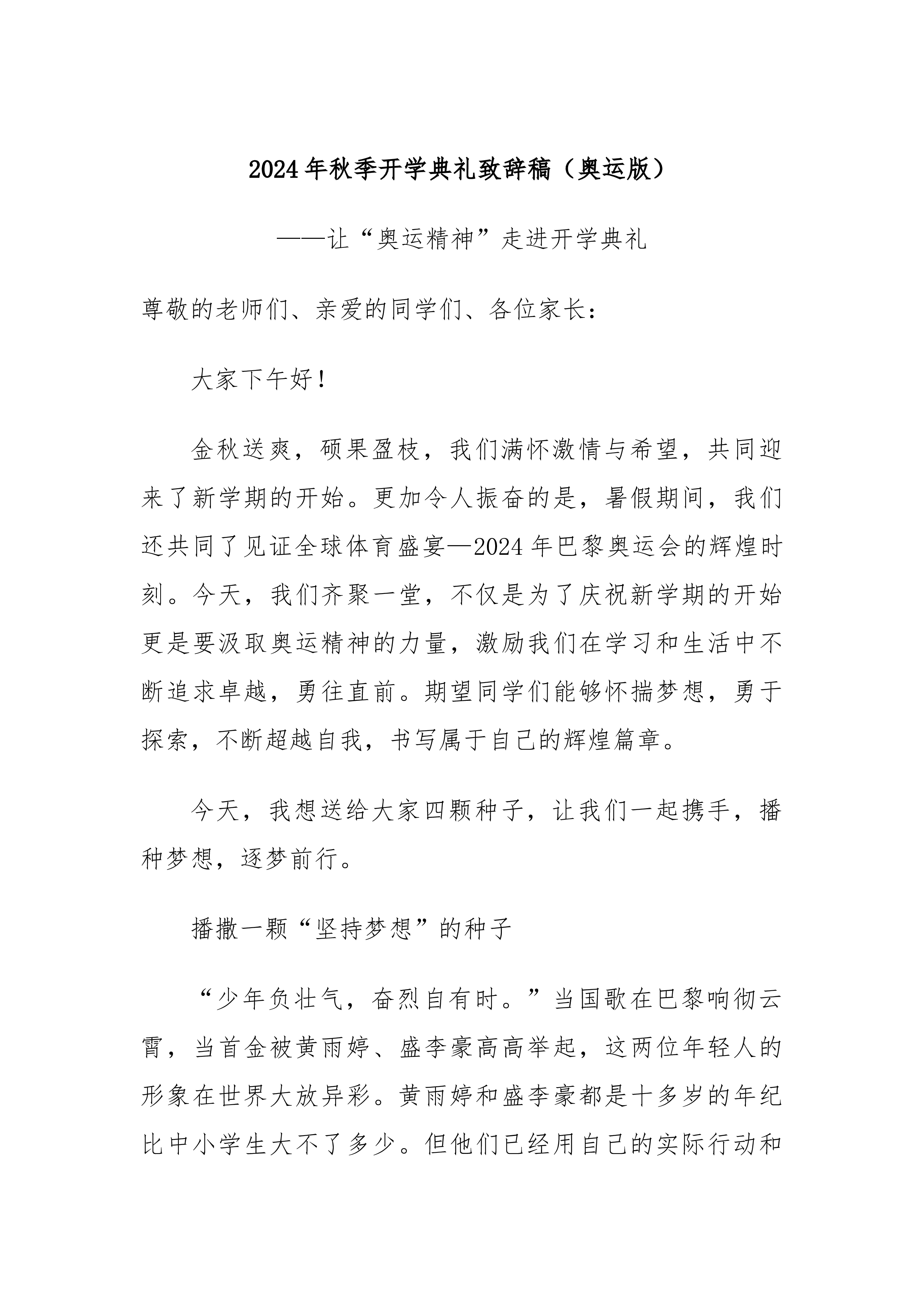 2024年秋季开学典礼致辞稿(奥运版)——让“奥运精神”走进开学典礼尊敬的老师们、亲爱的同学们、各位家长:大家下午好!金秋送爽,硕果盈枝,我们满怀激情与希望,共同迎来了新学期的开始。更加令人振奋的是,暑假期间,我们还共同了见证全球体育盛宴—2024年巴黎奥运会的辉煌时刻。今天,我们齐聚一堂,不仅是为了庆祝新学期的开始更是要汲取奥运精神的力量,激励我们在学习和生活中不断追求卓越,勇往直前。期望同学们能够怀揣梦想,勇于探索,不断超越自我,书写属于自己的辉煌篇章。今天,我想送给大家四颗种子,让我们一起携手,播种梦想,逐梦前行。播撒一颗“坚持梦想”的种子“少年负壮气,奋烈自有时。”当国歌在巴黎响彻云霄...