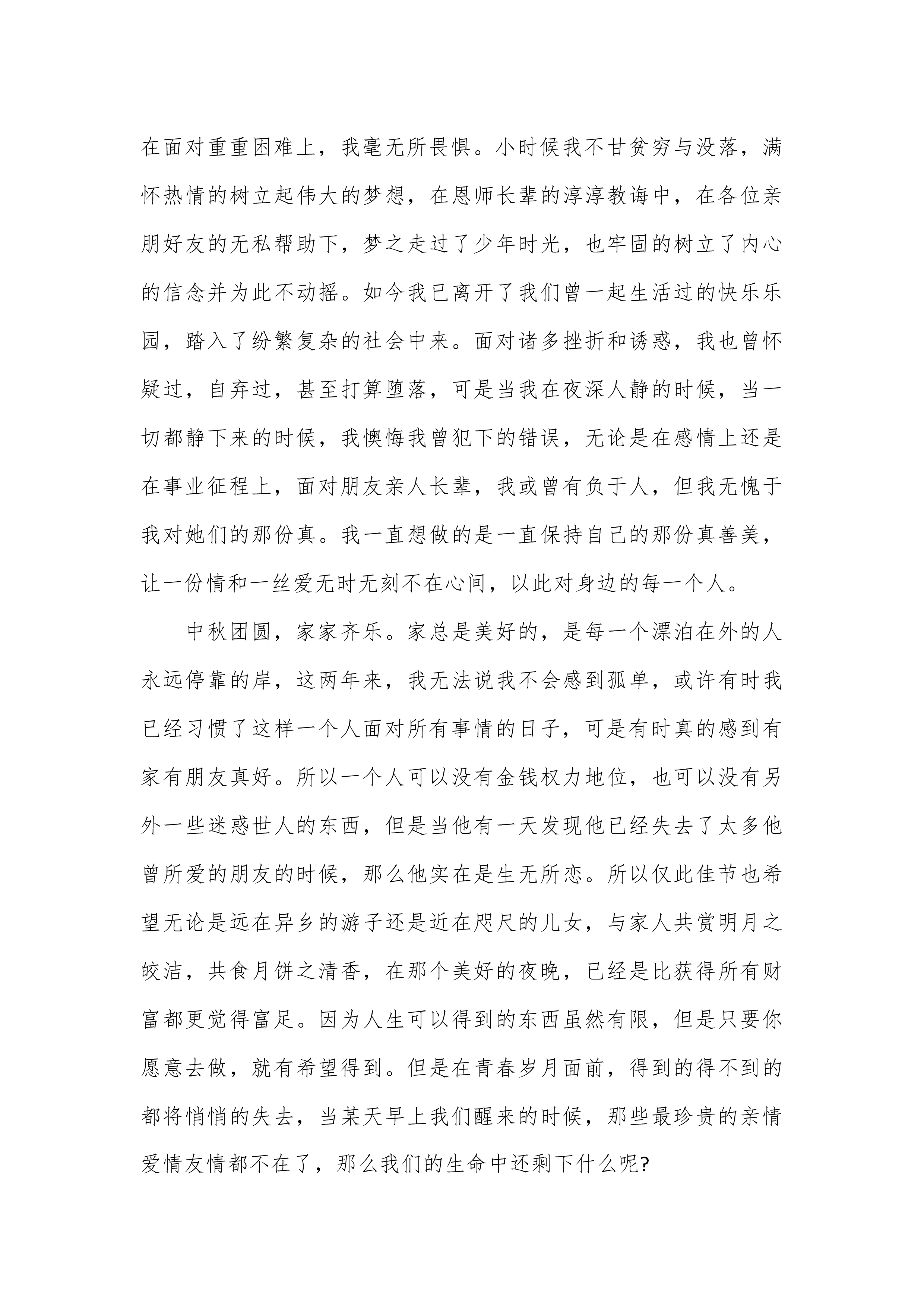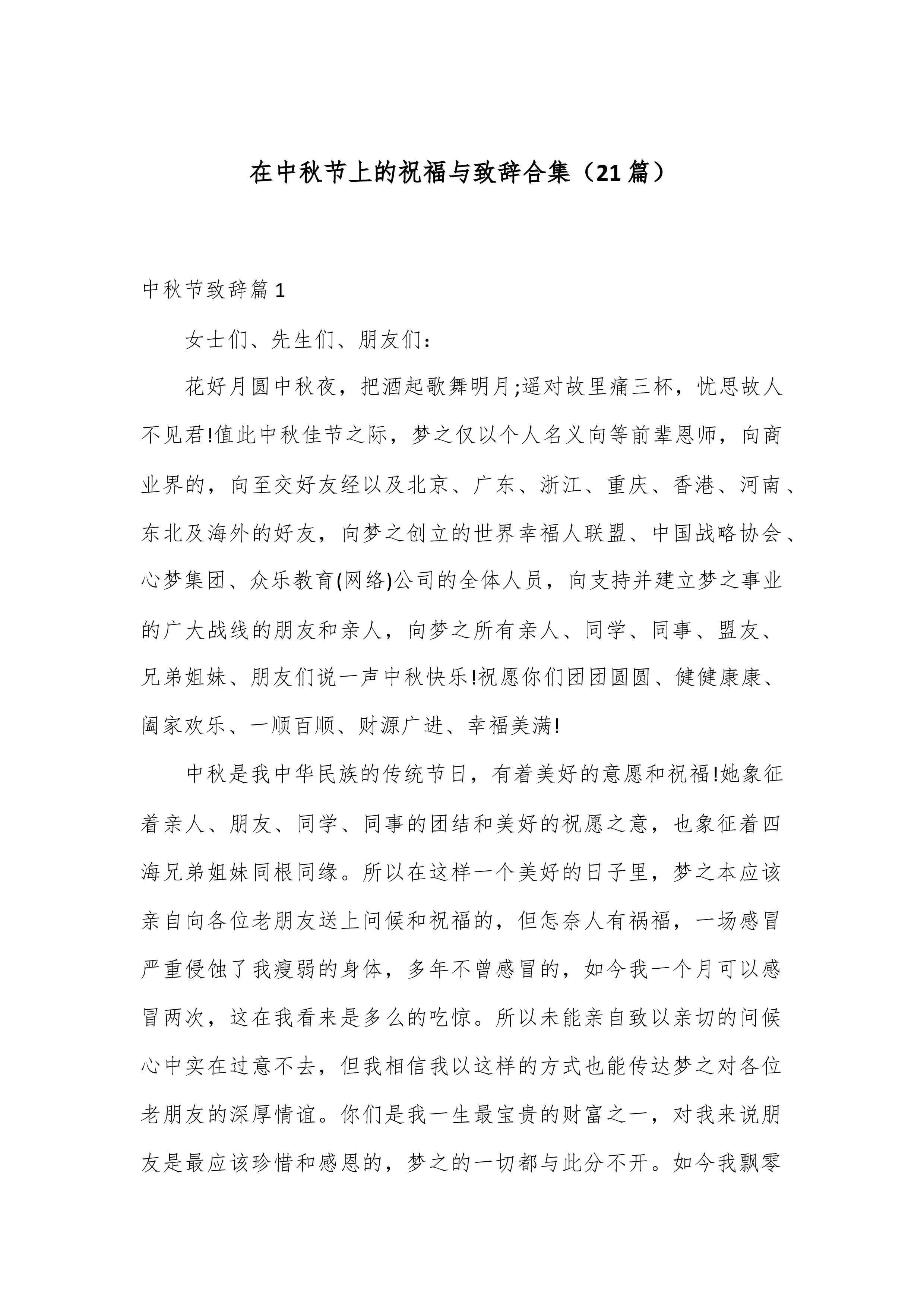 在中秋节上的祝福与致辞合集(21篇)中秋节致辞篇1 女士们、先生们、朋友们: 花好月圆中秋夜,把酒起歌舞明月;遥对故里痛三杯,忧思故人不见君!值此中秋佳节之际,梦之仅以个人名义向等前辈恩师,向商业界的,向至交好友经以及北京、广东、浙江、重庆、香港、河南、东北及海外的好友,向梦之创立的世界幸福人联盟、中国战略协会、心梦集团、众乐教育(网络)公司的全体人员,向支持并建立梦之事业的广大战线的朋友和亲人,向梦之所有亲人、同学、同事、盟友、兄弟姐妹、朋友们说一声中秋快乐!祝愿你们团团圆圆、健健康康、阖家欢乐、一顺百顺、财源广进、幸福美满! 中秋是我中华民族的传统节日,有着美好的意愿和祝福!她象征着...