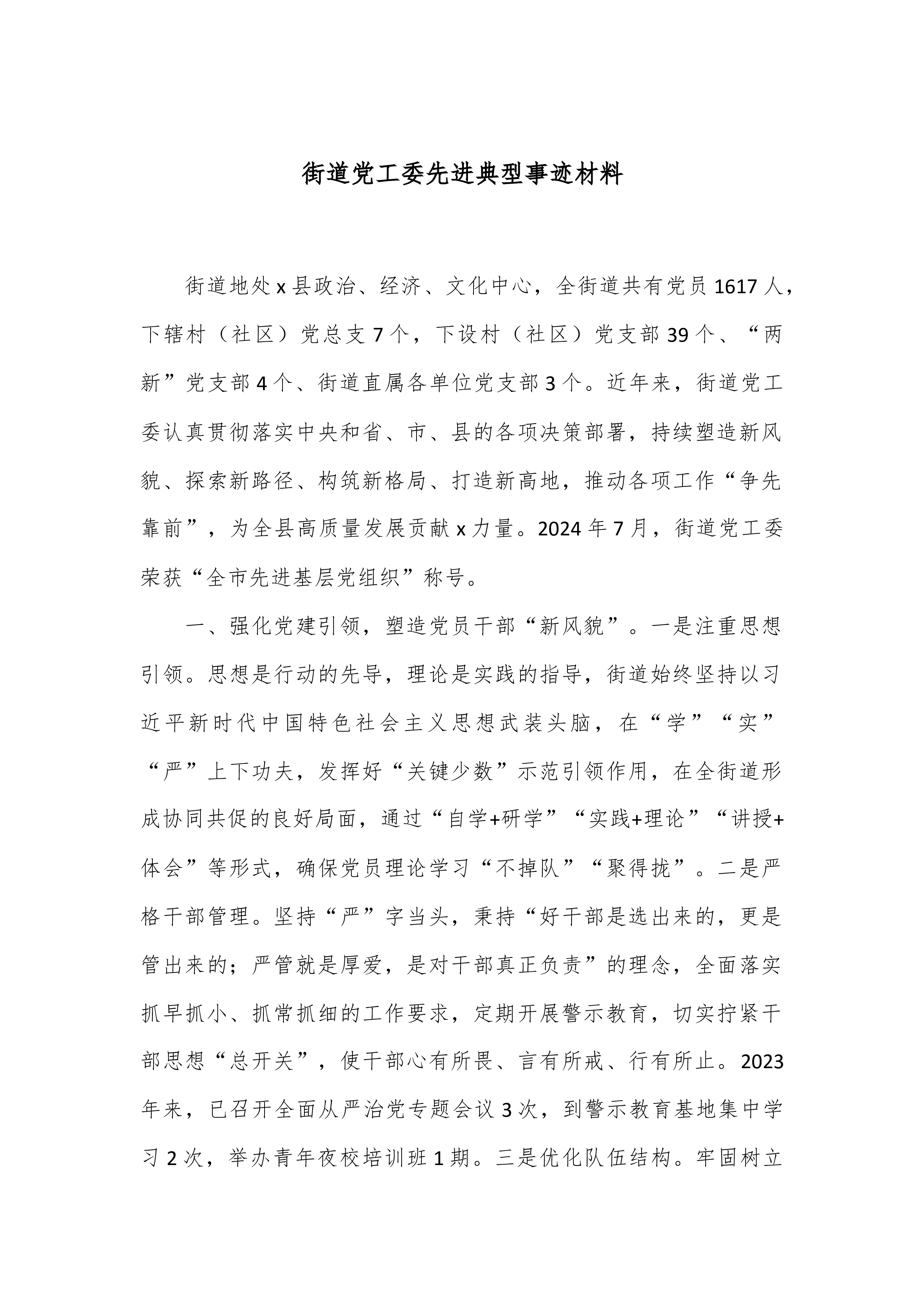 街道党工委先进典型事迹材料 街道地处x县政治、经济、文化中心,全街道共有党员1617人,下辖村(社区)党总支7个,下设村(社区)党支部39个、“两新”党支部4个、街道直属各单位党支部3个。近年来,街道党工委认真贯彻落实中央和省、市、县的各项决策部署,持续塑造新风貌、探索新路径、构筑新格局、打造新高地,推动各项工作“争先靠前”,为全县高质量发展贡献x力量。2024年7月,街道党工委荣获“全市先进基层党组织”称号。 一、强化党建引领,塑造党员干部“新风貌”。一是注重思想引领。思想是行动的先导,理论是实践的指导,街道始终坚持以习近平新时代中国特色社会主义思想武装头脑,在“学”“实”“严”上下功夫...