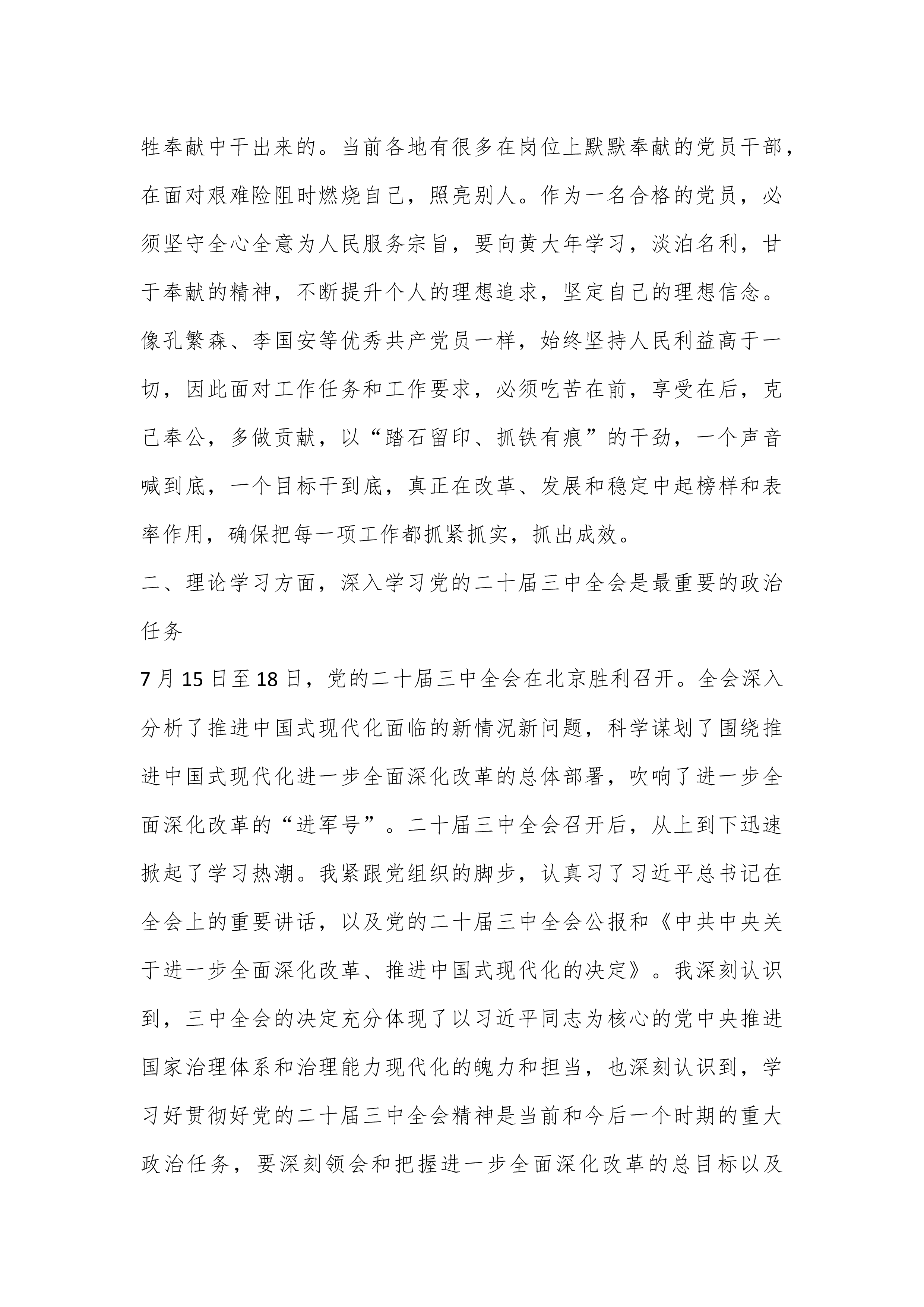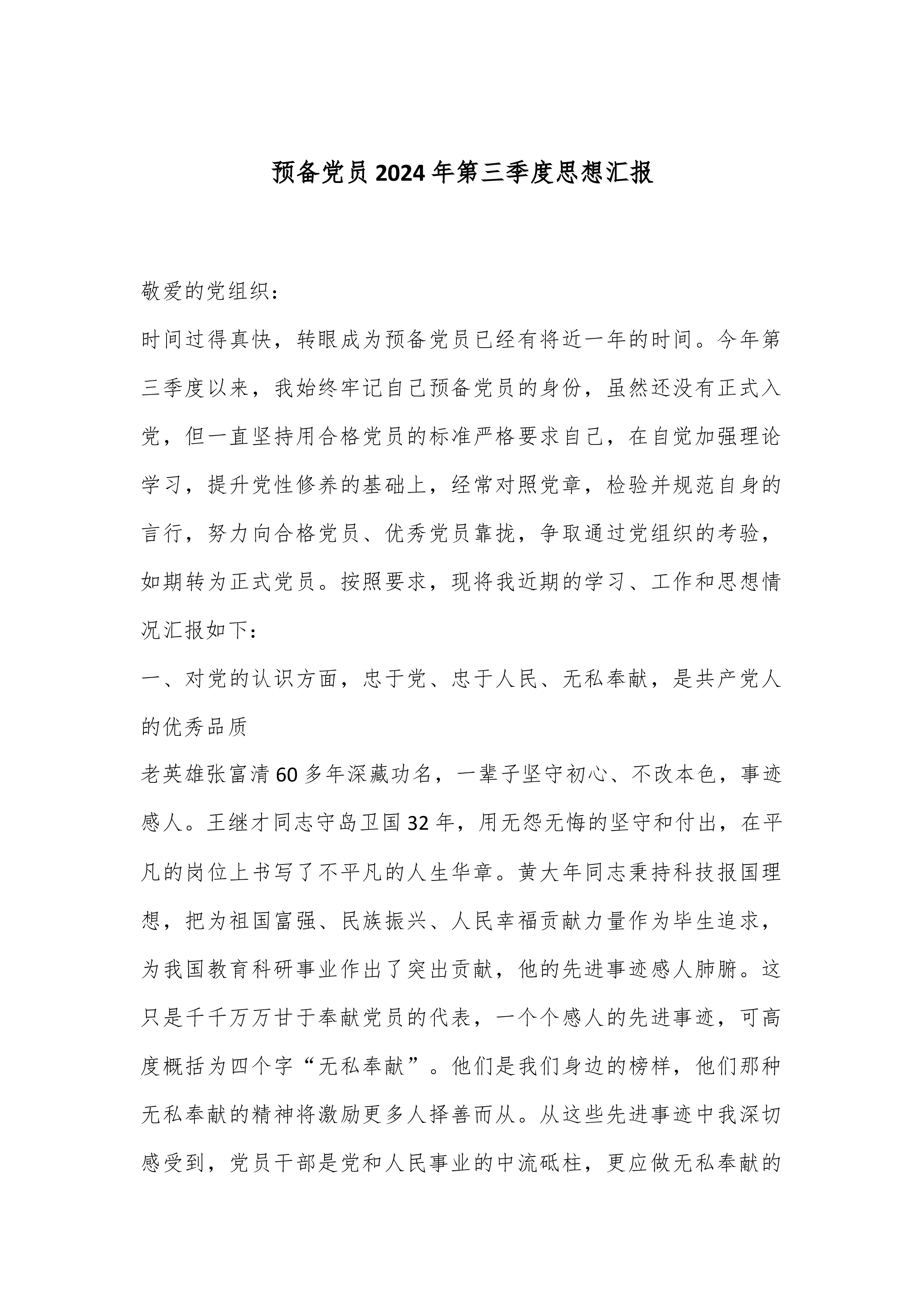 预备党员2024年第三季度思想汇报敬爱的党组织:时间过得真快,转眼成为预备党员已经有将近一年的时间。今年第三季度以来,我始终牢记自己预备党员的身份,虽然还没有正式入党,但一直坚持用合格党员的标准严格要求自己,在自觉加强理论学习,提升党性修养的基础上,经常对照党章,检验并规范自身的言行,努力向合格党员、优秀党员靠拢,争取通过党组织的考验,如期转为正式党员。按照要求,现将我近期的学习、工作和思想情况汇报如下:一、对党的认识方面,忠于党、忠于人民、无私奉献,是共产党人的优秀品质老英雄张富清60多年深藏功名,一辈子坚守初心、不改本色,事迹感人。王继才同志守岛卫国32年,用无怨无悔的坚守和付出,在平凡的...