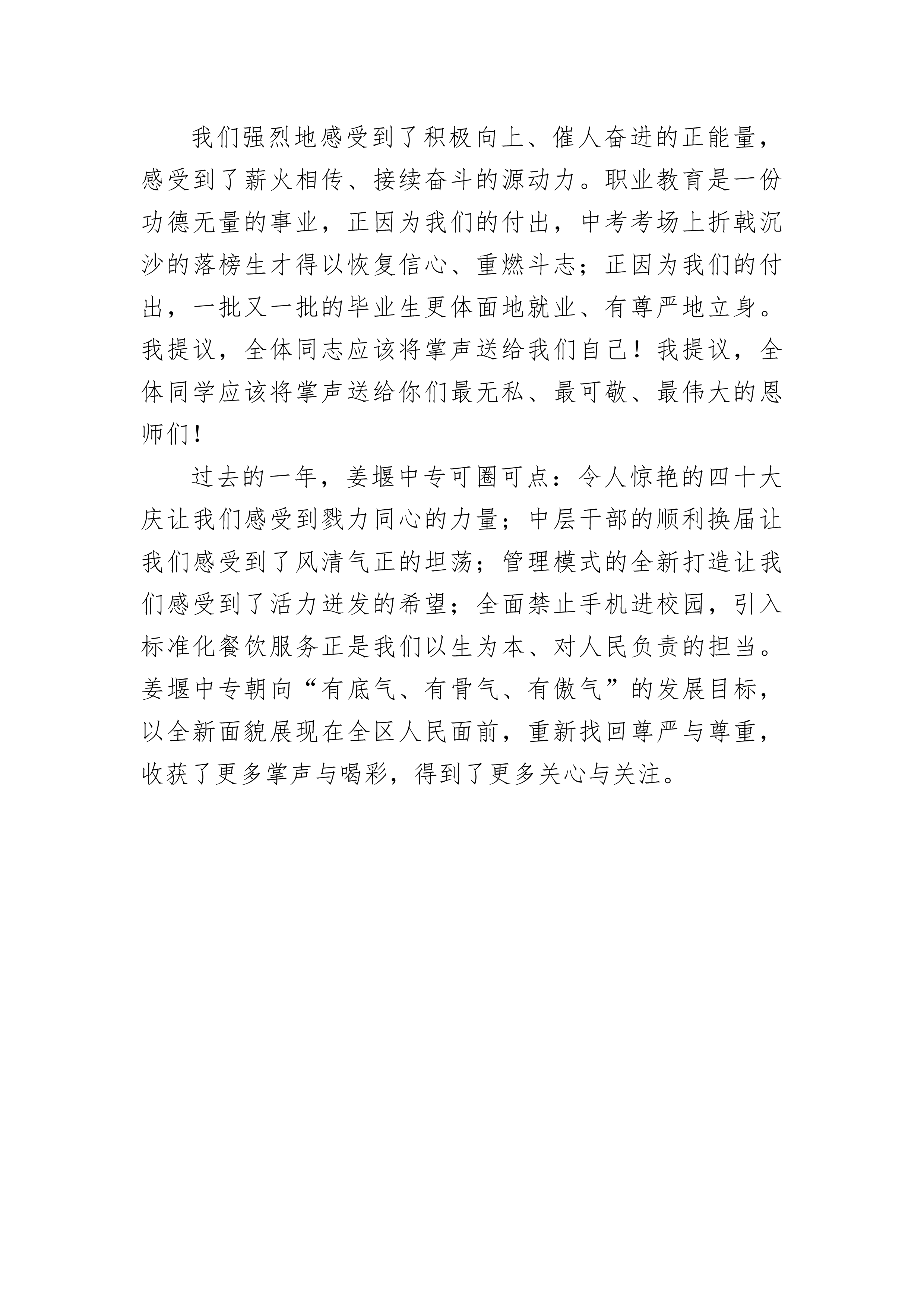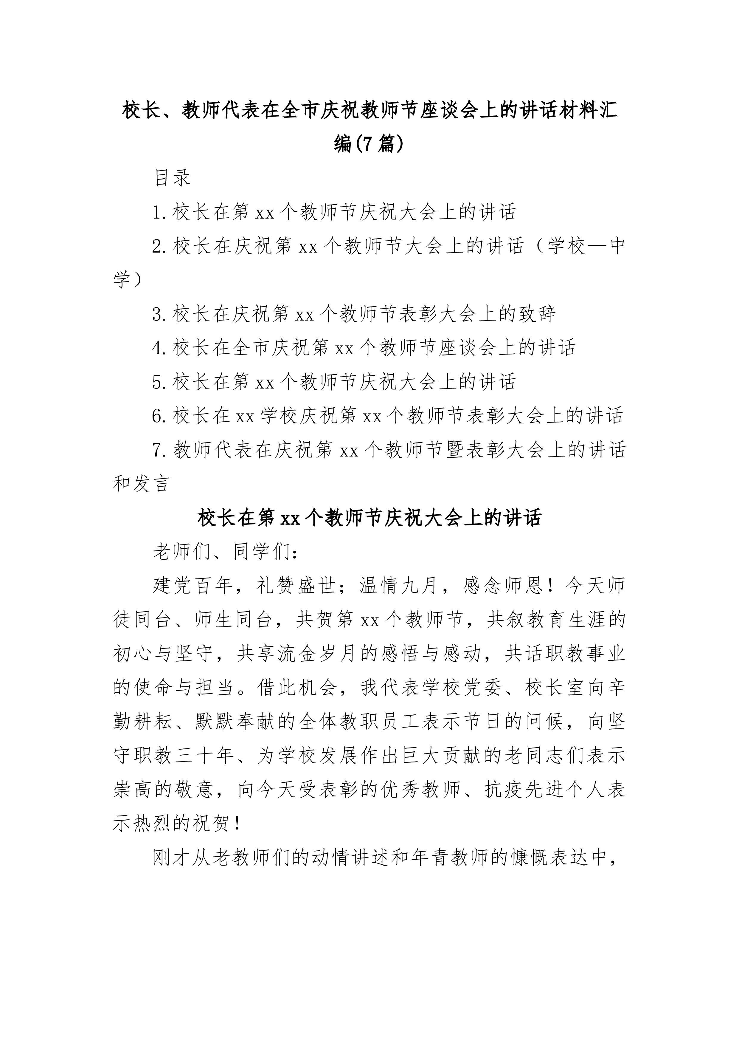 校长、教师代表在全市庆祝教师节座谈会上的讲话材料汇编(7篇)目录1.校长在第xx个教师节庆祝大会上的讲话2.校长在庆祝第xx个教师节大会上的讲话(学校—中学)3.校长在庆祝第xx个教师节表彰大会上的致辞4.校长在全市庆祝第xx个教师节座谈会上的讲话5.校长在第xx个教师节庆祝大会上的讲话6.校长在xx学校庆祝第xx个教师节表彰大会上的讲话7.教师代表在庆祝第xx个教师节暨表彰大会上的讲话和发言校长在第xx个教师节庆祝大会上的讲话老师们、同学们:建党百年,礼赞盛世;温情九月,感念师恩!今天师徒同台、师生同台,共贺第xx个教师节,共叙教育生涯的初心与坚守,共享流金岁月的感悟与感动,共话职教事业的使...
