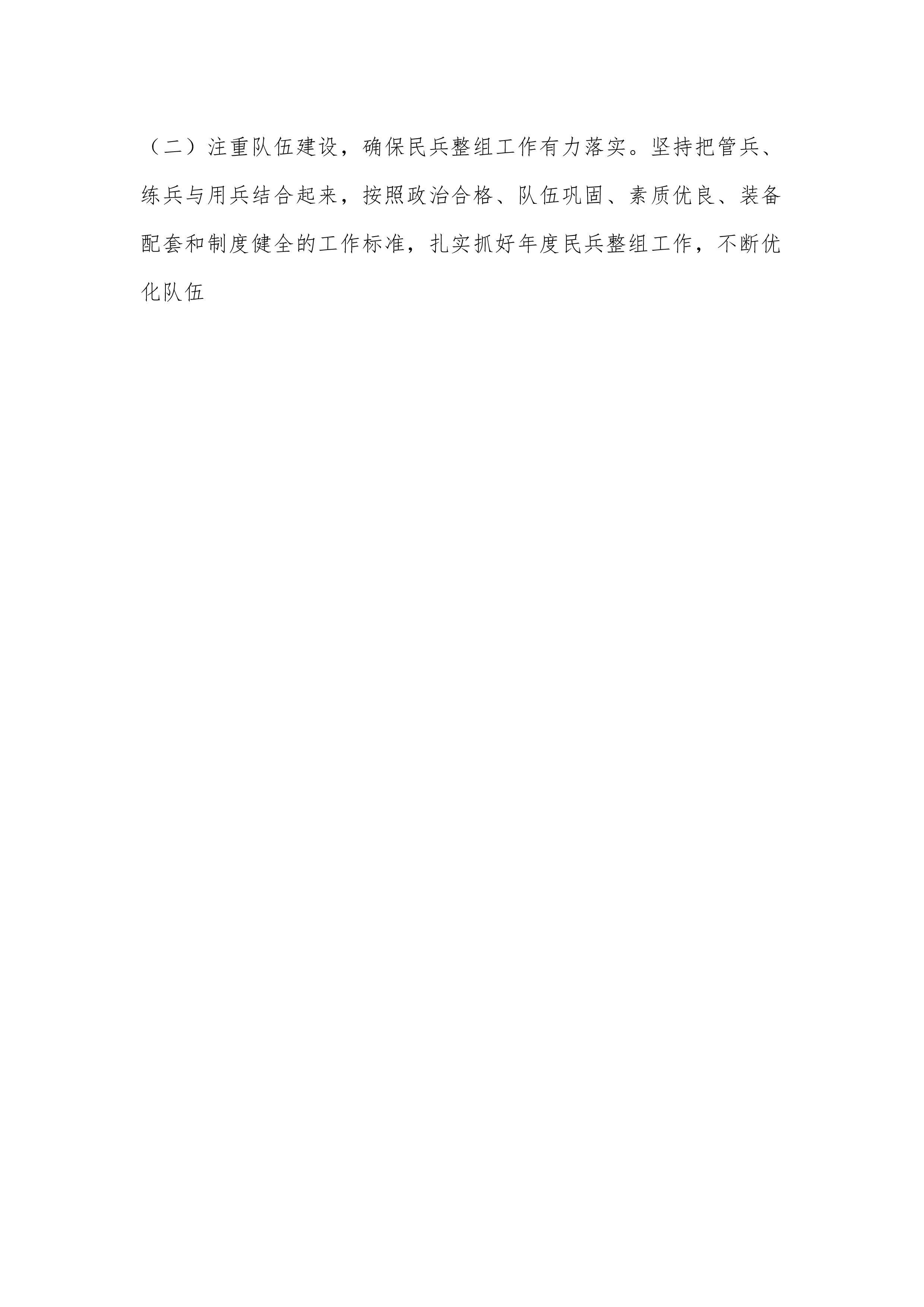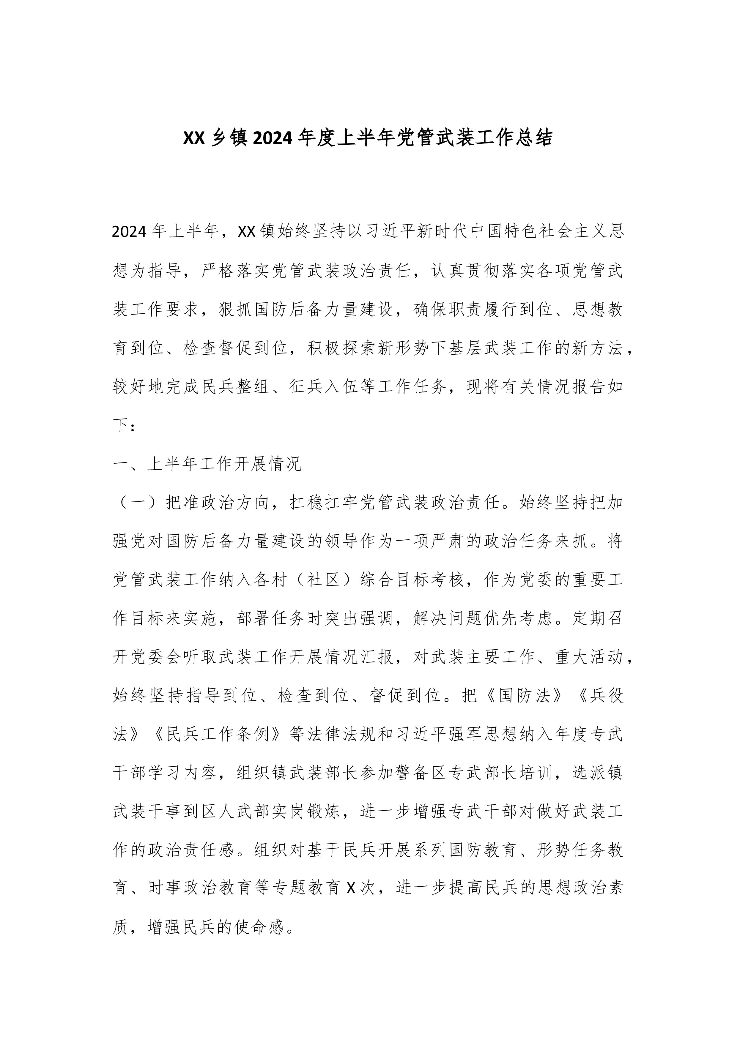 XX乡镇2024年度上半年党管武装工作总结2024年上半年,XX镇始终坚持以习近平新时代中国特色社会主义思想为指导,严格落实党管武装政治责任,认真贯彻落实各项党管武装工作要求,狠抓国防后备力量建设,确保职责履行到位、思想教育到位、检查督促到位,积极探索新形势下基层武装工作的新方法,较好地完成民兵整组、征兵入伍等工作任务,现将有关情况报告如下:一、上半年工作开展情况(一)把准政治方向,扛稳扛牢党管武装政治责任。始终坚持把加强党对国防后备力量建设的领导作为一项严肃的政治任务来抓。将党管武装工作纳入各村(社区)综合目标考核,作为党委的重要工作目标来实施,部署任务时突出强调,解决问题优先考虑。定期召开...