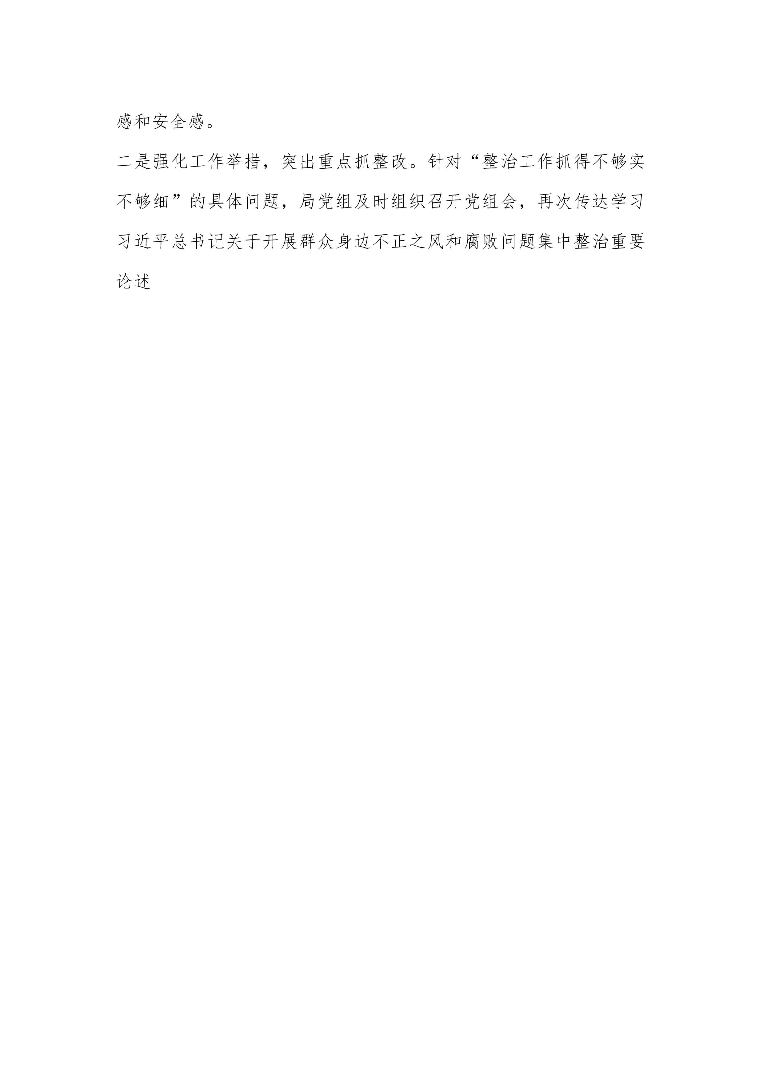 群众身边不正之风和腐败问题集中整治工作督查反馈问题整改情况报告接到你组督查反馈“对整治工作抓的不够实不够细”的问题后,局党组高度重视,主要负责同志第一时间进行安排部署,明确任务目标,细化工作举措,确保存在问题整改取得实效。一是提高政治站位,压实责任抓整改。局党组委坚持从政治上看、从政治上抓,第一时间召集班子成员研究督导反馈问题整改工作,成立整改工作专班,明确整改牵头领导、整改措施、责任股室和完成时限,全力抓好反馈问题整改工作。局分管领导及时召集派驻纪检组、局机关纪委、相关业务股室有关负责同志召开全局督查反馈问题整改专题会议,通报存在问题,剖析问题根源,研究制定整改措施,并确定专人负责整改工作,...