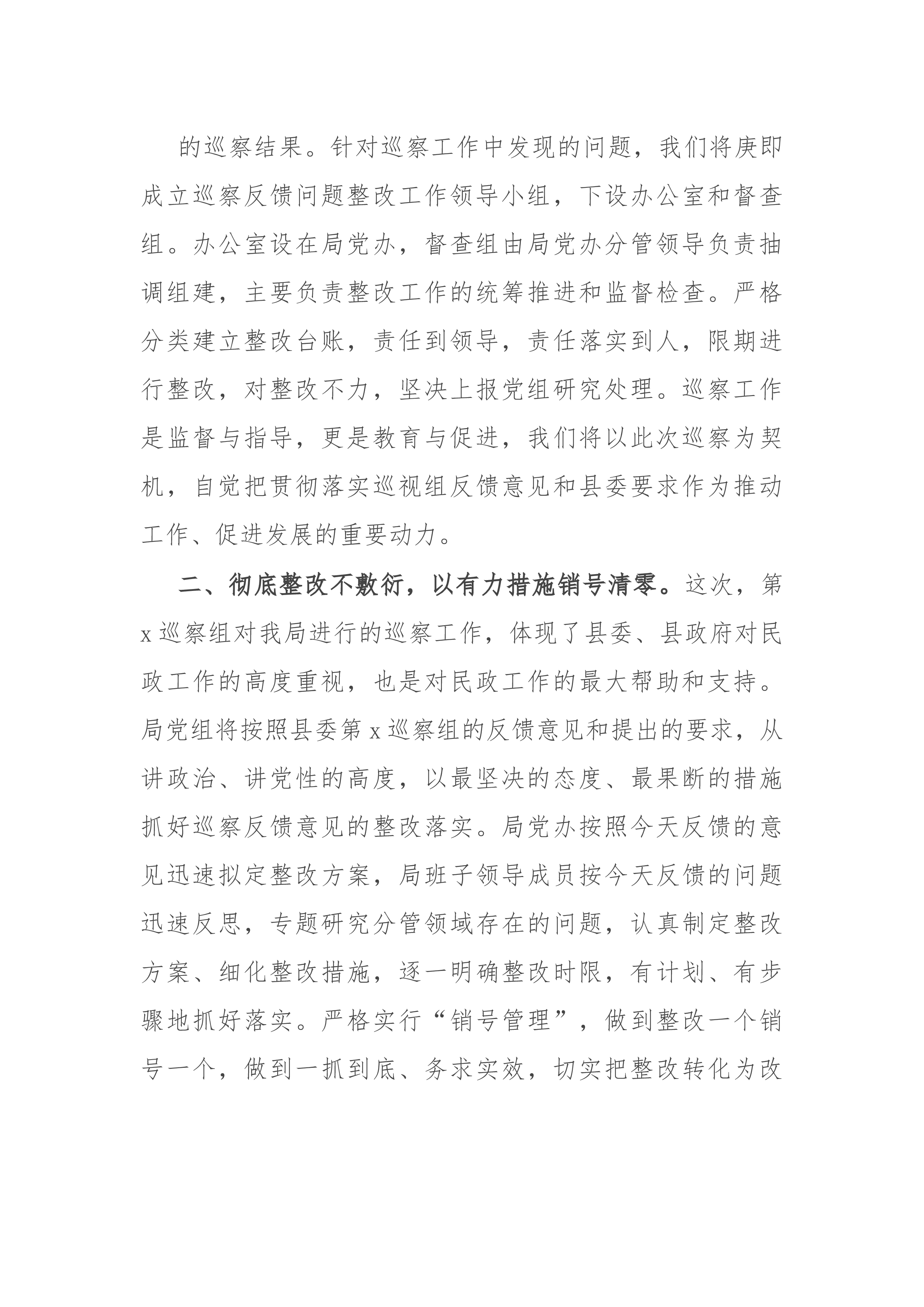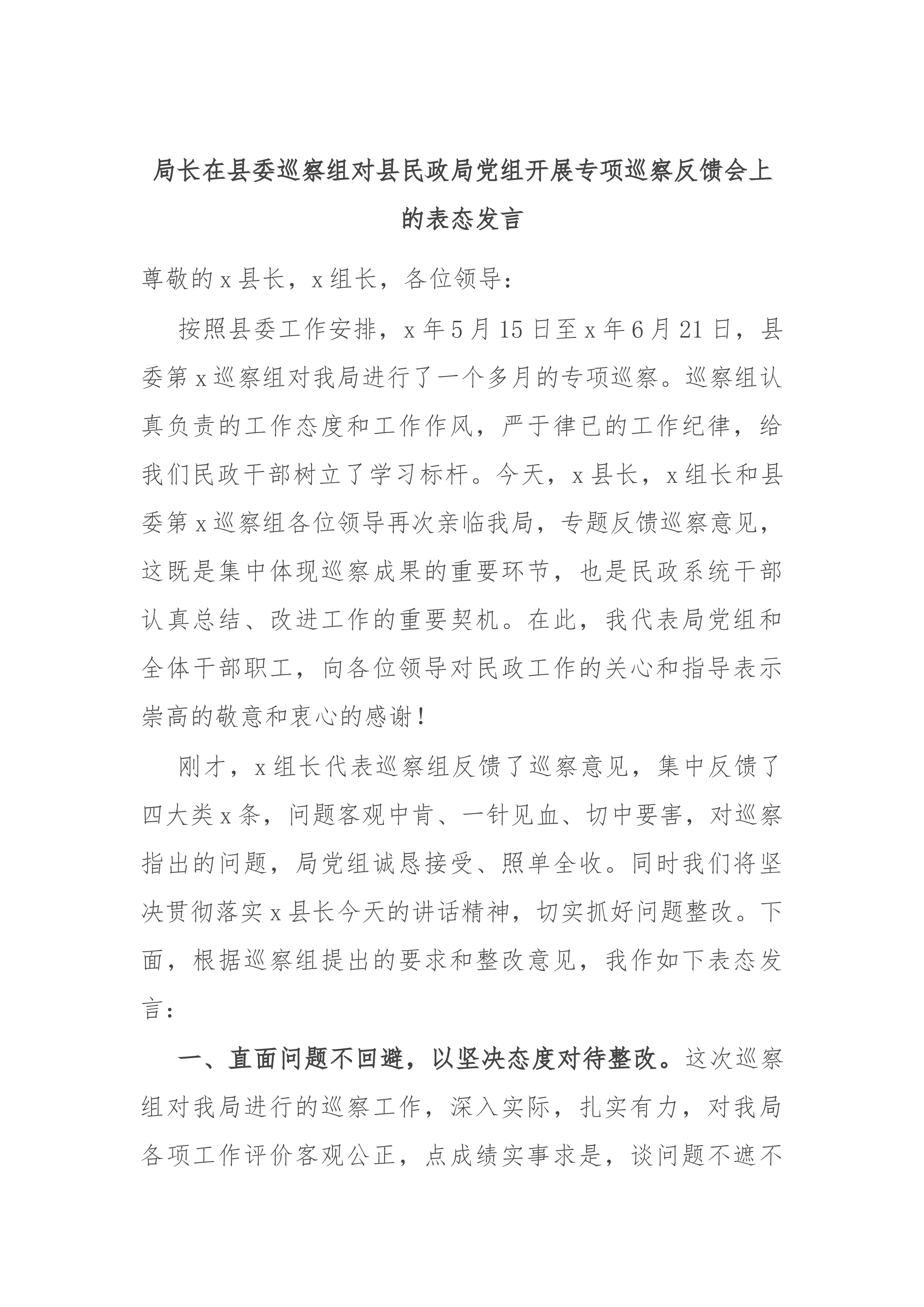 局长在县委巡察组对县民政局党组开展专项巡察反馈会上的表态发言尊敬的x县长,x组长,各位领导:按照县委工作安排,x年5月15日至x年6月21日,县委第x巡察组对我局进行了一个多月的专项巡察。巡察组认真负责的工作态度和工作作风,严于律已的工作纪律,给我们民政干部树立了学习标杆。今天,x县长,x组长和县委第x巡察组各位领导再次亲临我局,专题反馈巡察意见,这既是集中体现巡察成果的重要环节,也是民政系统干部认真总结、改进工作的重要契机。在此,我代表局党组和全体干部职工,向各位领导对民政工作的关心和指导表示崇高的敬意和衷心的感谢!刚才,x组长代表巡察组反馈了巡察意见,集中反馈了四大类x条,问题客观中肯、一...