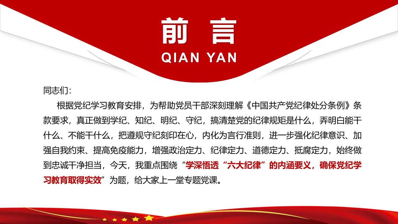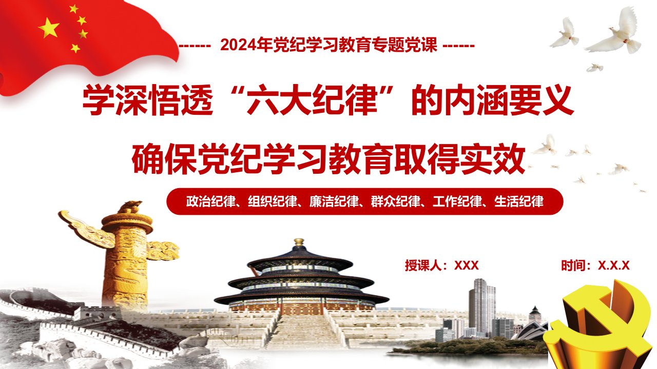 标题:2024年党纪学习教育专题党课讲稿ppt课件【两套】供参考:学深悟透六大纪律内涵要义,确保党纪学习教育取得实效与学党纪 知规矩 明意识 守清廉 做勇于担当作为的模范党员