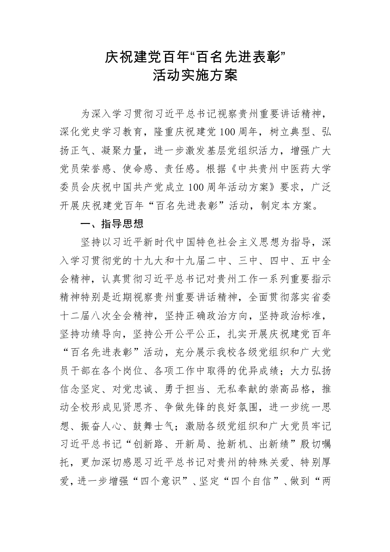 标题:庆祝建党百年“百名先进表彰”活动实施方案