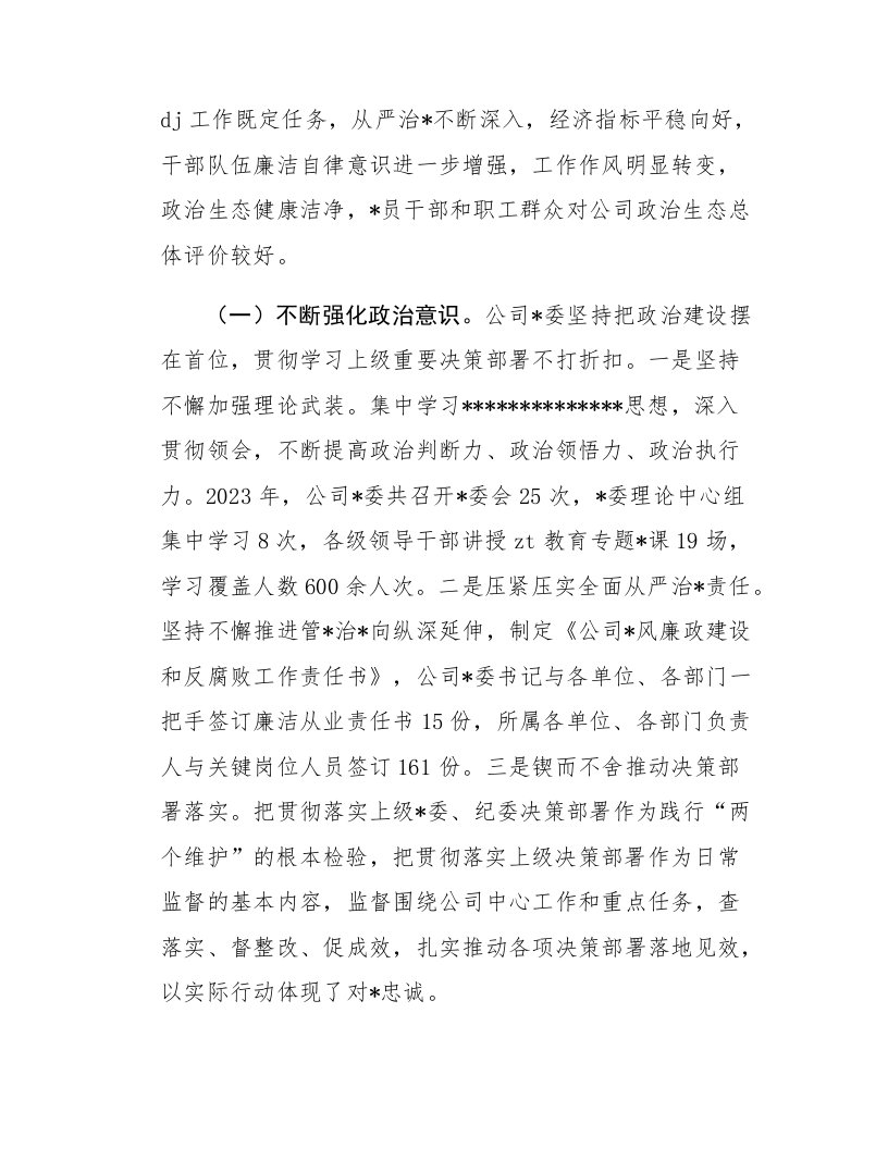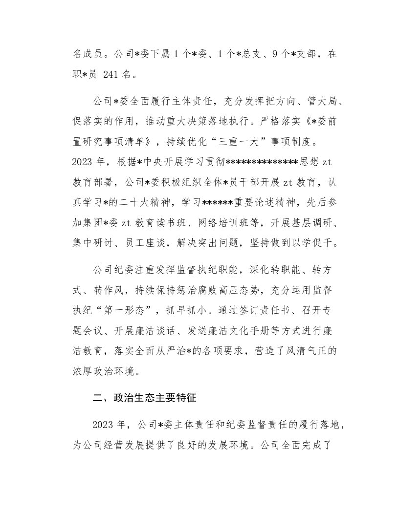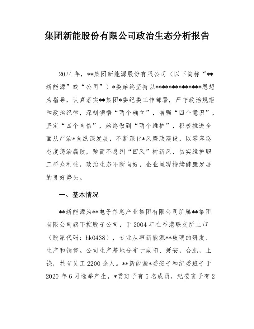 集团新能股份有限公司政治生态分析报告2024年,**集团新能源股份有限公司(以下简称“**新能源”或“公司”)*委始终坚持以**************思想为指导,认真落实**集团*委纪委工作部署,严守政治规矩和政治纪律,深刻领悟“两个确立”,增强“四个意识”,坚定“四个自信”,始终做到“两个维护”,积极推进全面从严治*向纵深发展,不断深化*风廉政建设,以零容忍态度惩治腐败,弛而不息纠“四风”树新风,切实维护职工群众利益,政治生态不断向好,企业呈现持续健康发展的良好势头。一、基本情况**新能源为**电子信息产业集团有限公司所属**集团有限公司旗下控股子公司,于2004年在香港联交所上市(股票代码:hk0438),专业从事新能源**玻璃的研发、生产和销售。公司生产基地分布于咸阳、延安,合肥,上...