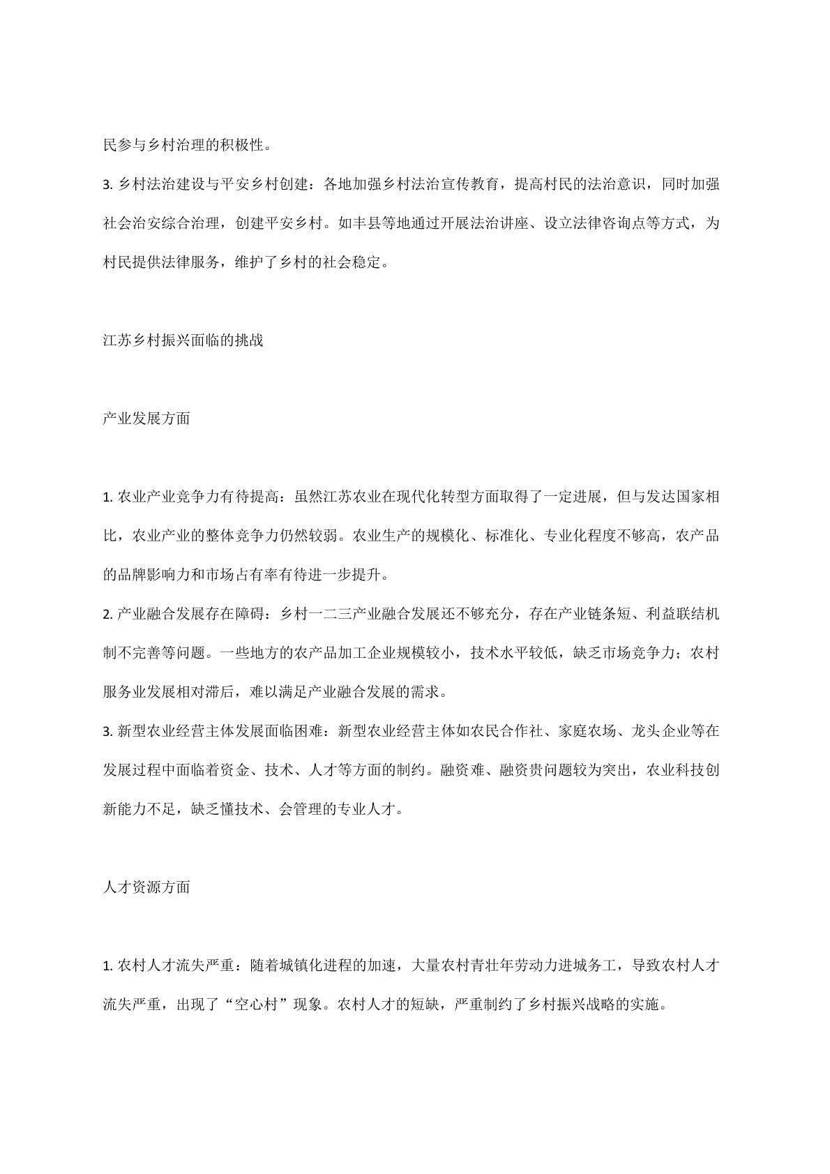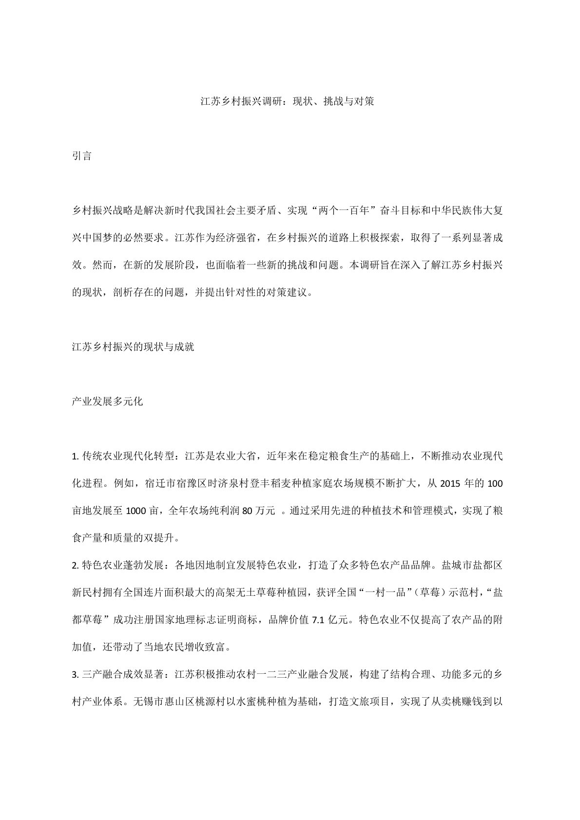 江苏乡村振兴调研:现状、挑战与对策引言乡村振兴战略是解决新时代我国社会主要矛盾、实现“两个一百年”奋斗目标和中华民族伟大复兴中国梦的必然要求。江苏作为经济强省,在乡村振兴的道路上积极探索,取得了一系列显著成效。然而,在新的发展阶段,也面临着一些新的挑战和问题。本调研旨在深入了解江苏乡村振兴的现状,剖析存在的问题,并提出针对性的对策建议。江苏乡村振兴的现状与成就产业发展多元化1. 传统农业现代化转型:江苏是农业大省,近年来在稳定粮食生产的基础上,不断推动农业现代化进程。例如,宿迁市宿豫区时济泉村登丰稻麦种植家庭农场规模不断扩大,从2015年的100亩地发展至1000亩,全年农场纯利润80万元。通过采用先进的种植技术和管理模式,实现了粮食产量和质量的双提升。2. 特色农业蓬勃发展:各地因地制宜发...