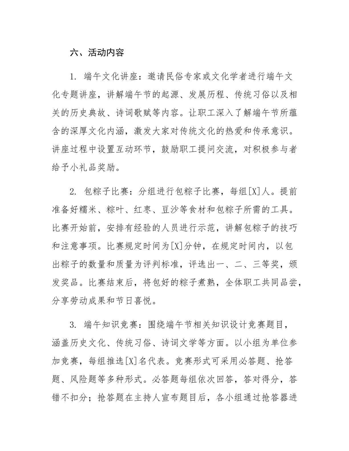 综合行政执法局2025年端午节活动方案一、活动主题粽香端午,情系执法二、活动目的通过举办端午节活动,弘扬中华民族优秀传统文化,丰富综合行政执法局职工的精神文化生活,增强团队凝聚力和归属感,展现执法队伍良好的精神风貌,促进职工之间的交流与合作,营造和谐、温馨的节日氛围。三、活动时间[具体活动日期,建议选择端午节假期内或前后的工作日],上午9:00-下午16:00四、活动地点综合行政执法局内部场地(如会议室、食堂等)五、参与人员综合行政执法局全体干部职工六、活动内容1.端午文化讲座:邀请民俗专家或文化学者进行端午文化专题讲座,讲解端午节的起源、发展历程、传统习俗以及相关的历史典故、诗词歌赋等内容。让职工深入了解端午节所蕴含的深厚文化内涵,激发大家对传统文化的热爱和传承意识。讲座过程中设置互动环节...