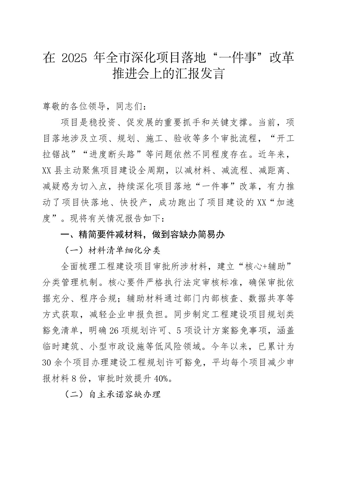在2025年全市深化项目落地“一件事”改革推进会上的汇报发言尊敬的各位领导,同志们:项目是稳投资、促发展的重要抓手和关键支撑。当前,项目落地涉及立项、规划、施工、验收等多个审批流程,“开工拉锯战”“进度断头路”等问题依然不同程度存在。近年来,XX县主动聚焦项目建设全周期,以减材料、减流程、减距离、减疑惑为切入点,持续深化项目落地“一件事”改革,有力推动了项目快落地、快投产,成功跑出了项目建设的XX“加速度”。现将有关情况报告如下:一、精简要件减材料,做到容缺办简易办(一)材料清单细化分类全面梳理工程建设项目审批所涉材料,建立“核心+辅助”分类管理机制。核心要件严格执行法定审核标准,确保审批依据充分、程序合规;辅助材料通过部门内部核查、数据共享等方式获取,减轻企业申报负担。同步制定工程建设项目...