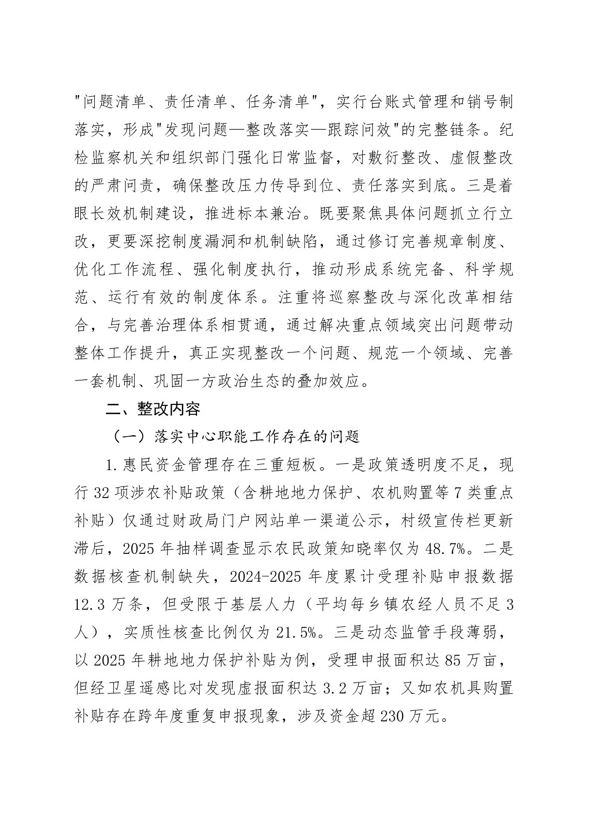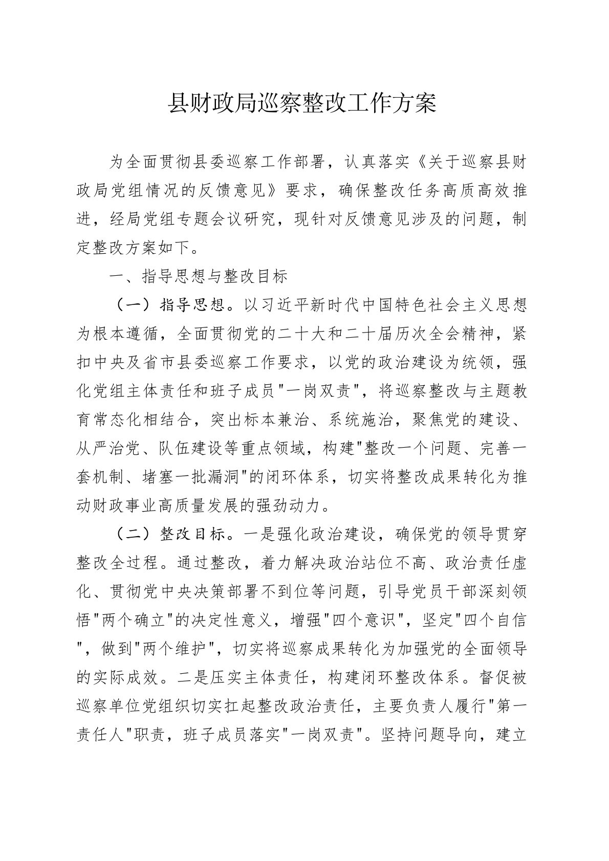 县财政局巡察整改工作方案为全面贯彻县委巡察工作部署,认真落实《关于巡察县财政局党组情况的反馈意见》要求,确保整改任务高质高效推进,经局党组专题会议研究,现针对反馈意见涉及的问题,制定整改方案如下。一、指导思想与整改目标(一)指导思想。以习近平新时代中国特色社会主义思想为根本遵循,全面贯彻党的二十大和二十届历次全会精神,紧扣中央及省市县委巡察工作要求,以党的政治建设为统领,强化党组主体责任和班子成员"一岗双责",将巡察整改与主题教育常态化相结合,突出标本兼治、系统施治,聚焦党的建设、从严治党、队伍建设等重点领域,构建"整改一个问题、完善一套机制、堵塞一批漏洞"的闭环体系,切实将整改成果转化为推动财政事业高质量发展的强劲动力。(二)整改目标。一是强化政治建设,确保党的领导贯穿整改全过程。通过整...