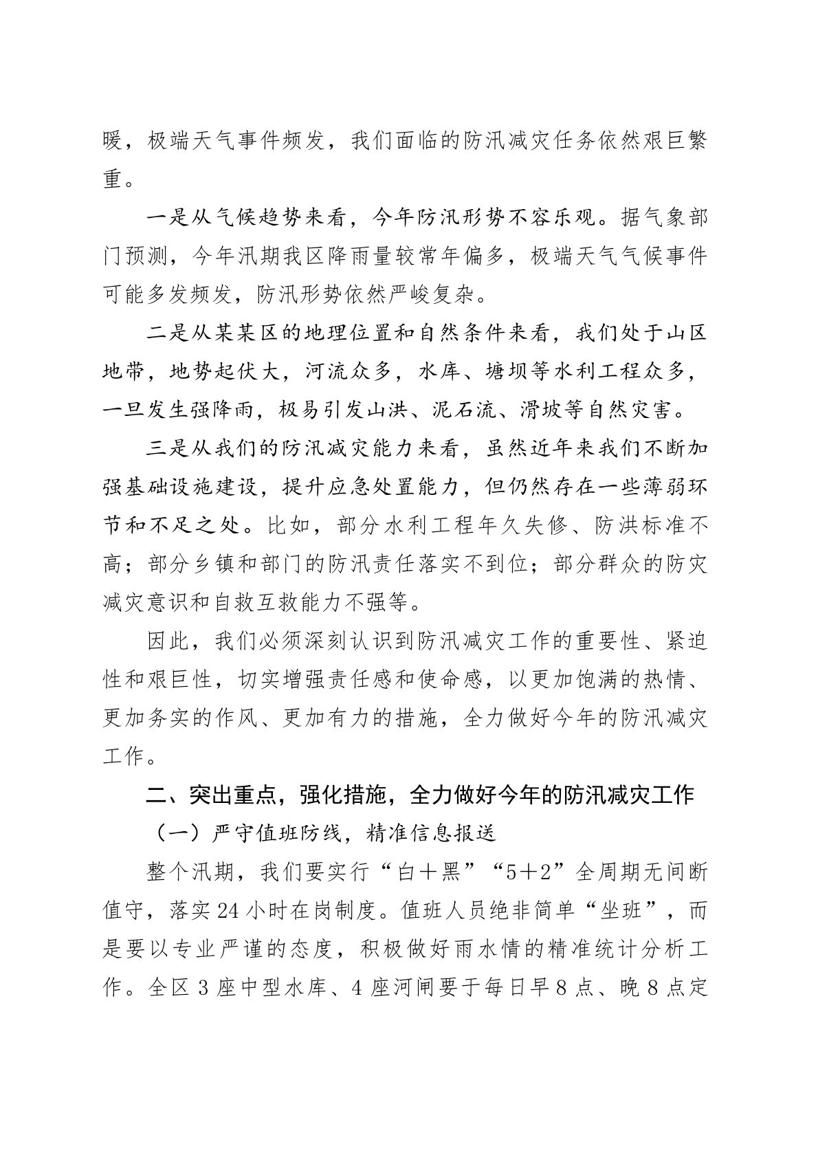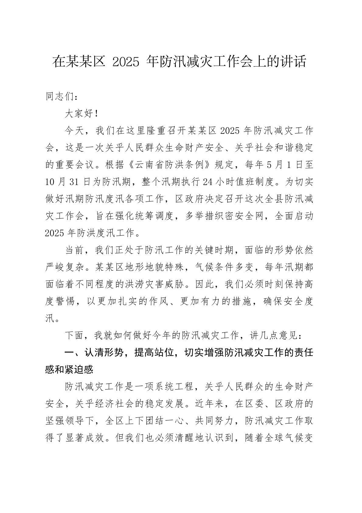 在某某区2025年防汛减灾工作会上的讲话同志们:大家好!今天,我们在这里隆重召开某某区2025年防汛减灾工作会,这是一次关乎人民群众生命财产安全、关乎社会和谐稳定的重要会议。根据《云南省防洪条例》规定,每年5月1日至10月31日为防汛期,整个汛期执行24小时值班制度。为切实做好汛期防汛度汛各项工作,区政府决定召开这次全县防汛减灾工作会,旨在强化统筹调度,多举措织密安全网,全面启动2025年防洪度汛工作。当前,我们正处于防汛工作的关键时期,面临的形势依然严峻复杂。某某区地形地貌特殊,气候条件多变,每年汛期都面临着不同程度的洪涝灾害威胁。因此,我们必须时刻保持高度警惕,以更加扎实的作风、更加有力的措施,确保安全度汛。下面,我就如何做好今年的防汛减灾工作,讲几点意见:一、认清形势,提高站位,切实增...