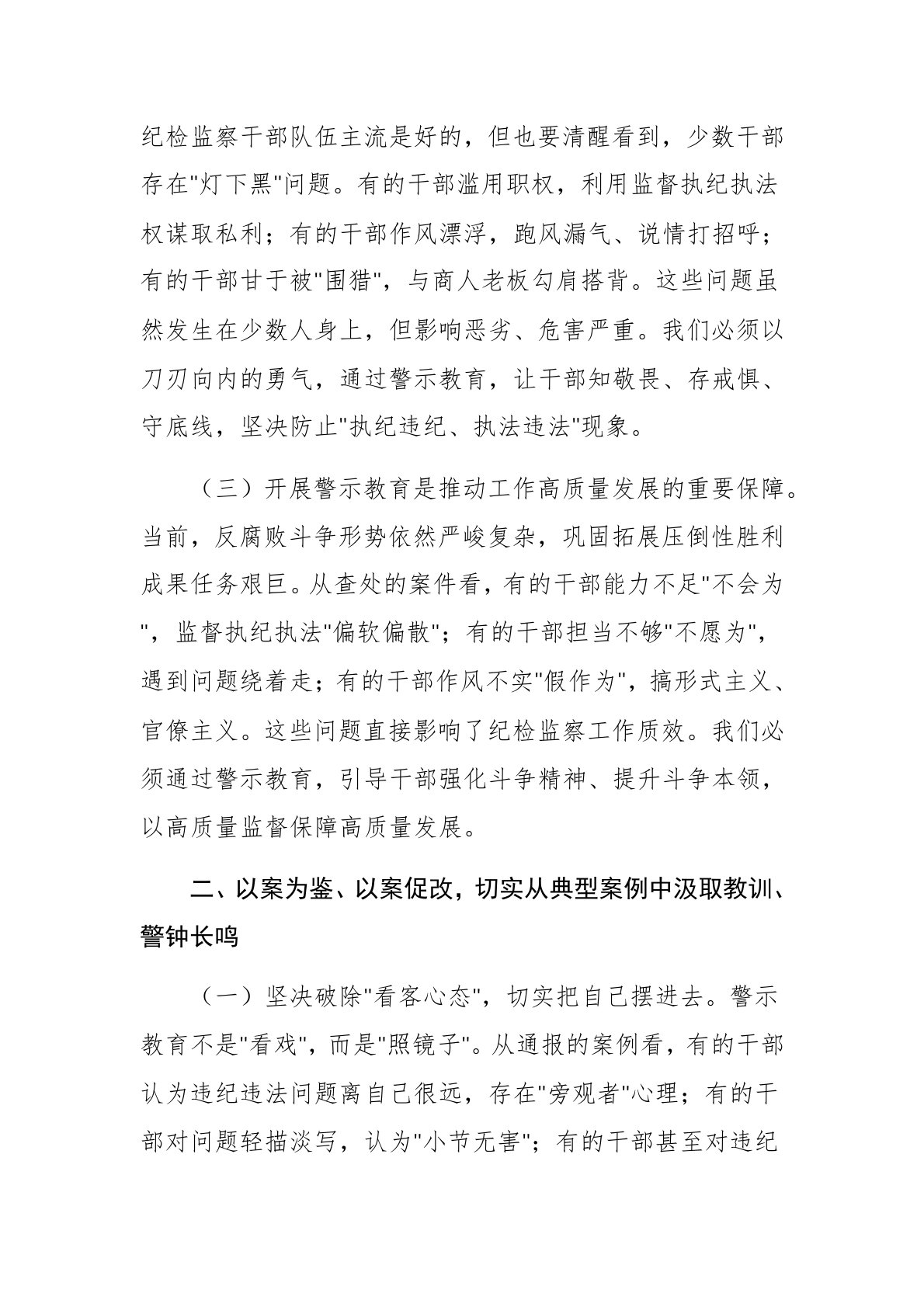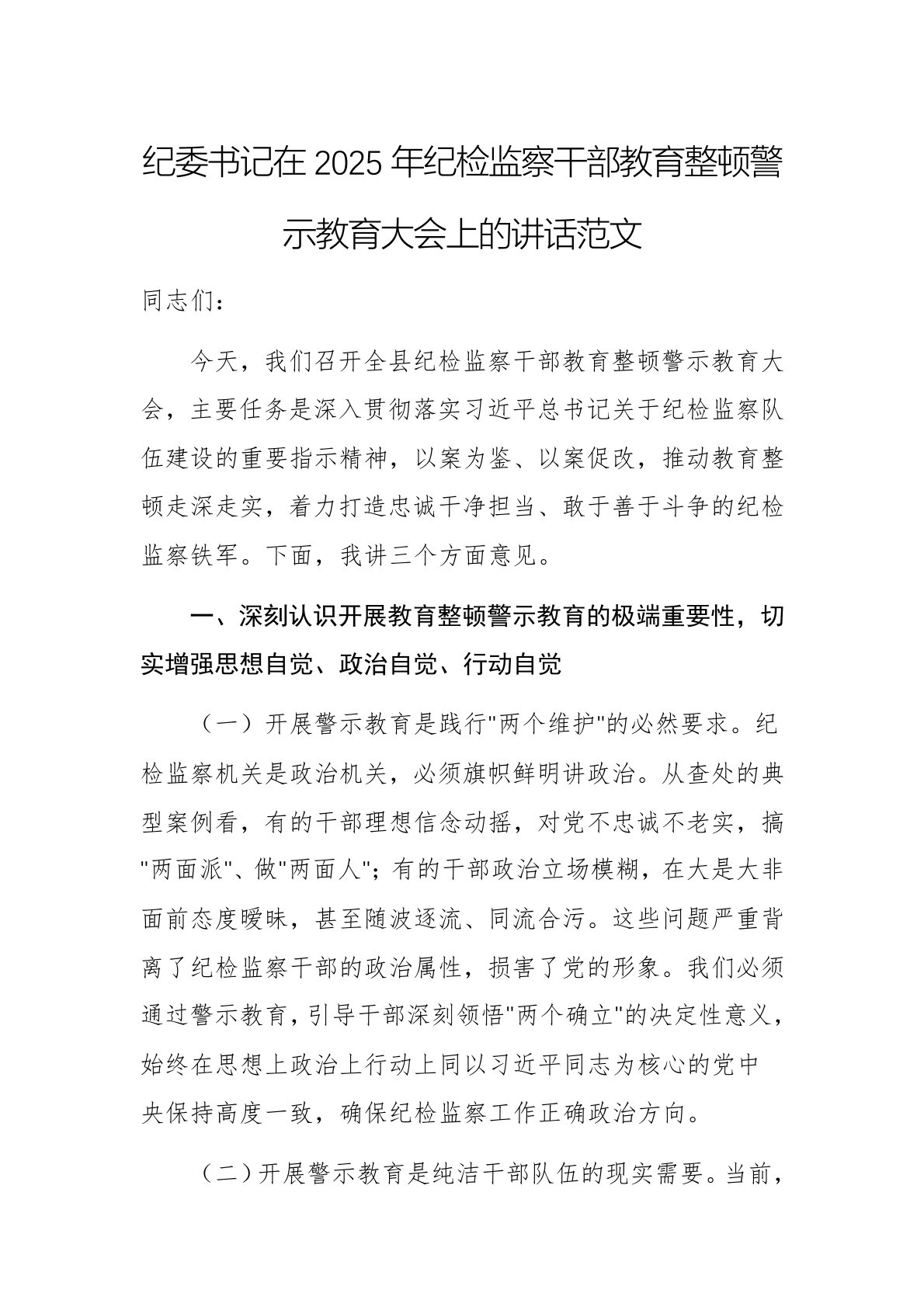 纪委书记在2025年纪检监察干部教育整顿警示教育大会上的讲话范文同志们:今天,我们召开全县纪检监察干部教育整顿警示教育大会,主要任务是深入贯彻落实习近平总书记关于纪检监察队伍建设的重要指示精神,以案为鉴、以案促改,推动教育整顿走深走实,着力打造忠诚干净担当、敢于善于斗争的纪检监察铁军。下面,我讲三个方面意见。一、深刻认识开展教育整顿警示教育的极端重要性,切实增强思想自觉、政治自觉、行动自觉(一)开展警示教育是践行"两个维护"的必然要求。纪检监察机关是政治机关,必须旗帜鲜明讲政治。从查处的典型案例看,有的干部理想信念动摇,对党不忠诚不老实,搞"两面派"、做"两面人";有的干部政治立场模糊,在大是大非面前态度暧昧,甚至随波逐流、同流合污。这些问题严重背离了纪检监察干部的政治属性,损害了党的形象。...