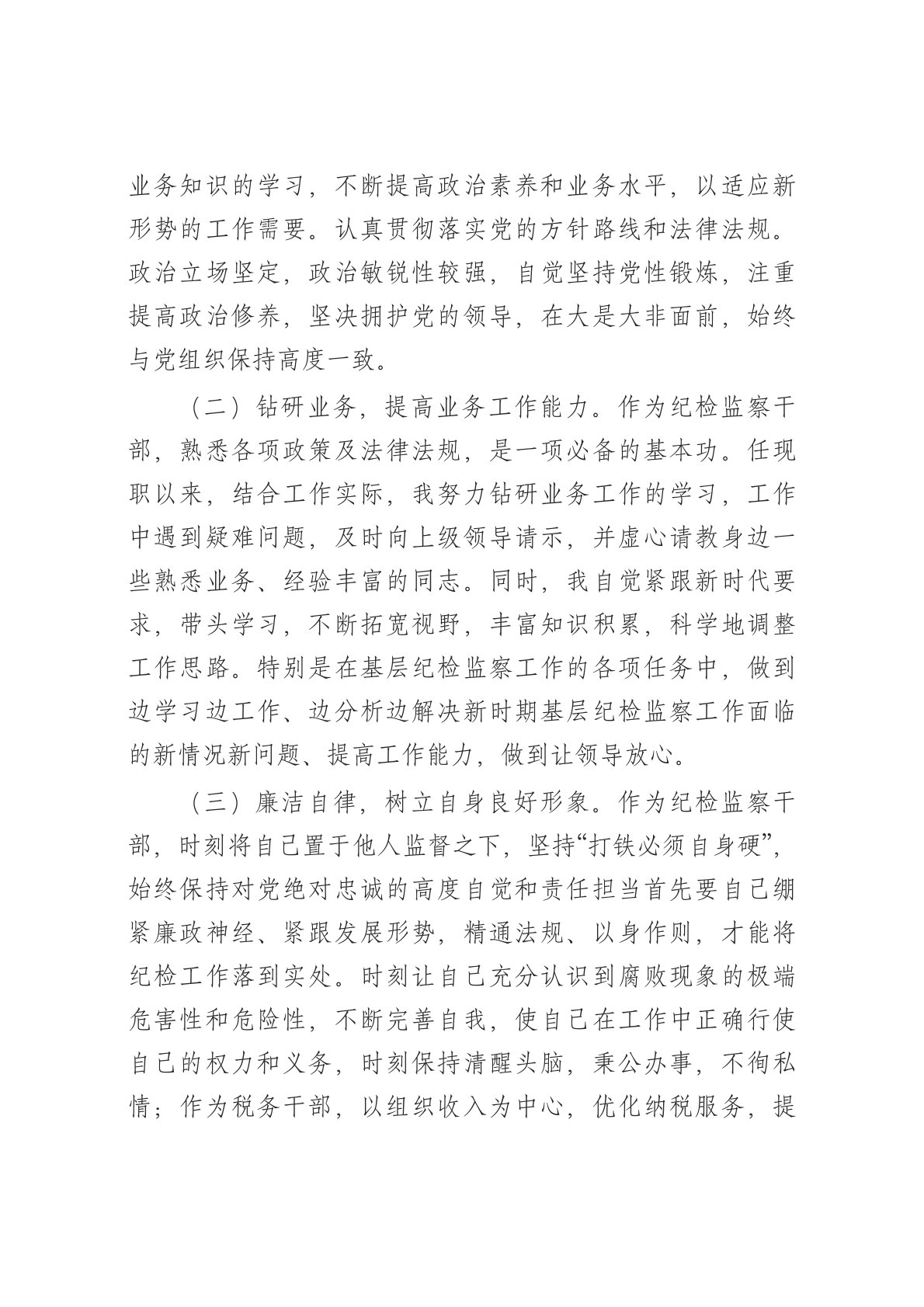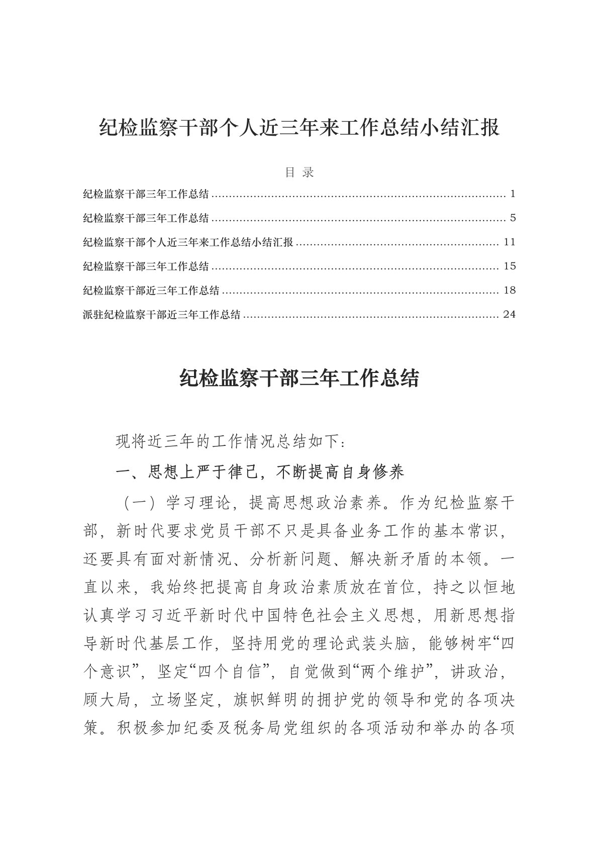 纪检监察干部个人近三年来工作总结小结汇报目录纪检监察干部三年工作总结现将近三年的工作情况总结如下:一、思想上严于律己,不断提高自身修养(一)学习理论,提高思想政治素养。作为纪检监察干部,新时代要求党员干部不只是具备业务工作的基本常识,还要具有面对新情况、分析新问题、解决新矛盾的本领。一直以来,我始终把提高自身政治素质放在首位,持之以恒地认真学习习近平新时代中国特色社会主义思想,用新思想指导新时代基层工作,坚持用党的理论武装头脑,能够树牢“四个意识”,坚定“四个自信”,自觉做到“两个维护”,讲政治,顾大局,立场坚定,旗帜鲜明的拥护党的领导和党的各项决策。积极参加纪委及税务局党组织的各项活动和举办的各项业务知识的学习,不断提高政治素养和业务水平,以适应新形势的工作需要。认真贯彻落实党的方针路线和...