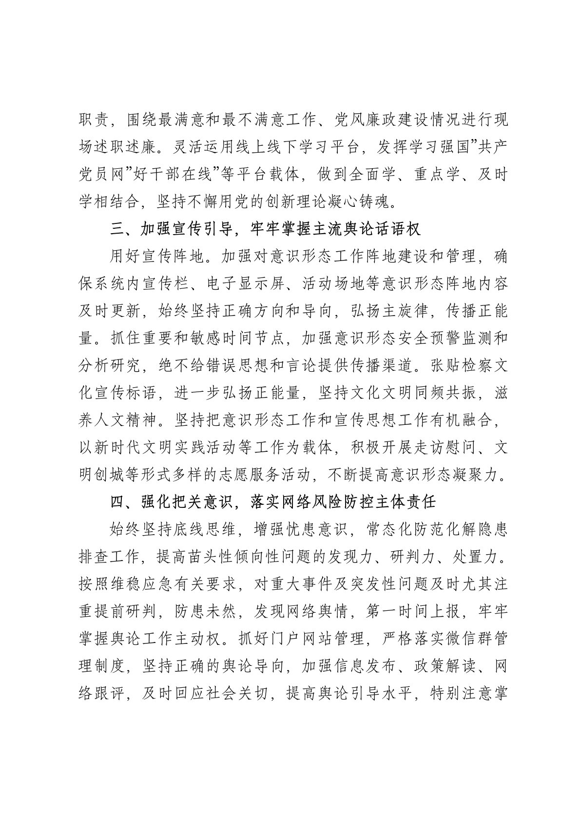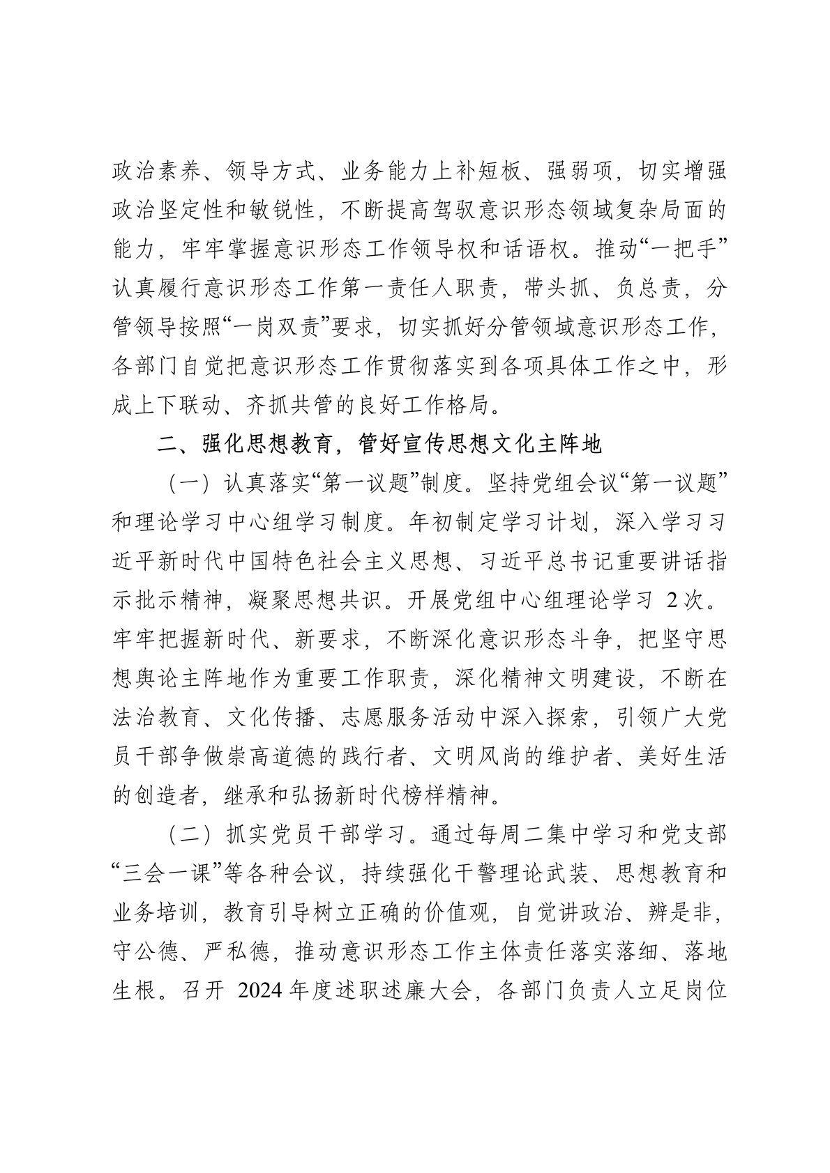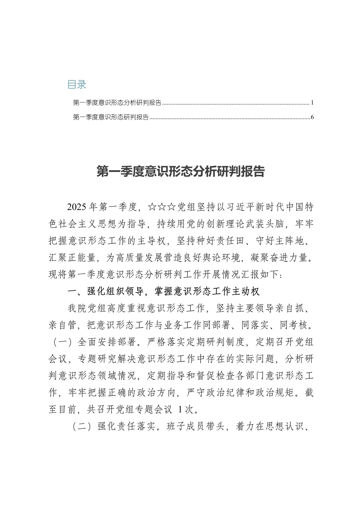 目录第一季度意识形态分析研判报告2025年第一季度,☆☆☆党组坚持以习近平新时代中国特色社会主义思想为指导,持续用党的创新理论武装头脑,牢牢把握意识形态工作的主导权,坚持种好责任田、守好主阵地、汇聚正能量,为高质量发展营造良好舆论环境,凝聚奋进力量。现将第一季度意识形态分析研判工作开展情况汇报如下:一、强化组织领导,掌握意识形态工作主动权我院党组高度重视意识形态工作,坚持主要领导亲自抓、亲自管,把意识形态工作与业务工作同部署、同落实、同考核。(一)全面安排部署。严格落实定期研判制度,定期召开党组会议,专题研究解决意识形态工作中存在的实际问题,分析研判意识形态领域情况,定期指导和督促检查各部门意识形态工作,牢牢把握正确的政治方向,严守政治纪律和政治规矩。截至目前,共召开党组专题会议1次。(二)...