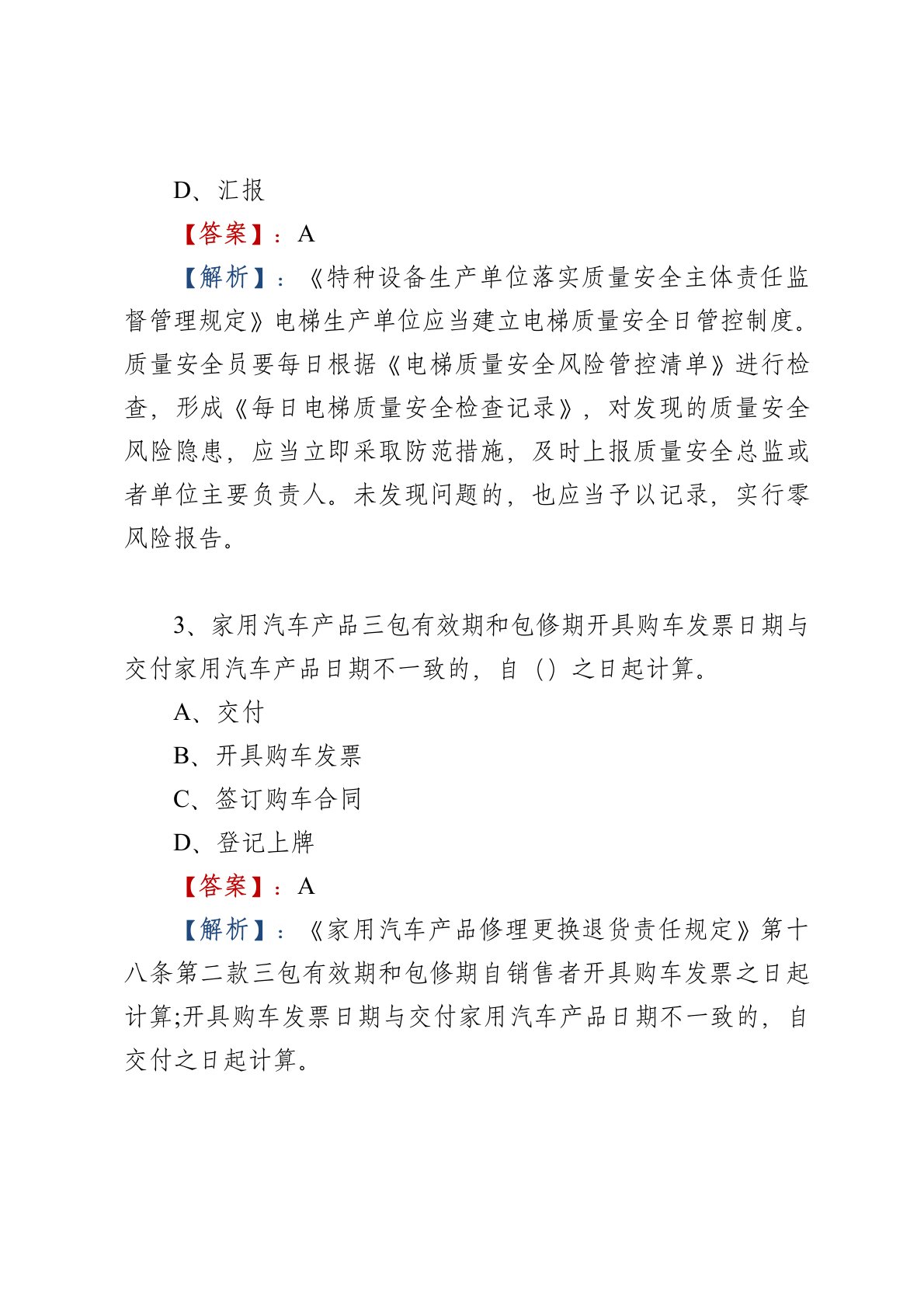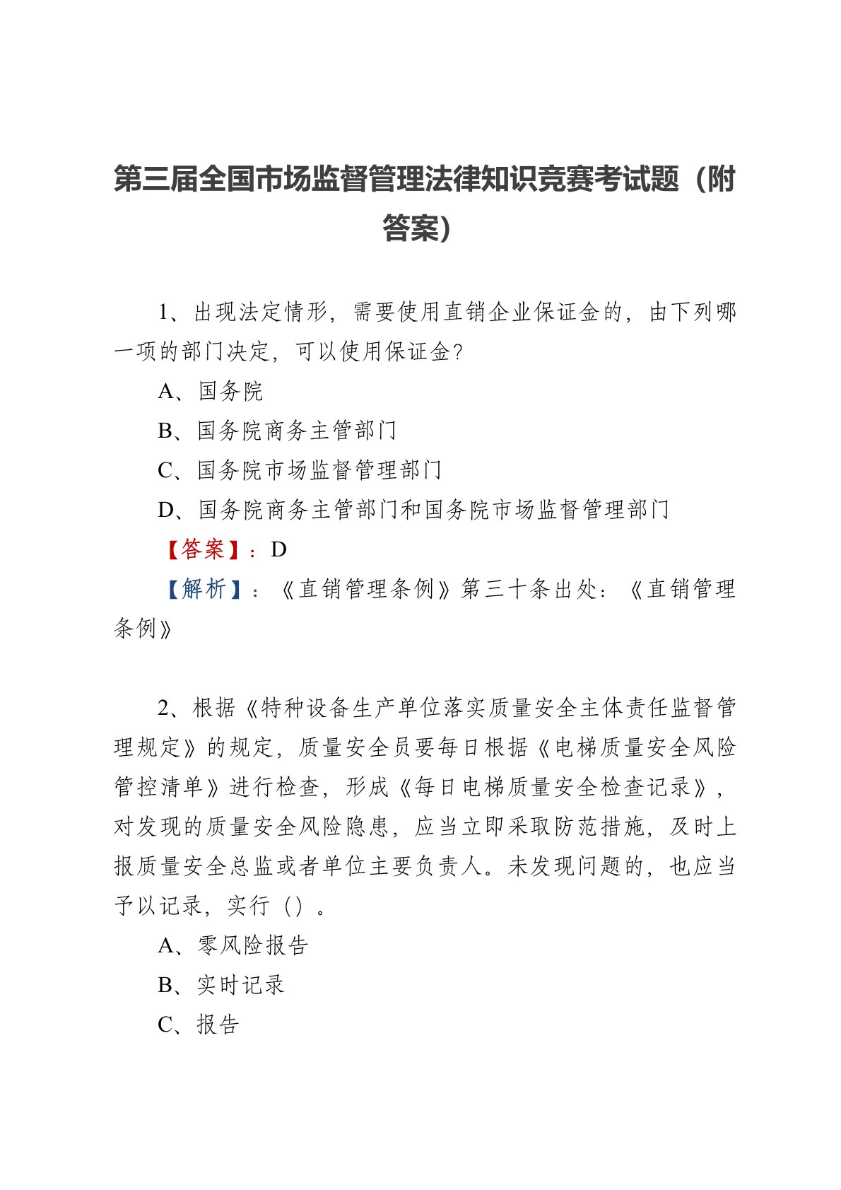 第三届全国市场监督管理法律知识竞赛考试题(附答案)1、出现法定情形,需要使用直销企业保证金的,由下列哪一项的部门决定,可以使用保证金?A、国务院B、国务院商务主管部门C、国务院市场监督管理部门D、国务院商务主管部门和国务院市场监督管理部门【答案】:D【解析】:《直销管理条例》第三十条出处:《直销管理条例》2、根据《特种设备生产单位落实质量安全主体责任监督管理规定》的规定,质量安全员要每日根据《电梯质量安全风险管控清单》进行检查,形成《每日电梯质量安全检查记录》,对发现的质量安全风险隐患,应当立即采取防范措施,及时上报质量安全总监或者单位主要负责人。未发现问题的,也应当予以记录,实行()。A、零风险报告B、实时记录C、报告D、汇报【答案】:A【解析】:《特种设备生产单位落实质量安全主体责任监督...