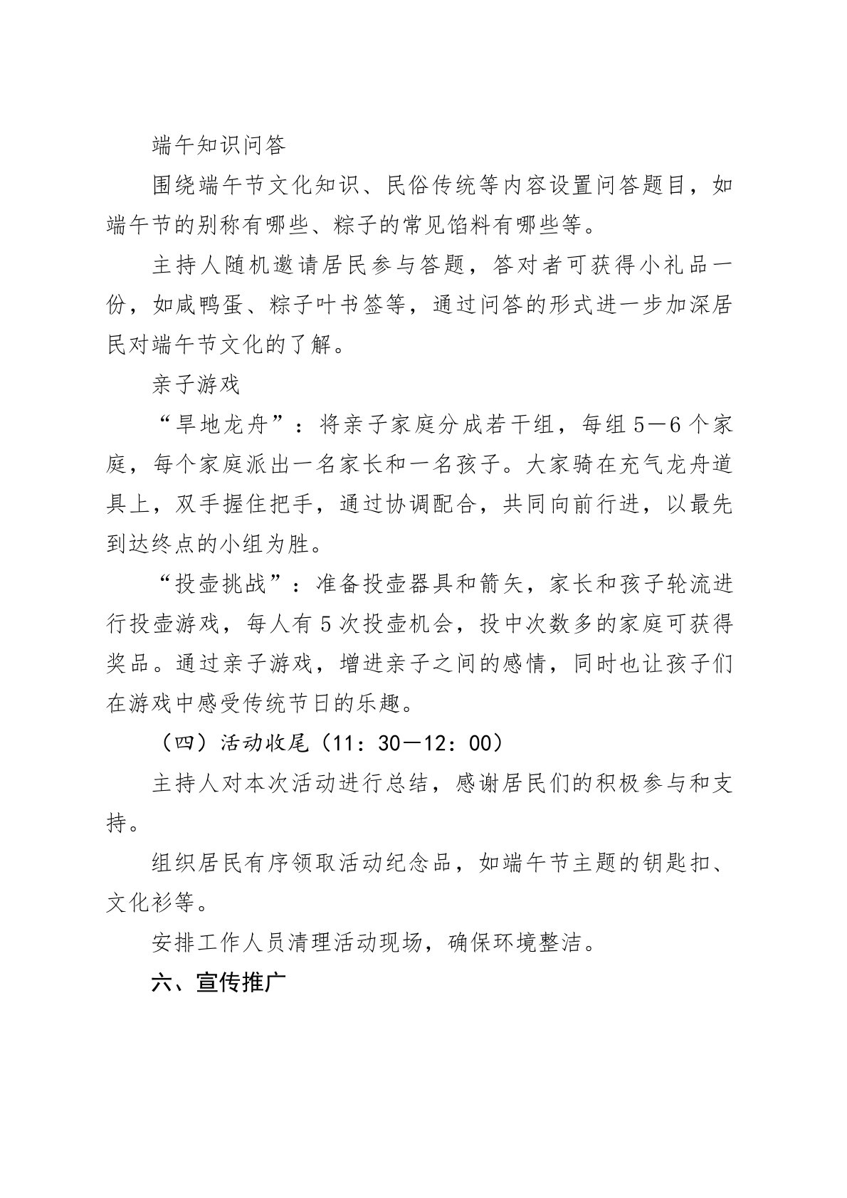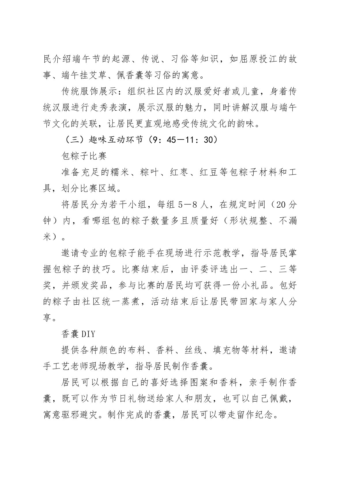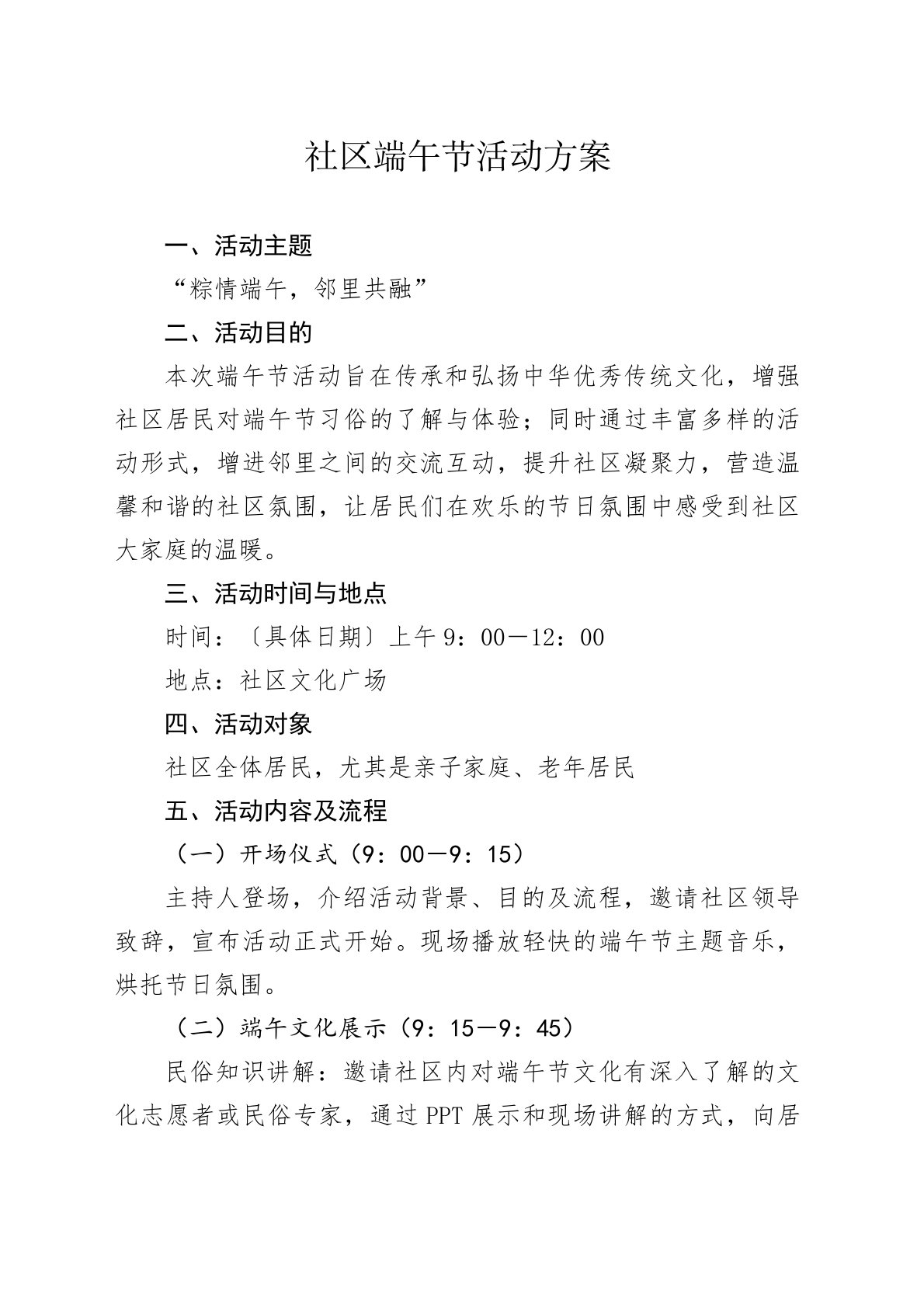 社区端午节活动方案一、活动主题“粽情端午,邻里共融”二、活动目的本次端午节活动旨在传承和弘扬中华优秀传统文化,增强社区居民对端午节习俗的了解与体验;同时通过丰富多样的活动形式,增进邻里之间的交流互动,提升社区凝聚力,营造温馨和谐的社区氛围,让居民们在欢乐的节日氛围中感受到社区大家庭的温暖。三、活动时间与地点时间:〔具体日期〕上午9:00-12:00地点:社区文化广场四、活动对象社区全体居民,尤其是亲子家庭、老年居民五、活动内容及流程(一)开场仪式(9:00-9:15)主持人登场,介绍活动背景、目的及流程,邀请社区领导致辞,宣布活动正式开始。现场播放轻快的端午节主题音乐,烘托节日氛围。(二)端午文化展示(9:15-9:45)民俗知识讲解:邀请社区内对端午节文化有深入了解的文化志愿者或民俗专家,...