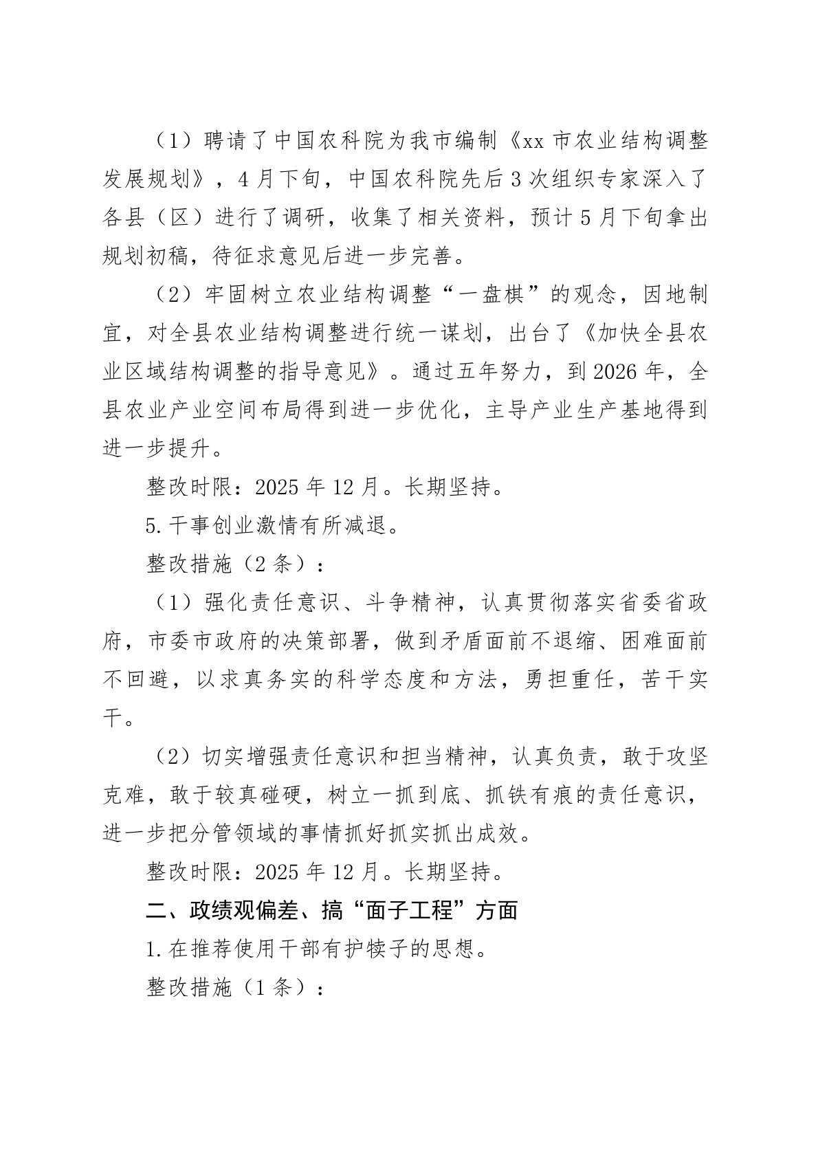 领导干部学习教育查摆问题清单及整改措施按照《关于深入开展中央八项规定精神学习教育的通知》要求,根据市委部署安排,本人聚焦“违反中央八项规定及其实施细则精神问题清单”,围绕“思想偏差、执行弱项、作风短板”三个维度开展自查自纠,全面梳理在贯彻落实中央八项规定精神中存在的政治敏感性不足、制度执行不严、联系群众不紧等突出问题,现结合实际制定整改清单,以刀刃向内的决心推动问题真改实改,切实筑牢拒腐防变的思想防线和制度防线。一、不担当不作为、推诿扯皮方面1.发展文旅产业效益不够明显,投入与产出不匹配问题需要解决。整改措施(3条):(1)加大招商力度。实施“引进来”发展战略,开展大招商、招大商活动,鼓励和吸引国内外战略投资商投资旅游企业;通过双返双创等活动,吸引多元化市场主体以及有情怀、有资本、有技术、有...