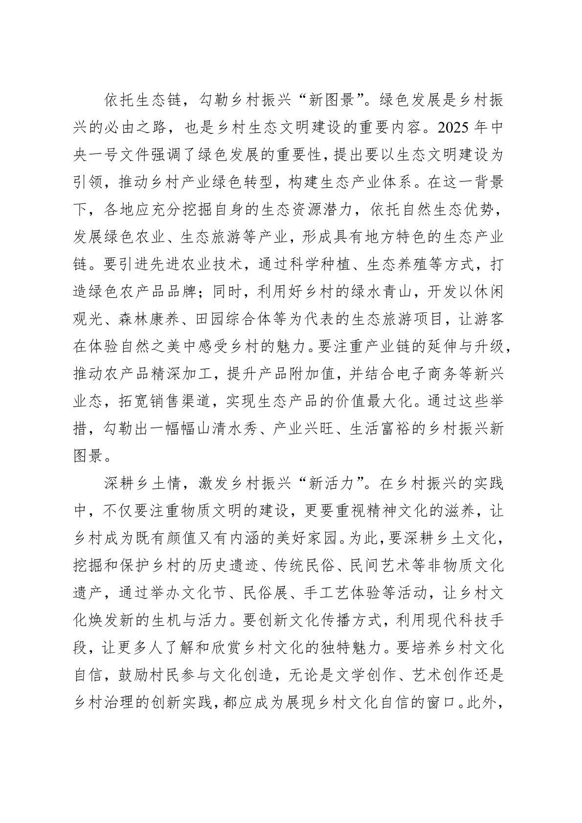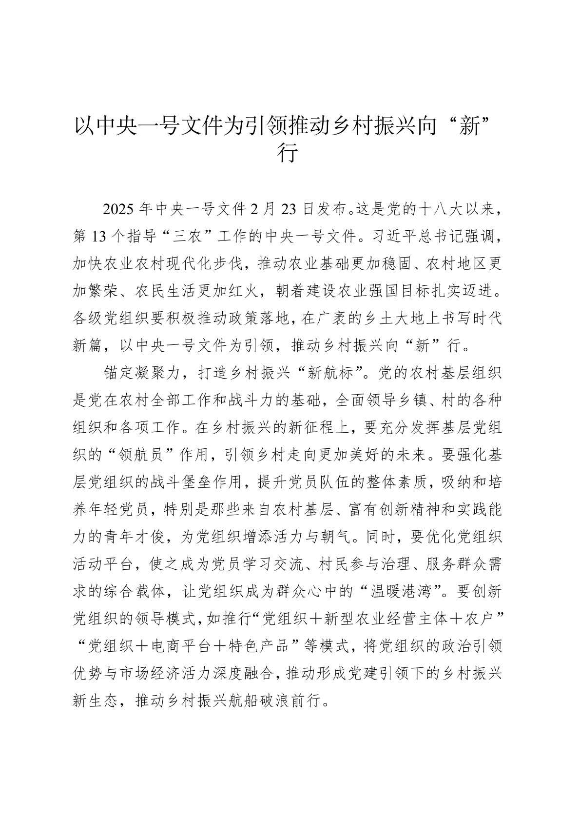 2025年中央一号文件2月23日发布。这是党的十八大以来,第13个指导“三农”工作的中央一号文件。习近平总书记强调,加快农业农村现代化步伐,推动农业基础更加稳固、农村地区更加繁荣、农民生活更加红火,朝着建设农业强国目标扎实迈进。各级党组织要积极推动政策落地,在广袤的乡土大地上书写时代新篇,以中央一号文件为引领,推动乡村振兴向“新”行。锚定凝聚力,打造乡村振兴“新航标”。党的农村基层组织是党在农村全部工作和战斗力的基础,全面领导乡镇、村的各种组织和各项工作。在乡村振兴的新征程上,要充分发挥基层党组织的“领航员”作用,引领乡村走向更加美好的未来。要强化基层党组织的战斗堡垒作用,提升党员队伍的整体素质,吸纳和培养年轻党员,特别是那些来自农村基层、富有创新精神和实践能力的青年才俊,为党组织增添活力与...