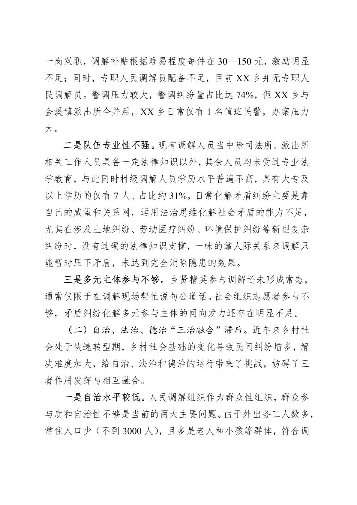党的二十大报告指出,在社会基层坚持和发展新时代“枫桥经验”,完善正确处理新形势下人民内部矛盾机制,加强和改进人民**工作,畅通和规范群众诉求表达、利益协调、权益保障通道,完善网格化管理、精细化服务、信息化支撑的基层治理平台,健全城乡社区治理体系,及时把矛盾纠纷化解在基层、化解在萌芽状态。做好基层矛盾纠纷排查化解工作,是全面贯彻落实党的二十大精神和习近平总书记关于践行和发展新时代“枫桥经验”重要讲话精神的重要举措,对于推动化解新时代农村社会矛盾,确保农村社会稳定有序具有十分重要的意义。笔者以XX乡为例,通过实地走访、查阅卷宗及相关资料进行了专题调研,形成本报告。一、基本现状随着农村经济社会的发展和农民生活水平的提高,基层矛盾纠纷逐渐复杂化,出现征地拆迁、社会保障、合同纠纷等以经济利益诉求为主要...