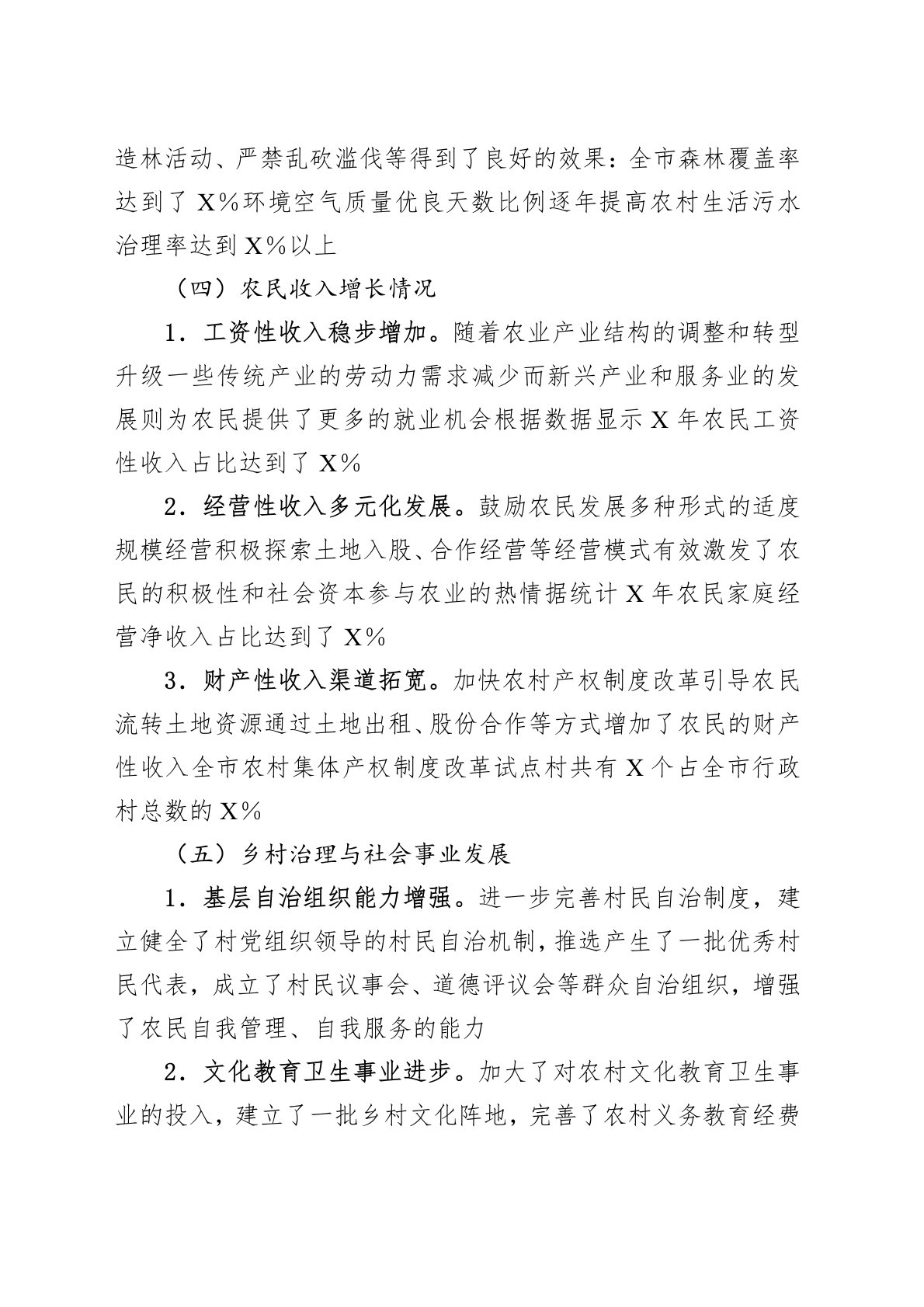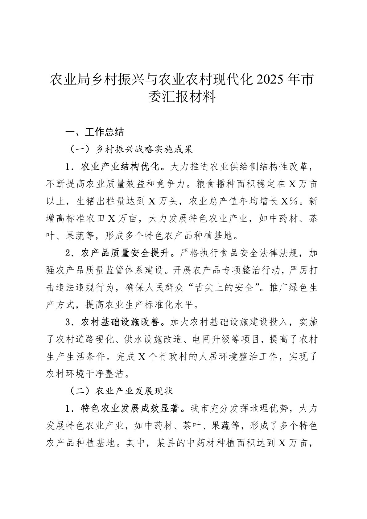 一、工作总结(一)乡村振兴战略实施成果1.农业产业结构优化。大力推进农业供给侧结构性改革,不断提高农业质量效益和竞争力。粮食播种面积稳定在X万亩以上,生猪出栏量达到X万头,农业总产值年均增长X%。新增高标准农田X万亩,大力发展特色农业产业,如中药材、茶叶、果蔬等,形成多个特色农产品种植基地。2.农产品质量安全提升。严格执行食品安全法律法规,加强农产品质量监管体系建设。开展农产品专项整治行动,严厉打击违法违规行为,确保人民群众“舌尖上的安全”。推广绿色生产方式,提高农业生产标准化水平。3.农村基础设施改善。加大农村基础设施建设投入,实施了农村道路硬化、供水设施改造、电网升级等项目,提高了农村生产生活条件。完成X个行政村的人居环境整治工作,实现了农村环境干净整洁。(二)农业产业发展现状1.特色农...