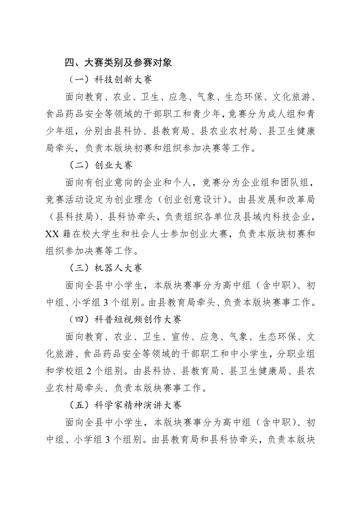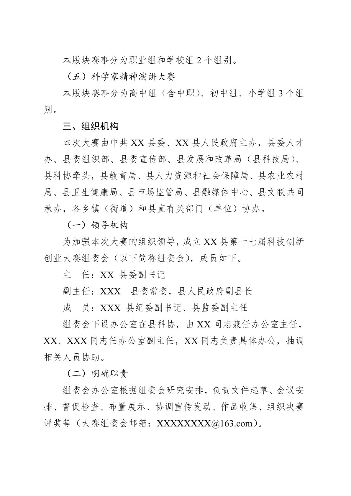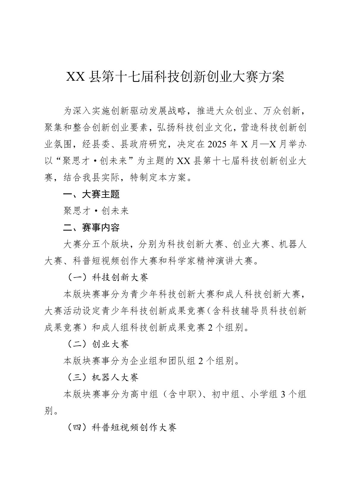 为深入实施创新驱动发展战略,推进大众创业、万众创新,聚集和整合创新创业要素,弘扬科技创业文化,营造科技创新创业氛围,经县委、县政府研究,决定在2025年X月—X月举办以“聚思才·创未来”为主题的XX县第十七届科技创新创业大赛,结合我县实际,特制定本方案。一、大赛主题聚思才·创未来二、赛事内容大赛分五个版块,分别为科技创新大赛、创业大赛、机器人大赛、科普短视频创作大赛和科学家精神演讲大赛。(一)科技创新大赛本版块赛事分为青少年科技创新大赛和成人科技创新大赛,大赛活动设定青少年科技创新成果竞赛(含科技辅导员科技创新成果竞赛)和成人组科技创新成果竞赛2个组别。(二)创业大赛本版块赛事分为企业组和团队组2个组别。(三)机器人大赛本版块赛事分为高中组(含中职)、初中组、小学组3个组别。(四)科普短视频...