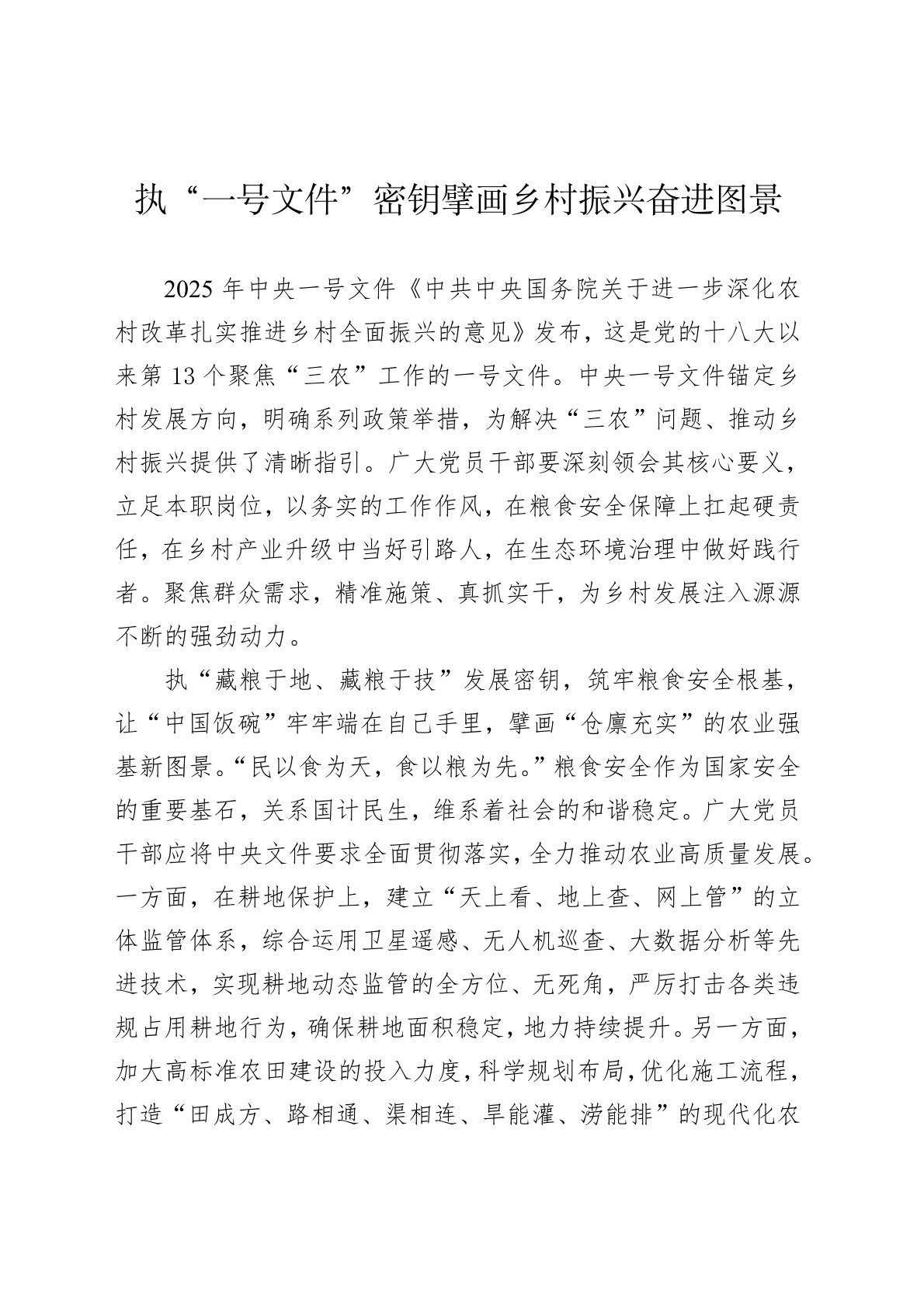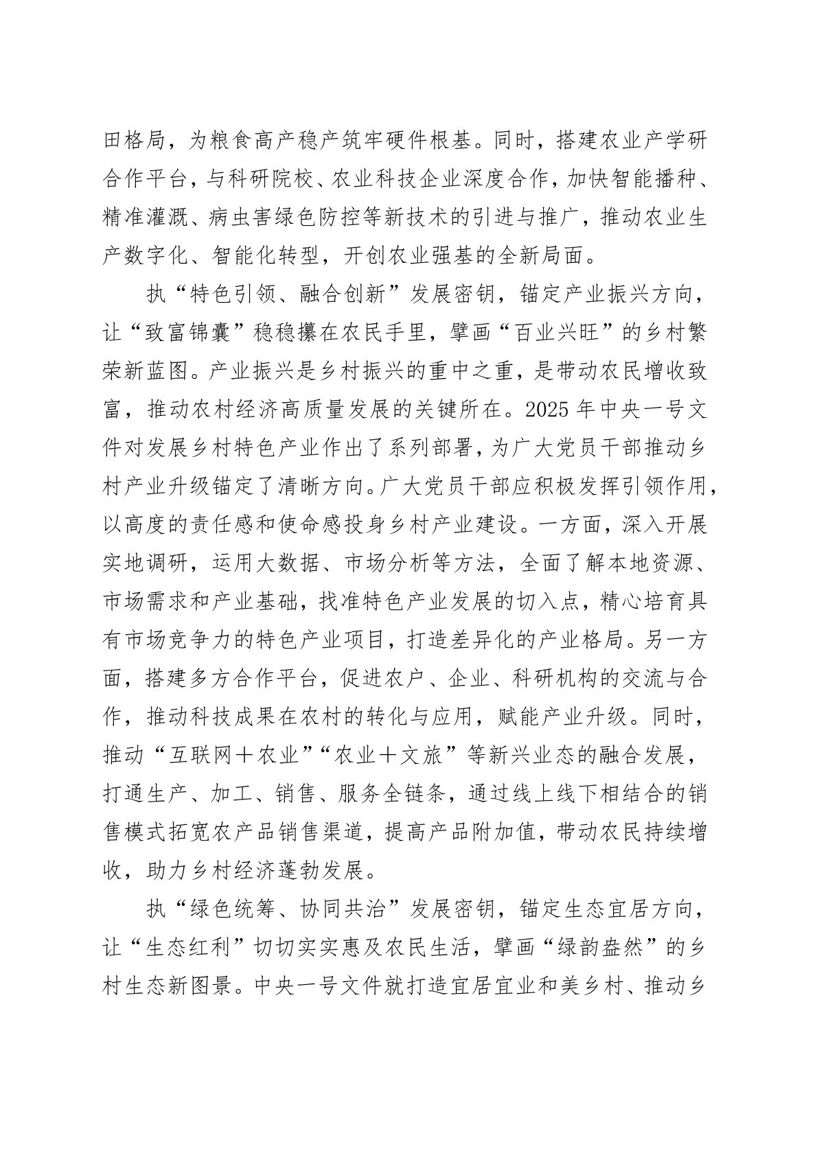 2025年中央一号文件《中共中央国务院关于进一步深化农村改革扎实推进乡村全面振兴的意见》发布,这是党的十八大以来第13个聚焦“三农”工作的一号文件。中央一号文件锚定乡村发展方向,明确系列政策举措,为解决“三农”问题、推动乡村振兴提供了清晰指引。广大党员干部要深刻领会其核心要义,立足本职岗位,以务实的工作作风,在粮食安全保障上扛起硬责任,在乡村产业升级中当好引路人,在生态环境治理中做好践行者。聚焦群众需求,精准施策、真抓实干,为乡村发展注入源源不断的强劲动力。执“藏粮于地、藏粮于技”发展密钥,筑牢粮食安全根基,让“中国饭碗”牢牢端在自己手里,擘画“仓廪充实”的农业强基新图景。“民以食为天,食以粮为先。”粮食安全作为国家安全的重要基石,关系国计民生,维系着社会的和谐稳定。广大党员干部应将中央文件...