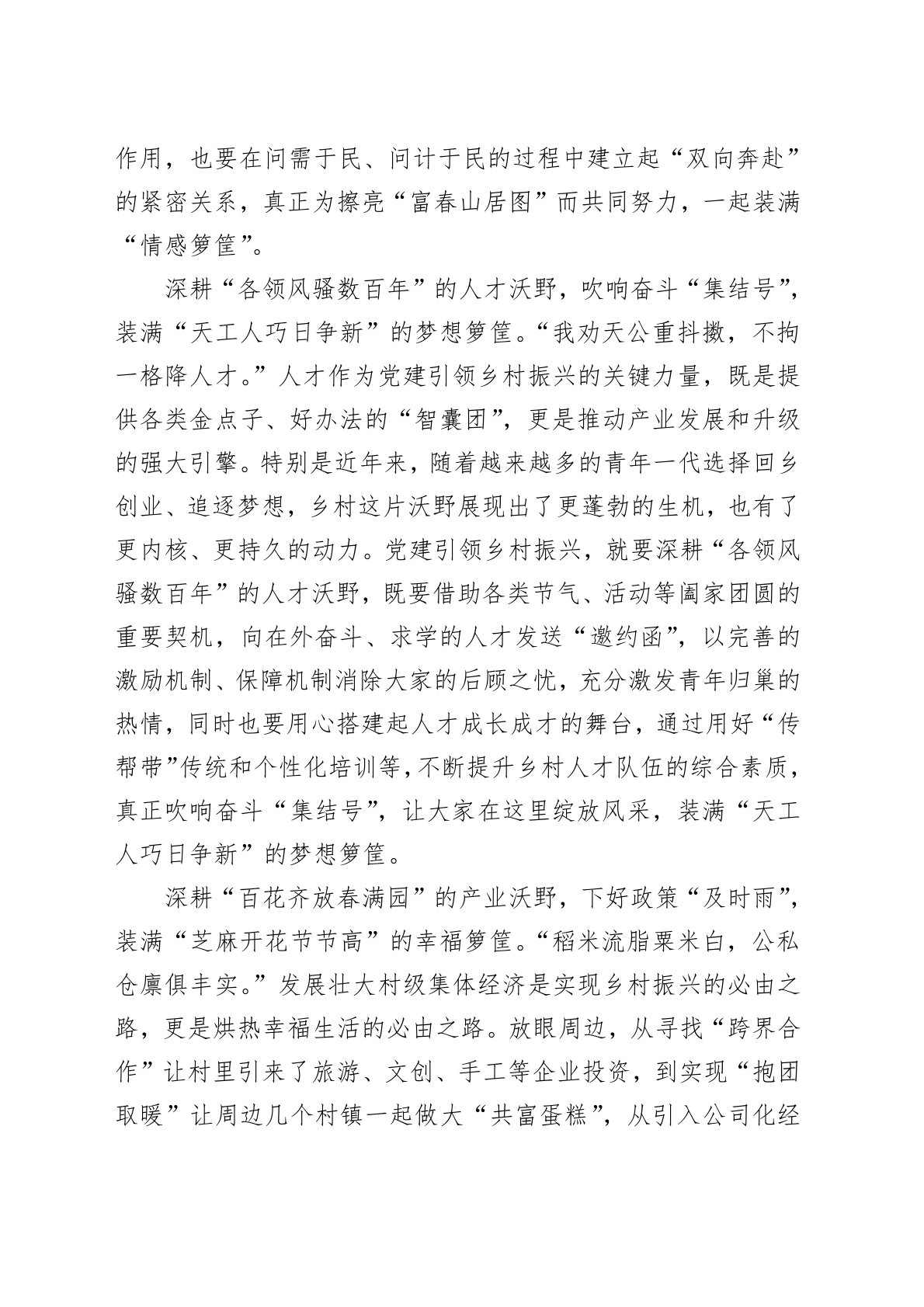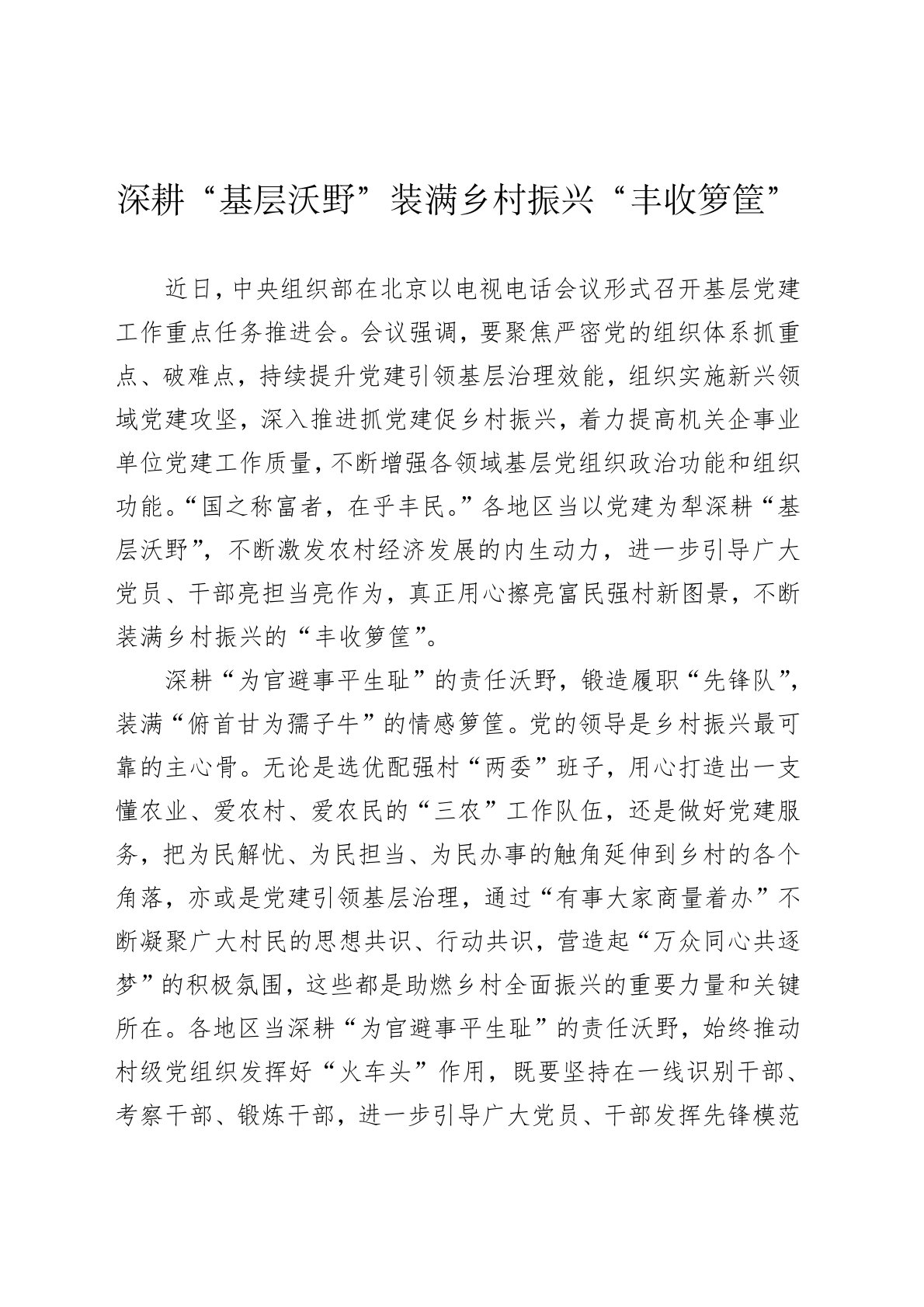 近日,中央组织部在北京以电视电话会议形式召开基层党建工作重点任务推进会。会议强调,要聚焦严密党的组织体系抓重点、破难点,持续提升党建引领基层治理效能,组织实施新兴领域党建攻坚,深入推进抓党建促乡村振兴,着力提高机关企事业单位党建工作质量,不断增强各领域基层党组织政治功能和组织功能。“国之称富者,在乎丰民。”各地区当以党建为犁深耕“基层沃野”,不断激发农村经济发展的内生动力,进一步引导广大党员、干部亮担当亮作为,真正用心擦亮富民强村新图景,不断装满乡村振兴的“丰收箩筐”。深耕“为官避事平生耻”的责任沃野,锻造履职“先锋队”,装满“俯首甘为孺子牛”的情感箩筐。党的领导是乡村振兴最可靠的主心骨。无论是选优配强村“两委”班子,用心打造出一支懂农业、爱农村、爱农民的“三农”工作队伍,还是做好党建服务,...