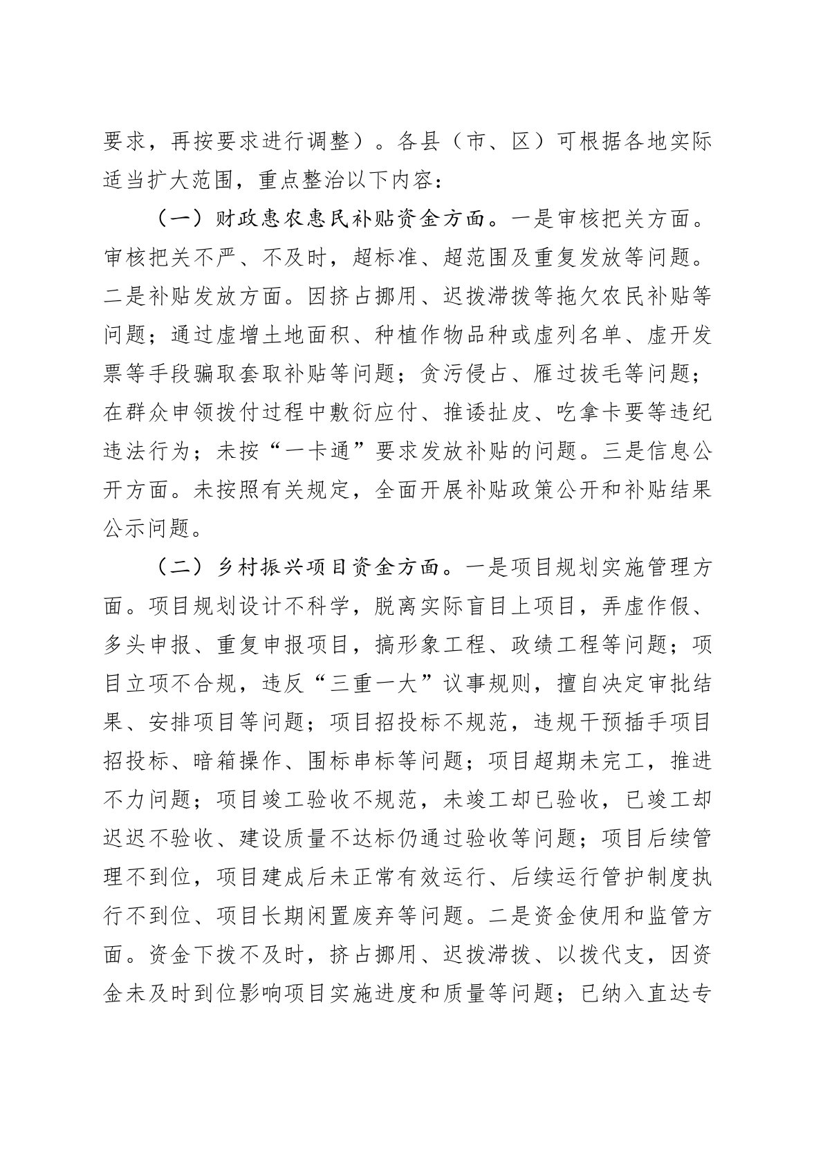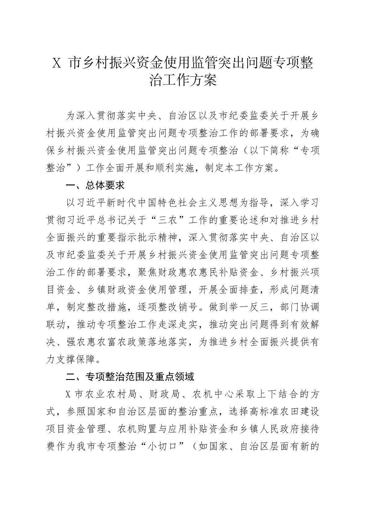 X市乡村振兴资金使用监管突出问题专项整治工作方案为深入贯彻落实中央、自治区以及市纪委监委关于开展乡村振兴资金使用监管突出问题专项整治工作的部署要求,为确保乡村振兴资金使用监管突出问题专项整治(以下简称“专项整治”)工作全面开展和顺利实施,制定本工作方案。一、总体要求以习近平新时代中国特色社会主义思想为指导,深入学习贯彻习近平总书记关于“三农”工作的重要论述和对推进乡村全面振兴的重要指示批示精神,深入贯彻落实中央、自治区以及市纪委监委关于开展乡村振兴资金使用监管突出问题专项整治工作的部署要求,聚焦财政惠农惠民补贴资金、乡村振兴项目资金、乡镇财政资金使用管理,开展全面排查,形成问题清单,制定整改措施,逐项整改销号。做到举一反三,部门协调联动,推动专项整治工作走深走实,推动突出问题得到有效解决、强...