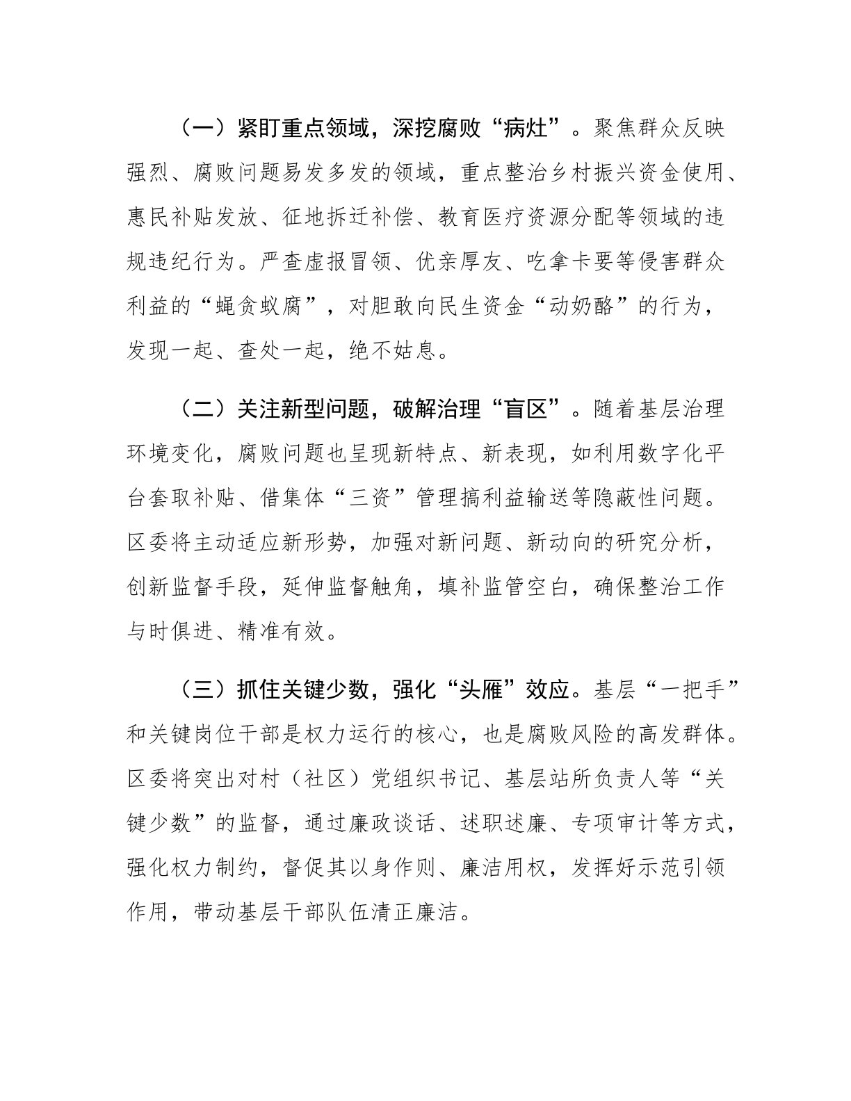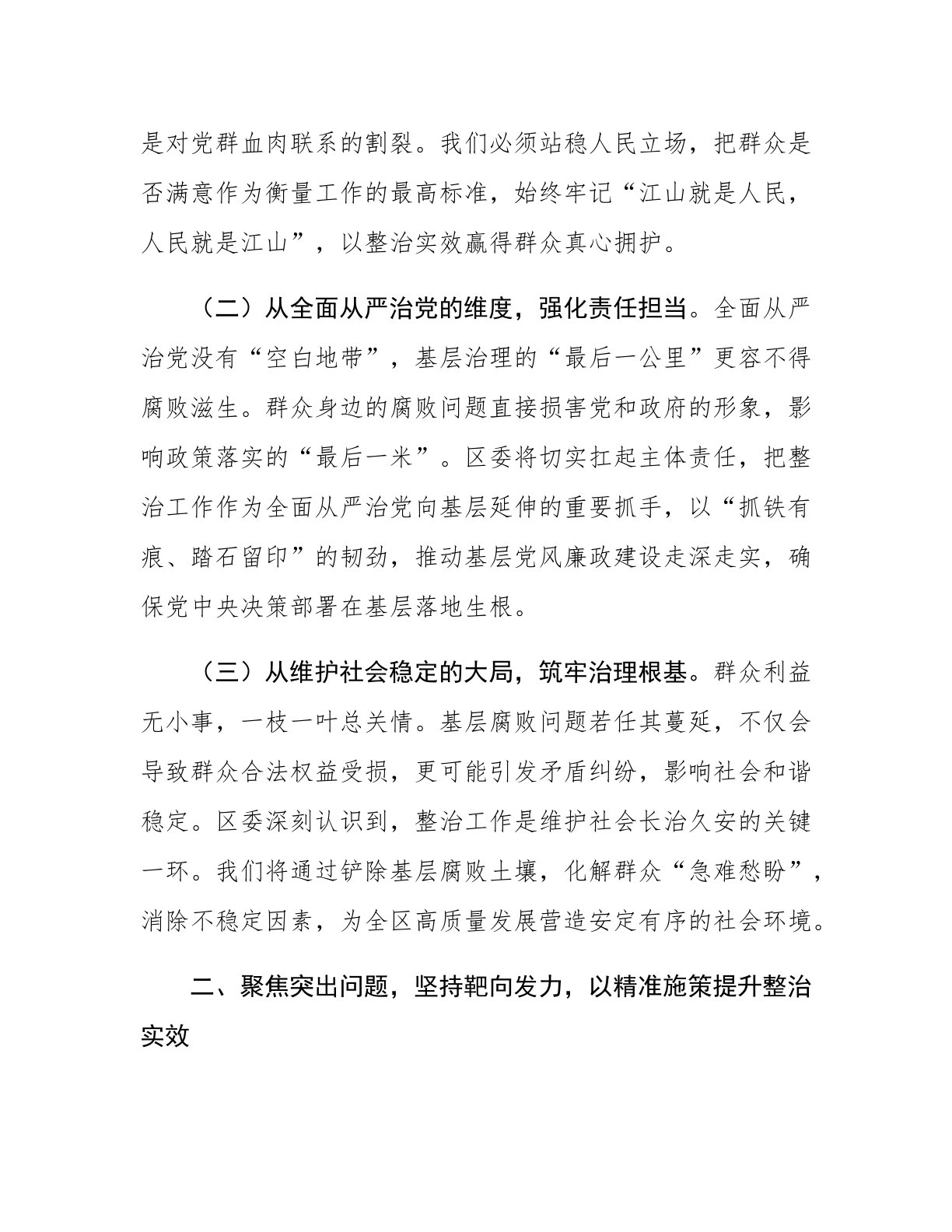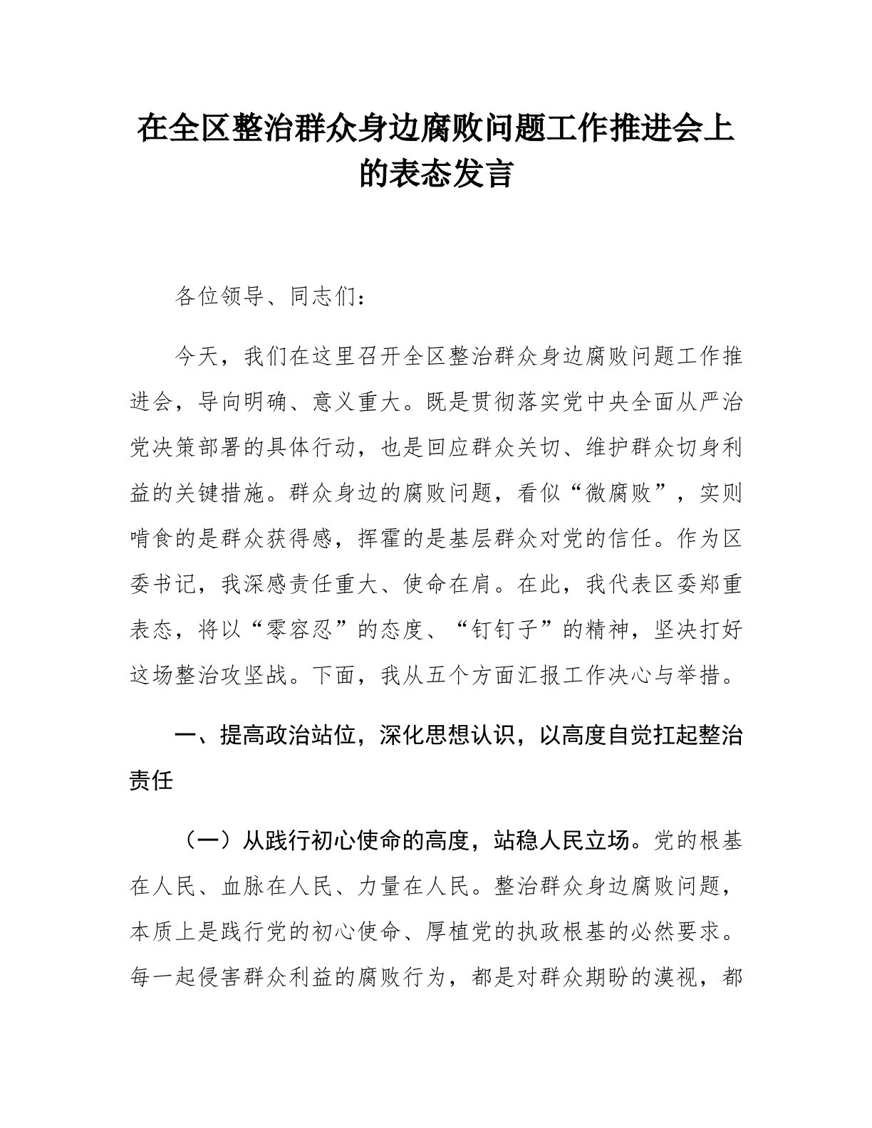 在全区整治群众身边腐败问题工作推进会上的表态发言各位领导、同志们:今天,我们在这里召开全区整治群众身边腐败问题工作推进会,导向明确、意义重大。既是贯彻落实党中央全面从严治党决策部署的具体行动,也是回应群众关切、维护群众切身利益的关键措施。群众身边的腐败问题,看似“微腐败”,实则啃食的是群众获得感,挥霍的是基层群众对党的信任。作为区委书记,我深感责任重大、使命在肩。在此,我代表区委郑重表态,将以“零容忍”的态度、“钉钉子”的精神,坚决打好这场整治攻坚战。下面,我从五个方面汇报工作决心与举措。一、提高政治站位,深化思想认识,以高度自觉扛起整治责任(一)从践行初心使命的高度,站稳人民立场。党的根基在人民、血脉在人民、力量在人民。整治群众身边腐败问题,本质上是践行党的初心使命、厚植党的执政根基的必然...