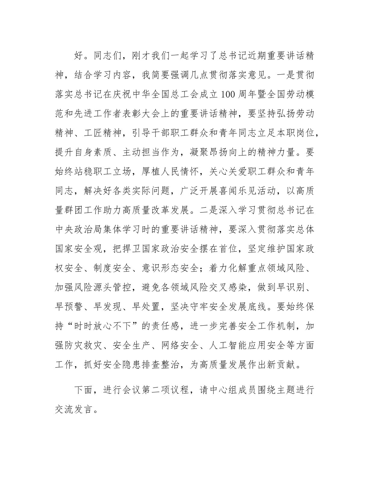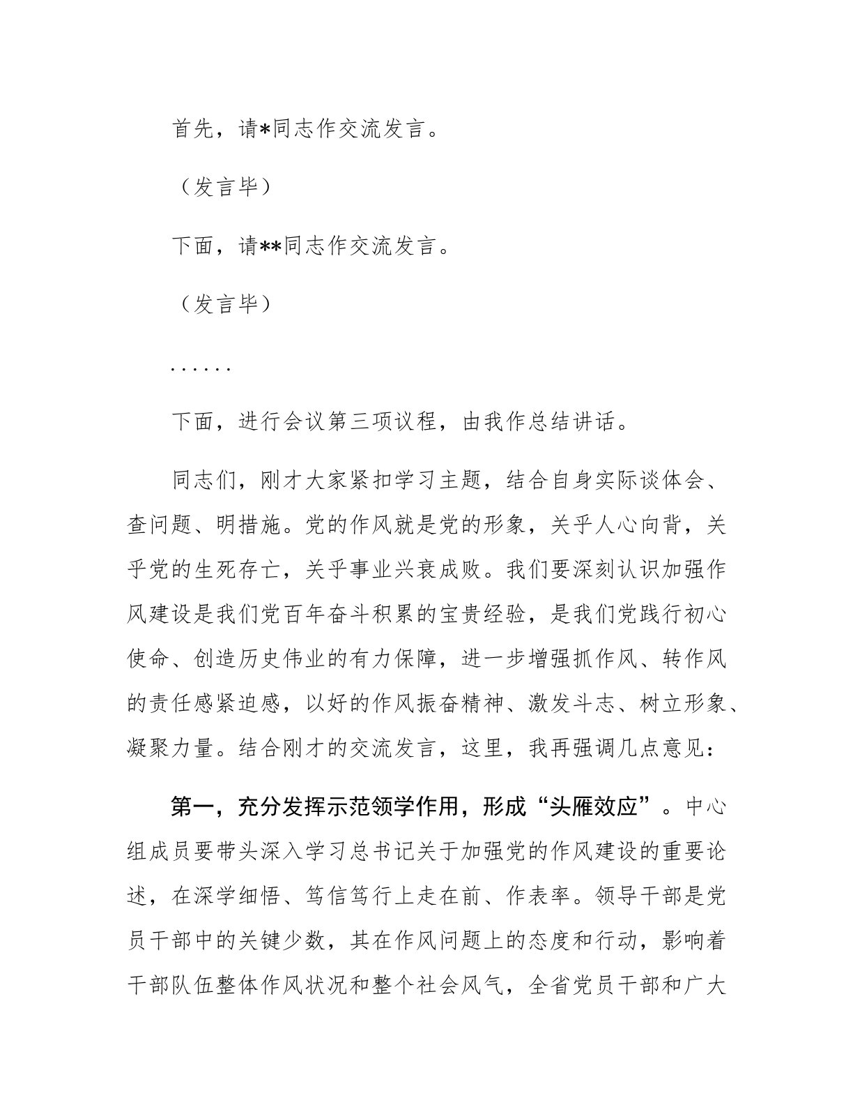 党委理论学习中心组5月份集体学习会议主持词同志们:根据党委理论学习中心组集体学习安排,今天组织召开2025年5月份集体学习会议。本次集体学习的主题是,深入学习总书记关于加强党的作风建设的重要论述,切实提高政治站位、提升党性修养、锤炼优良作风,更好守严防线、守牢底线,以优良作风干出过硬业绩。本次会议共有三项议程,一是组织开展集体学习;二是中心组成员围绕主题进行交流发言;三是总结讲话。下面,会议依次进行。首先,进行会议第一项议程,组织开展集体学习。请*同志领学总书记在庆祝中华全国总工会成立100周年暨全国劳动模范和先进工作者表彰大会上的重要讲话、在中共中央政治局第二十次集体学习时的重要讲话精神等内容。(学习毕)好。同志们,刚才我们一起学习了总书记近期重要讲话精神,结合学习内容,我简要强调几点贯彻...