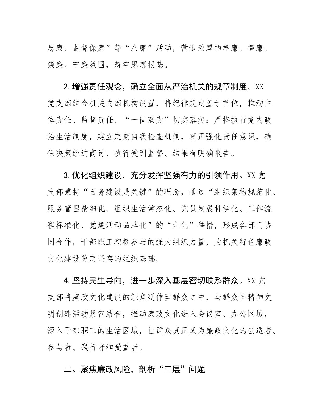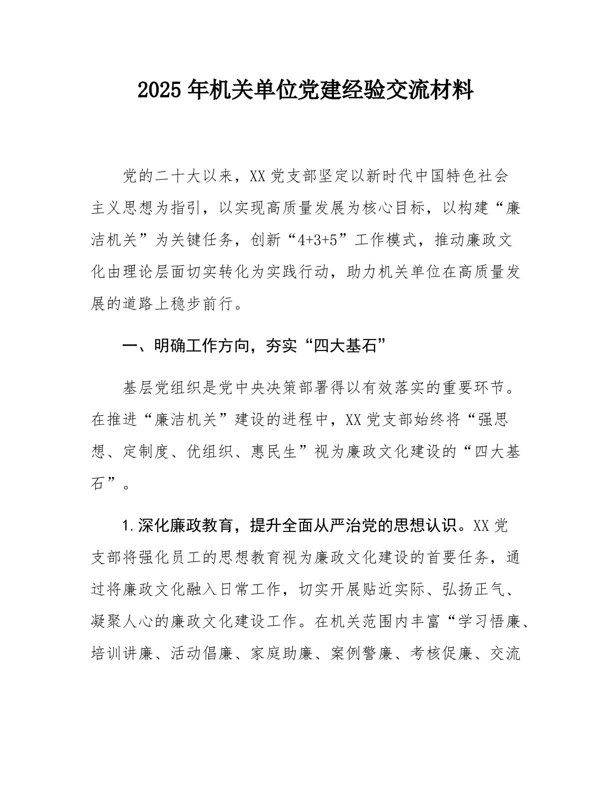 2025年机关单位党建经验交流材料党的二十大以来,XX党支部坚定以新时代中国特色社会主义思想为指引,以实现高质量发展为核心目标,以构建“廉洁机关”为关键任务,创新“4+3+5”工作模式,推动廉政文化由理论层面切实转化为实践行动,助力机关单位在高质量发展的道路上稳步前行。一、明确工作方向,夯实“四大基石”基层党组织是党中央决策部署得以有效落实的重要环节。在推进“廉洁机关”建设的进程中,XX党支部始终将“强思想、定制度、优组织、惠民生”视为廉政文化建设的“四大基石”。1.深化廉政教育,提升全面从严治党的思想认识。XX党支部将强化员工的思想教育视为廉政文化建设的首要任务,通过将廉政文化融入日常工作,切实开展贴近实际、弘扬正气、凝聚人心的廉政文化建设工作。在机关范围内丰富“学习悟廉、培训讲廉、活动倡...